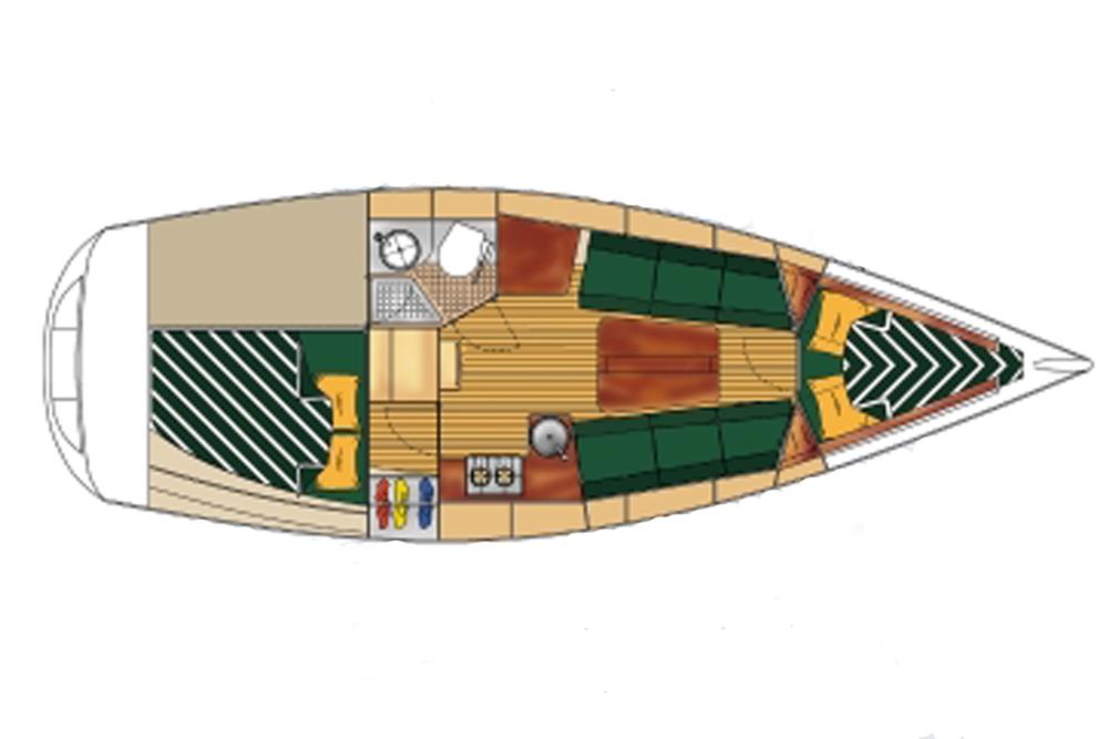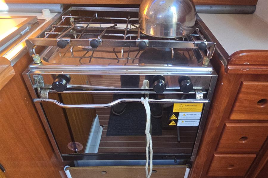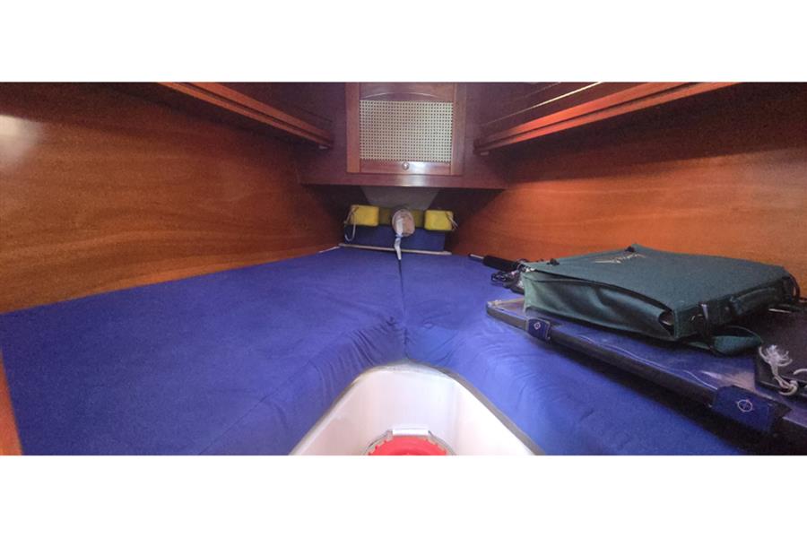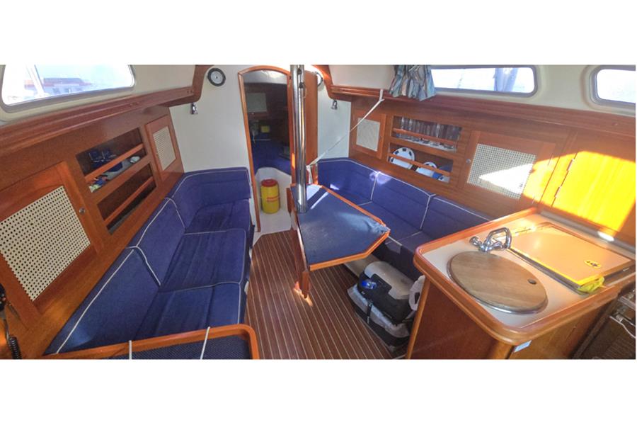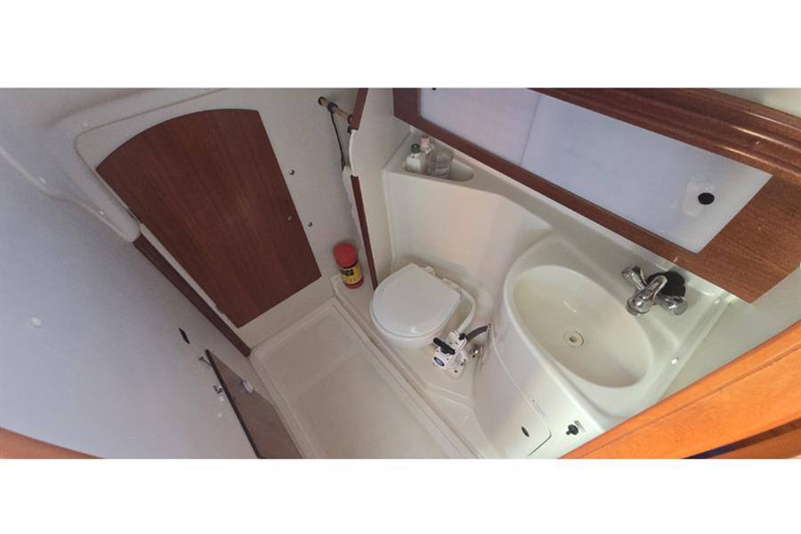 There are six berths across two cabins. Forward is the V-berth with room for two adults and plenty of well thought out stowage. The saloon has two settee berths with lee cloths and a central dining table with folding leaves. There is an L-shaped galley to port that is equipped with a stainless steel sink, refrigerator and two burner gas stove with oven. To port is the chart table. Aft of the chart table is the heads, there is a manual Jabsco sea toilet and wash basin with hot and cold mixer tap with detachable shower head. Through the heads is access to the large lazarette, the majority of the boats systems are housed in here so ease of access is welcomed. There is hot and cold pressurised water throughout, heated by calorifier and immersion heater. She has approximately 100l of fresh water capacity.