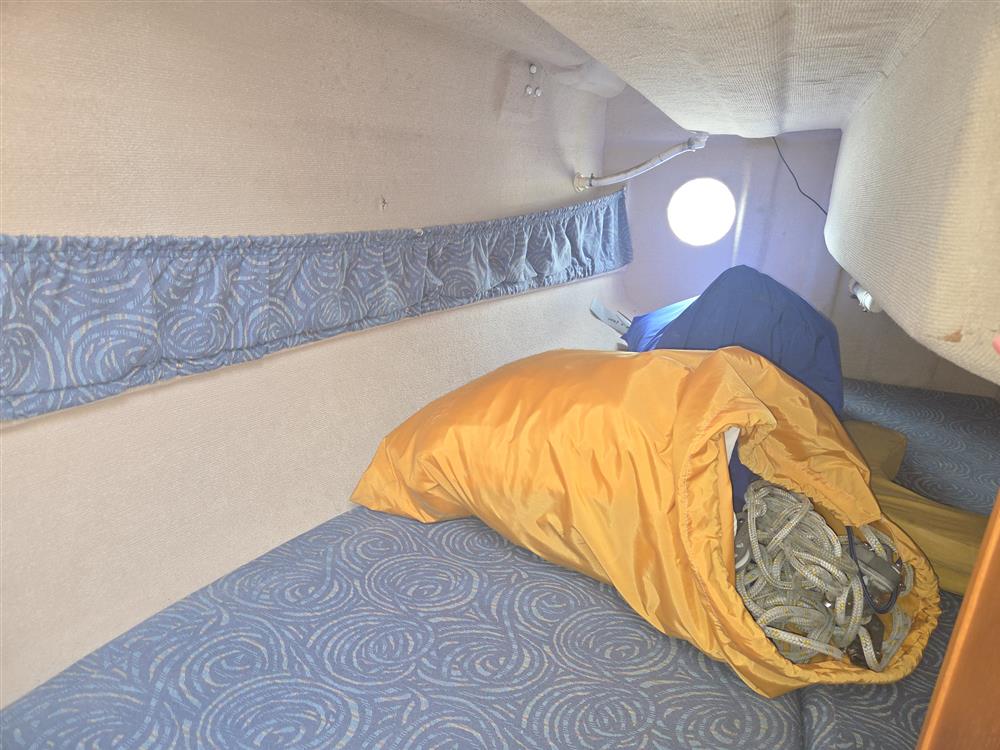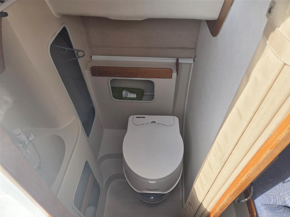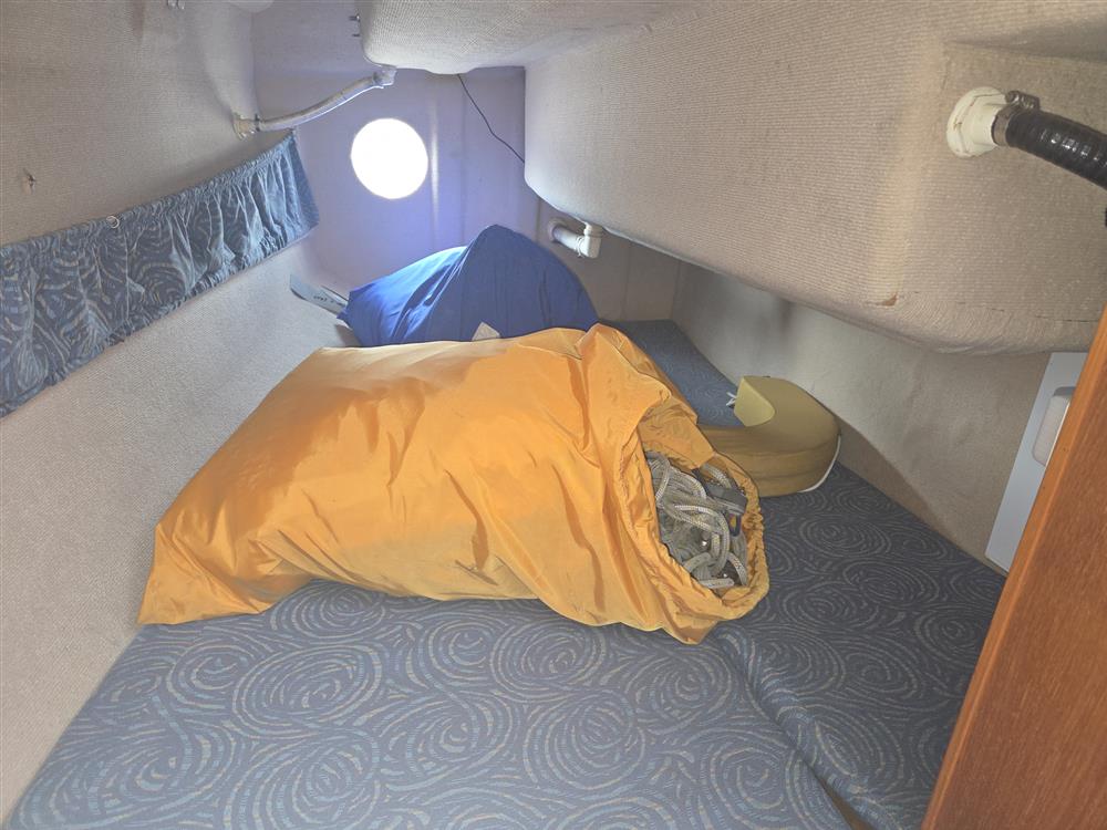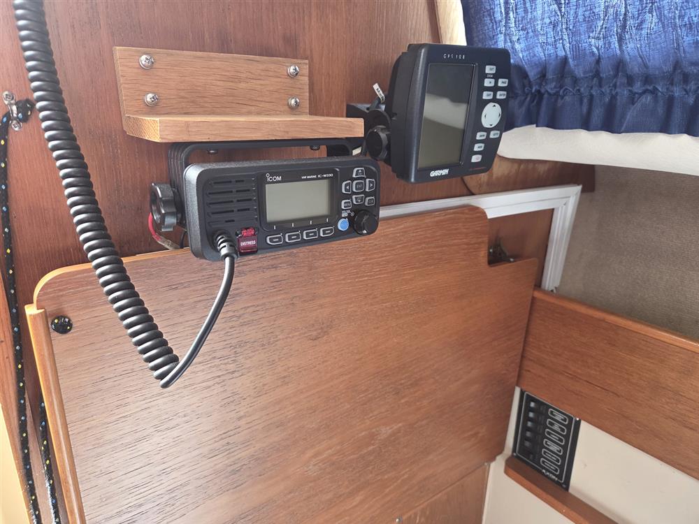 Large open plan accommodation offers up to six berths in single cabin with standing headroom. Double berth forward. U-shaped settee around the saloon table with one folding leaf. Folding chart table to port 12v switch panel. Heads compartment aft to port with moulded wash basin and Thetford Porta Potti chemical toilet. There are skin fittings for a marine toilet. Galley to starboard with stainless steel sink and Plastimo Neptune 2000 two burner gas stove with grill and oven. Insulated cool box. Large double berth aft to starboard. Hand pumped cold freshwater supply to galley sink and heads basin. Mikuni diesel fired central heating. Blue upholstery and blue curtains.