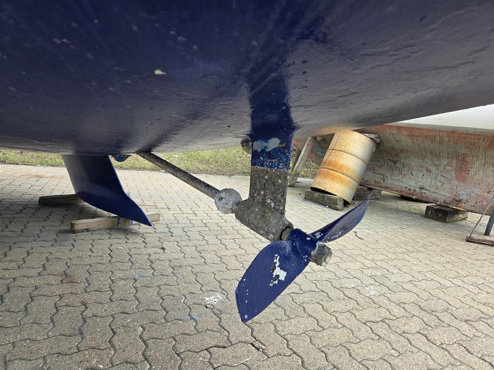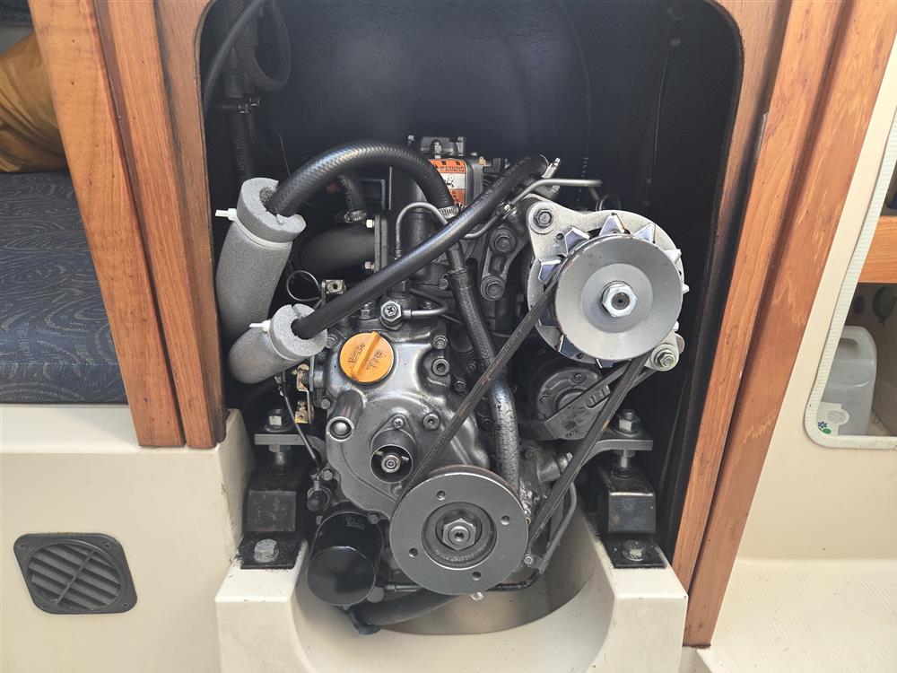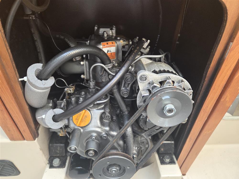 Original Yanmar 1GM10, single cylinder, 9hp marine diesel engine. Raw water cooled. Shaft drive via P-bracket to two blade fixed propeller. Electric start. Single lever Morse controls. Plastic fuel tank. Engine serviced October 2025.
