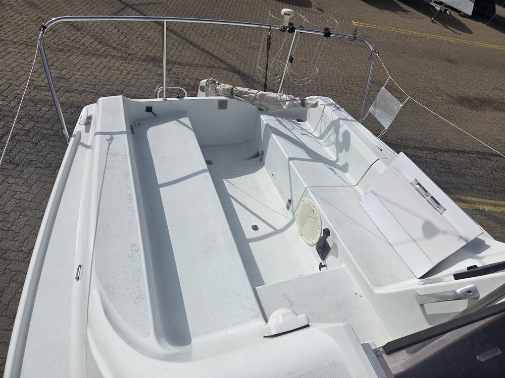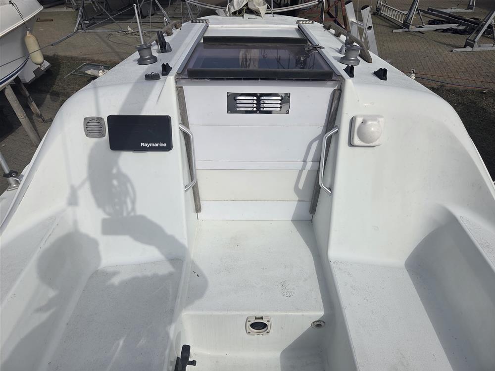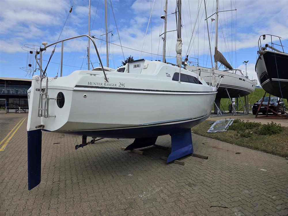 Hunter Horizon 245 built and completed by Hunter Boats in 2003 to a David Thomas design. White GRP hull and superstructure with moulded-in non-slip decks. Cast iron twin bilge keels. Tiller steering to transom hung rudder. Tiller extension. Aft self-draining cockpit.