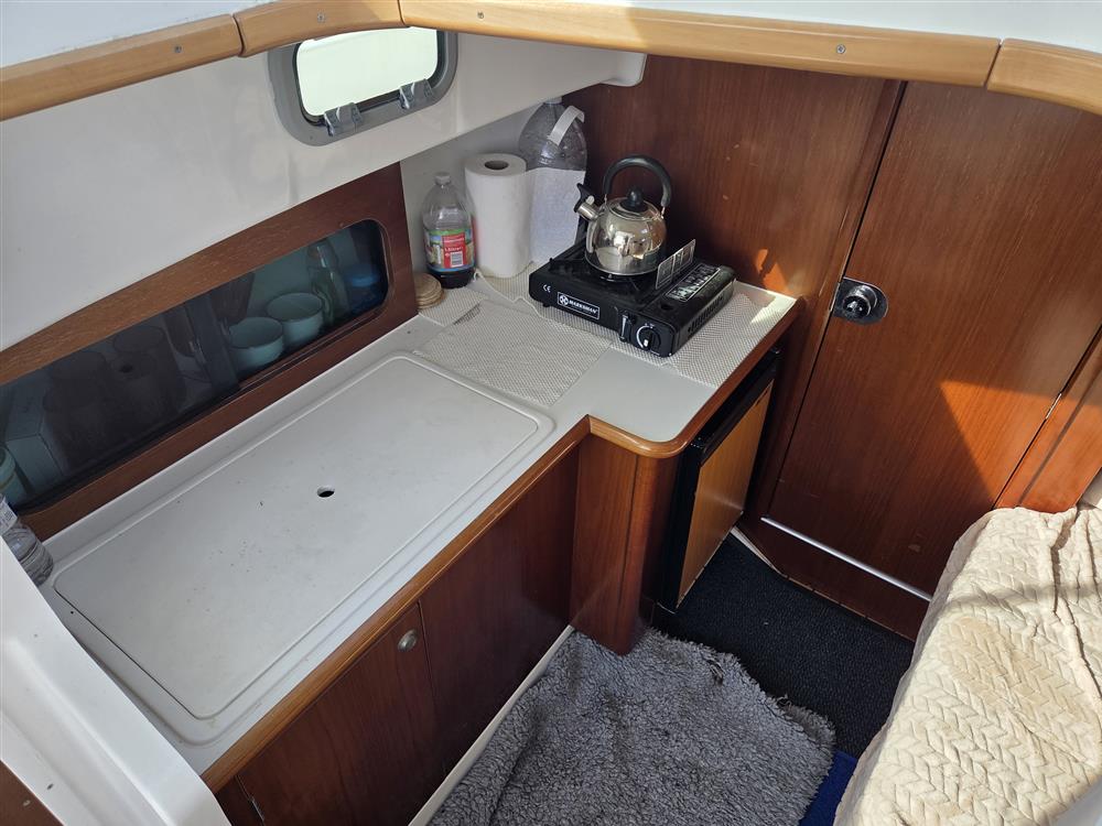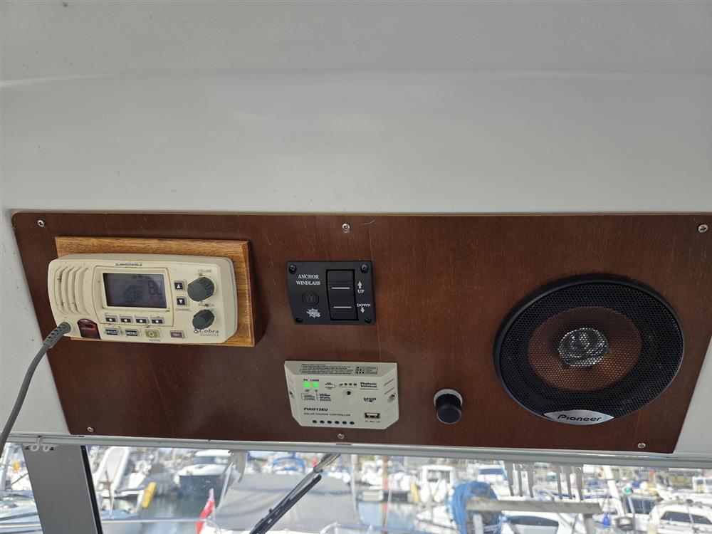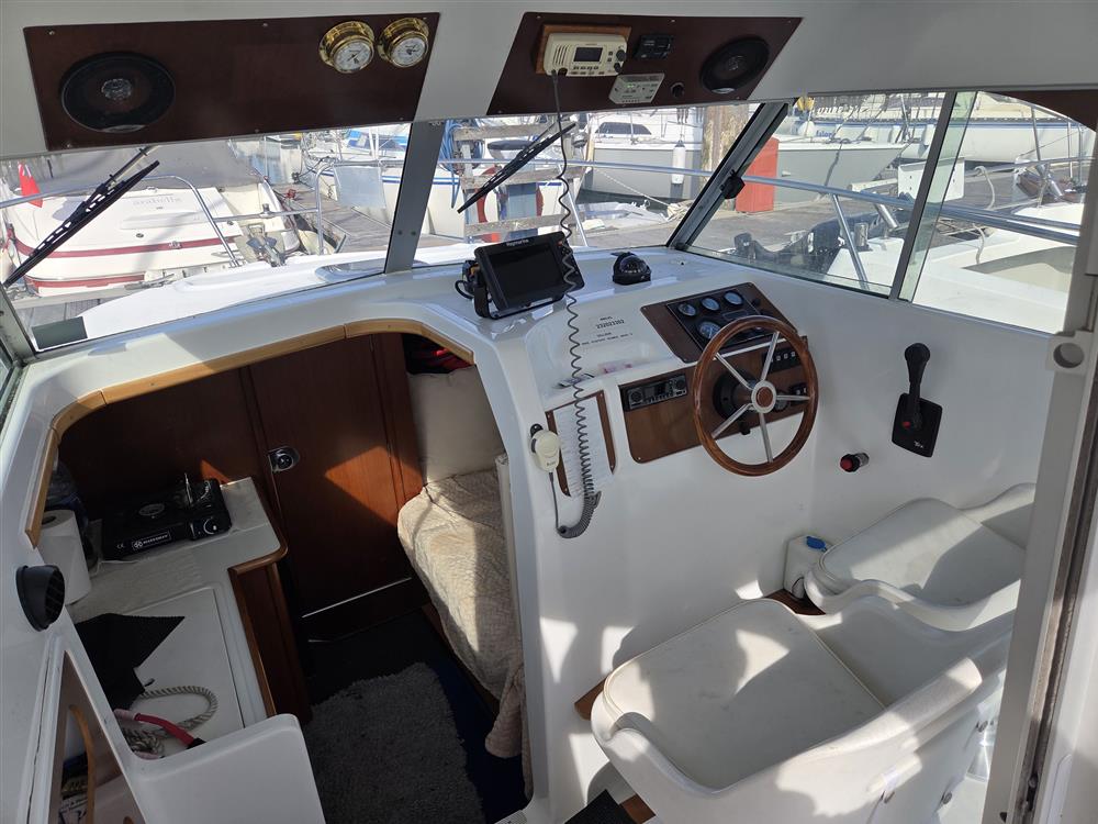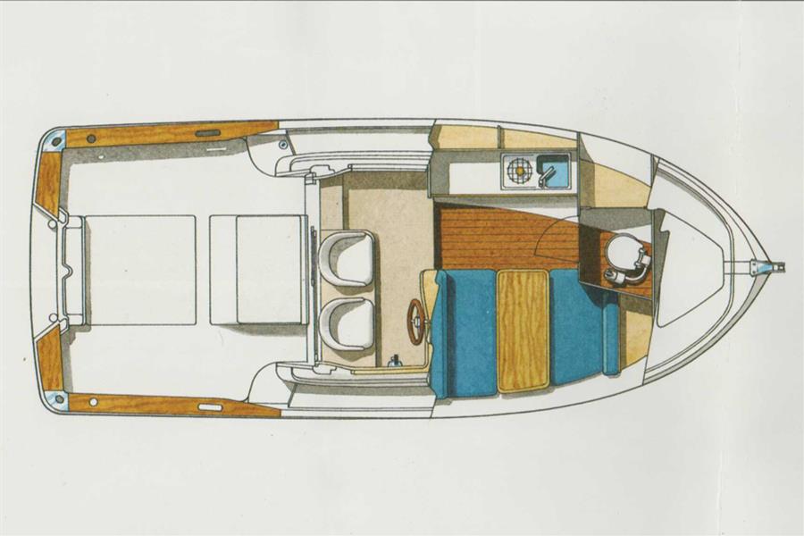 Down below from the wheelhouse there is a single cabin with galley to port, dinette to starboard plus a separate heads compartment forward with a Jabsco marine toilet. The galley has a sink with pressurised cold fresh water supply, simple Marksman singe burner cannister type gas cooker, Coolmatic front loading fridge and plenty of storage. The dinette is to starboard and offer a good single berth and table. Opening deck hatch. 3Kw diesel fired blown air central heating system. Up the stairs to the wheelhouse. This has two padded helm seats, storage to port and access to the cockpit via a sliding patio type door. Full engine controls and instruments plus navigation electronics all to hand for the helm person. Radio/MP3 player.