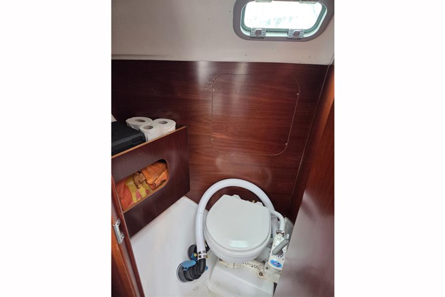 Built by Beneteau in 2004. White GRP hull with blue style stripes. Underwater hull has been epoxy treated as a preventative measure. White GRP coachroof with moulded non-skid decks. Large self-draining cockpit with teak capping rails. Large self-draining anchor well forward. Stainless steel safety rails. Alloy framed windows and sliding cockpit door. All seacocks recently replaced with composite Trudesign valves. Fast flare-shaped bow, walkaround side decks and large deep well-protected cockpit. Wheel (cable) and tiller steering.