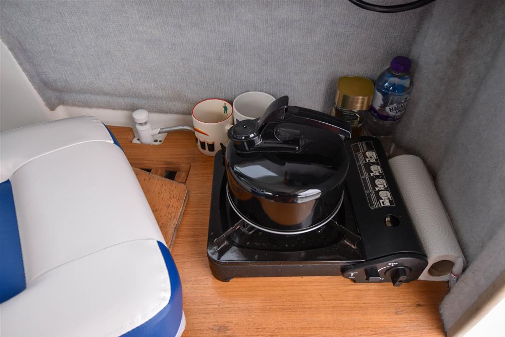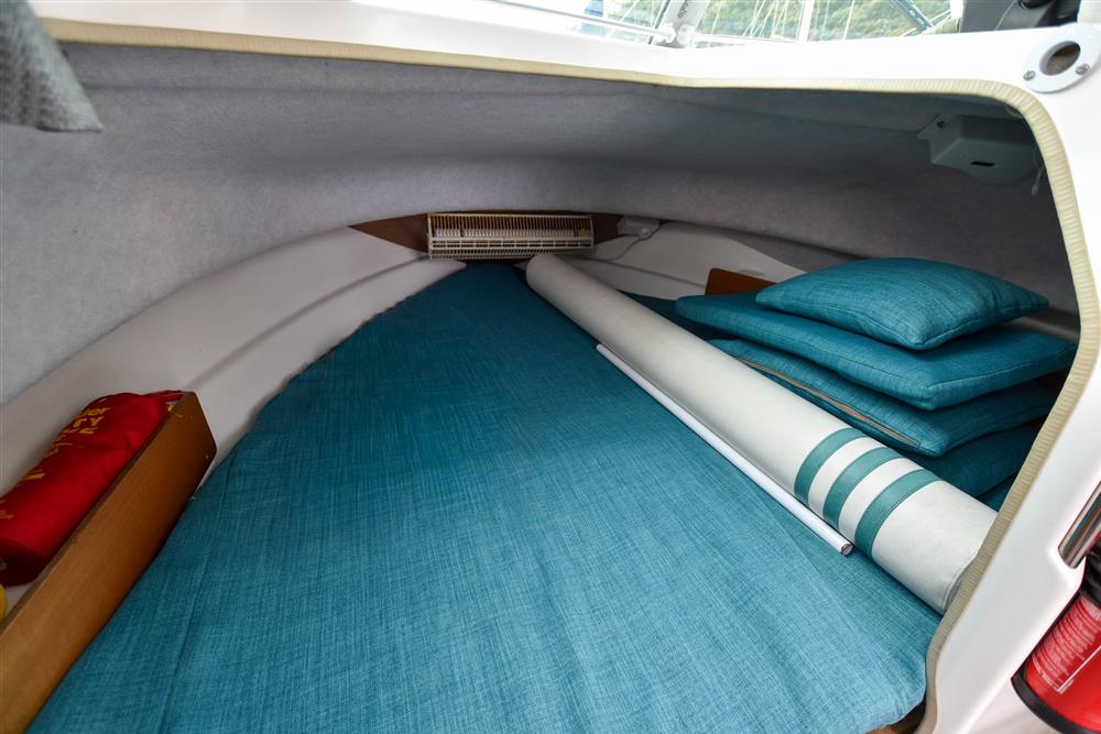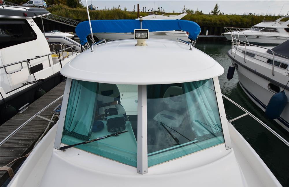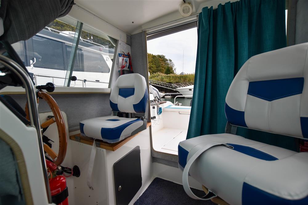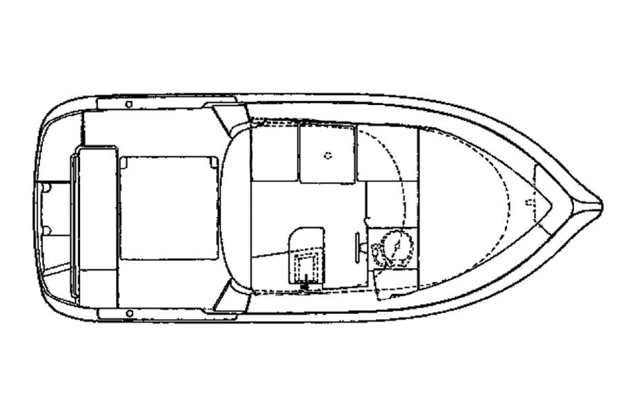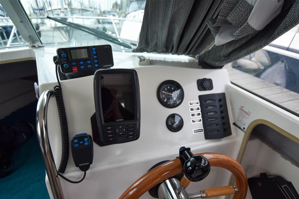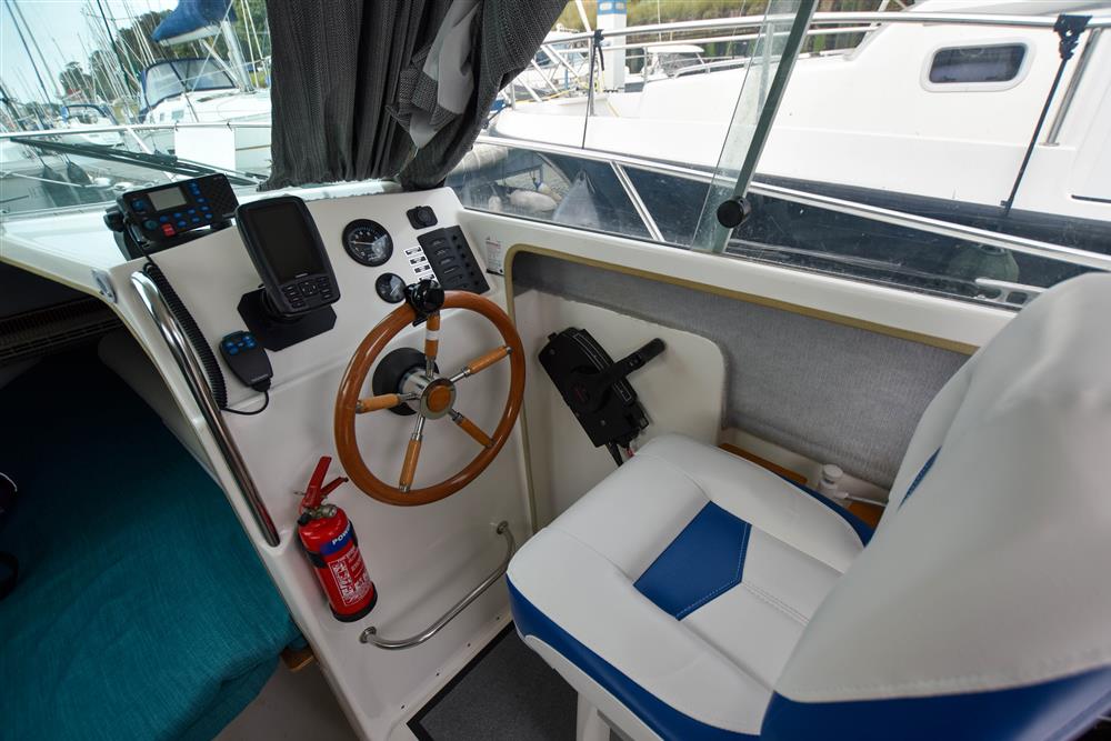 Enclosed open plan wheelhouse with helm position to starboard which folds forward to reveal a sink with manually pumped cold water supply and storage areas behind. Dinette to port which converts to form a small single berth. Forward cabin with wrap around seating area which converts into a double berth. Marine Sealock toilet to starboard. Spacious self draining cockpit with large aft bench seat, walk-thru door to transom, removable table, rod holders, excellent stowage lockers and separate engine well.