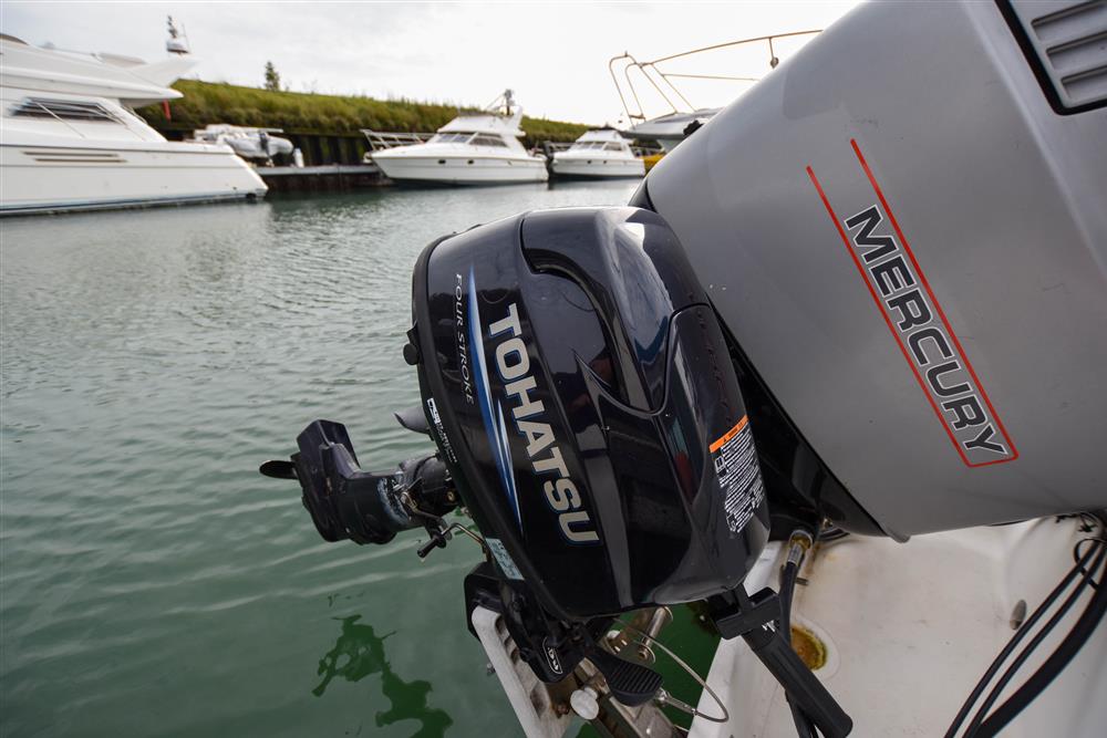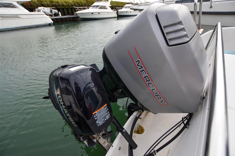 Mercury 90hp 4-stroke outboard engine with power trim and tilt bolted to transom. Single lever control box with electric start and trim control. Built in 70 litre fuel tank with deck fill. Rev counter, fuel and trim gauges. The engine has been regularly serviced and lightly used since new (believed to be around 300hrs use since new). Ultraflex steering system new 2024.