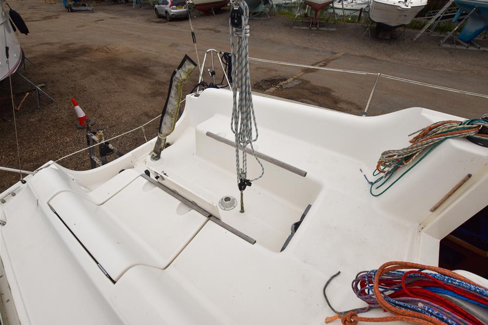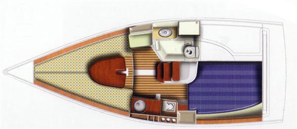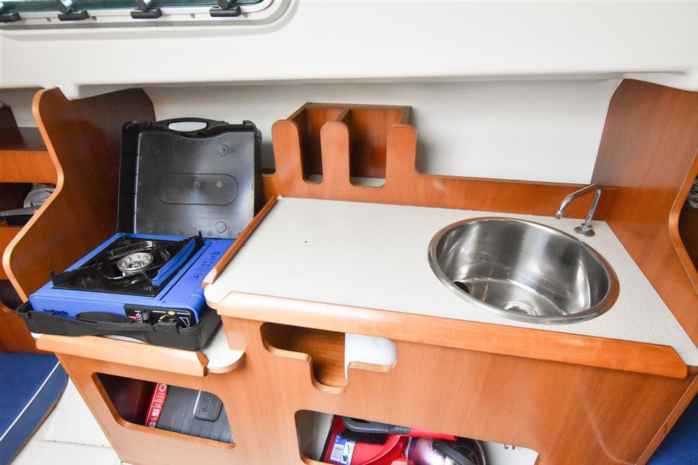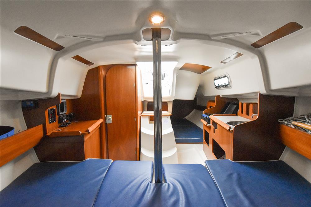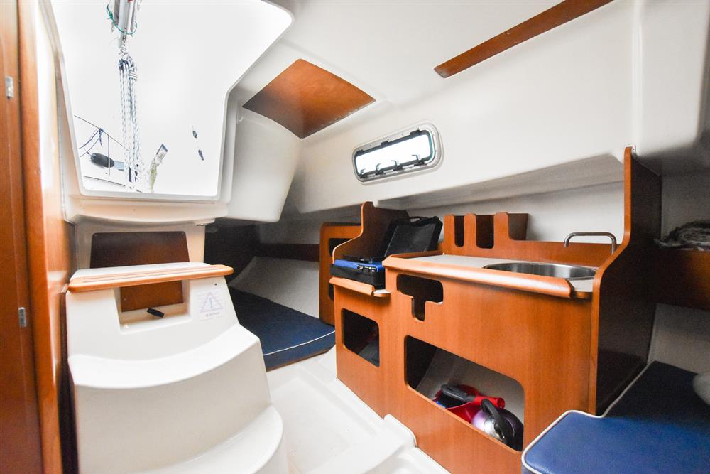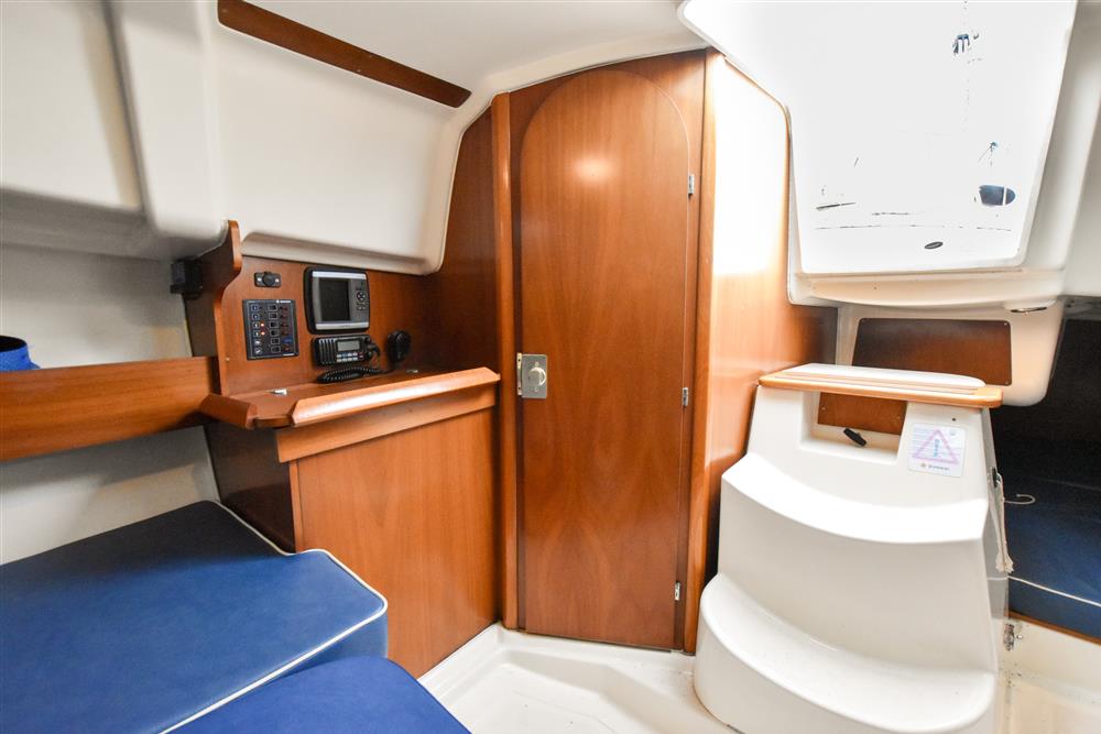 The clever interior has settee berths forward that convert to a massive double berth. Opening forehatch over berth. Saloon table drops to make the double or goes to the deckhead to get out of the way plus can be mounted in the cockpit. The small chart table is to starboard with an ice box under the lid. The galley is to port with masses of storage and a stainless steel tank with a 55 litre cold fresh water supply plus opening port over. The separate heads compartment is to starboard ? this has a marine toilet, hanging locker and moulded basin plus opening port. The huge double aft berth is aft of the engine box and is very comfortable. Stowage throughout the boat is by eye level shelving and under berths. Blue upholstery.