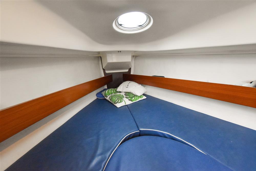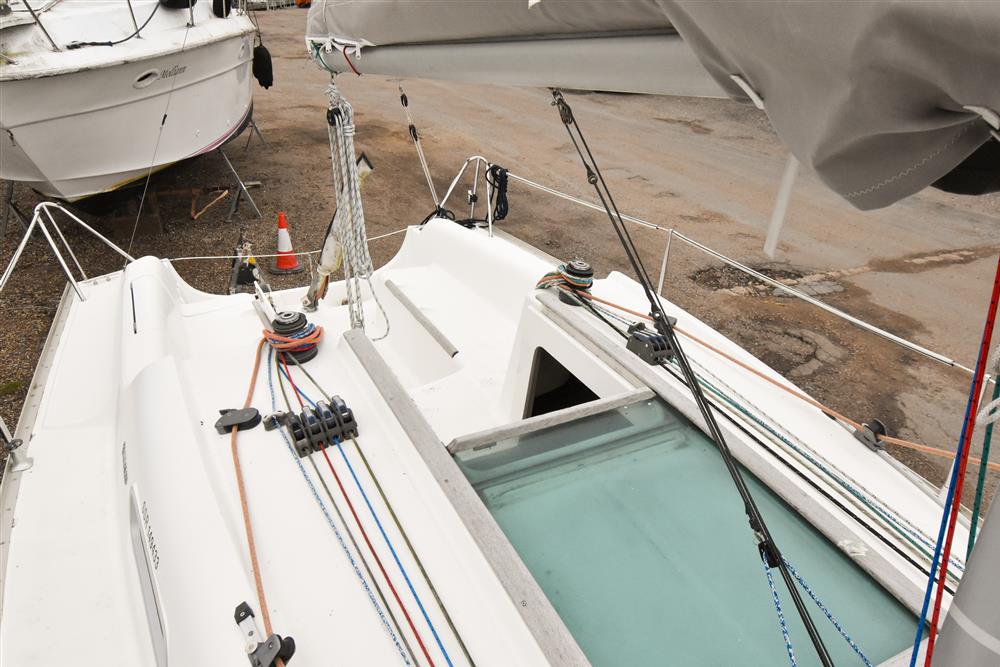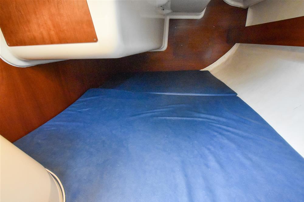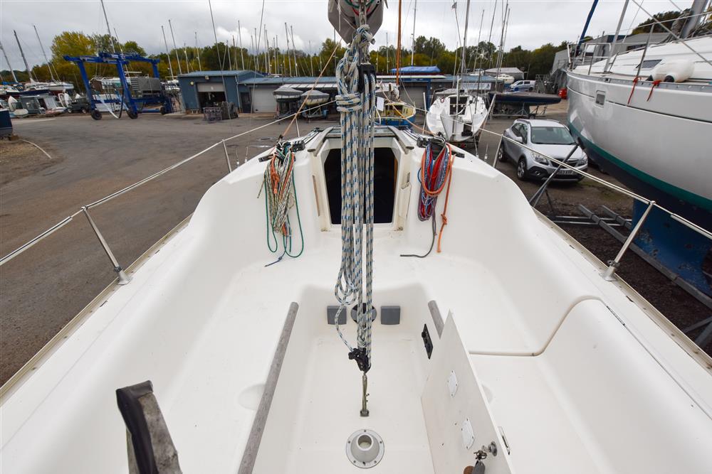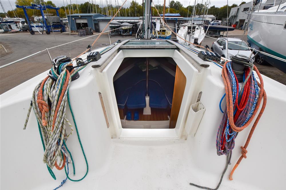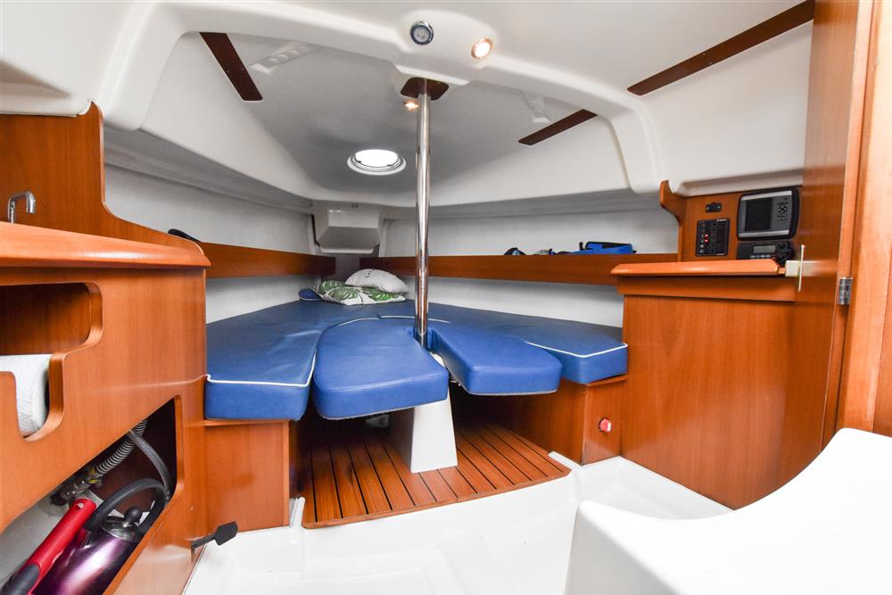 The clever interior has settee berths forward that convert to a massive double berth. Opening forehatch over berth. Saloon table drops to make the double or goes to the deckhead to get out of the way plus can be mounted in the cockpit. The small chart table is to starboard with an ice box under the lid. The galley is to port with masses of storage and a stainless steel tank with a 55 litre cold fresh water supply plus opening port over. The separate heads compartment is to starboard ? this has a marine toilet, hanging locker and moulded basin plus opening port. The huge double aft berth is aft of the engine box and is very comfortable. Stowage throughout the boat is by eye level shelving and under berths. Blue upholstery.