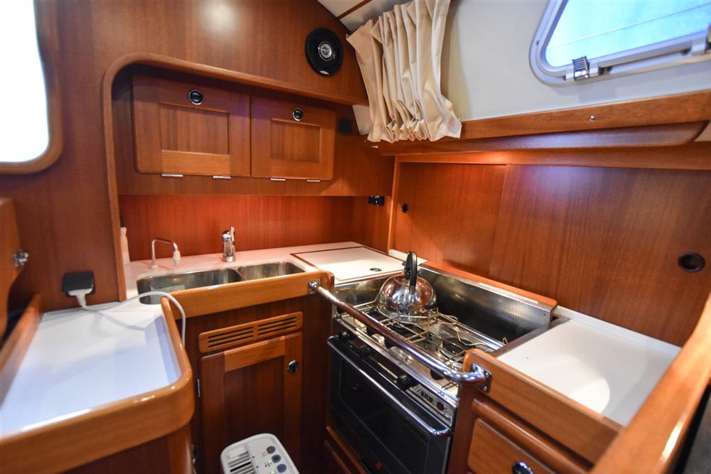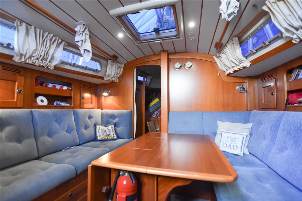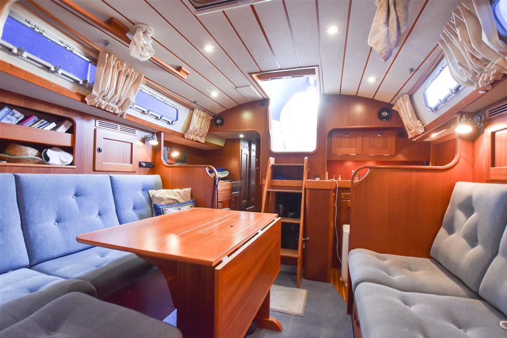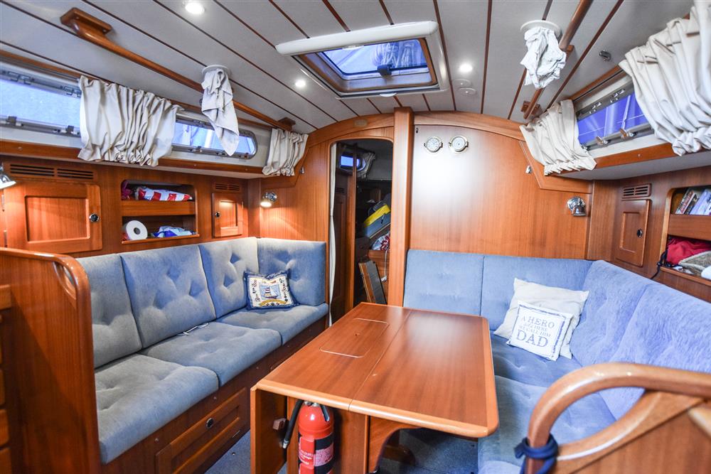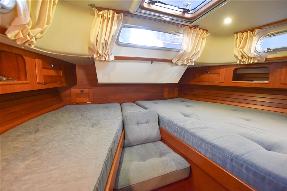 The Hallberg-Rassy 37 offers 6 comfortable berths, with two separate double sleeping cabins. The internal fit out is in a light mahogany with a matte silk finish. Varnished teak and holly floorboards. Up forward, there is a V-berth with an infill, to make a generous double. Good stowage provided by a hanging locker and lockers under the berths. Deck opening hatch. Stepping aft, the separate heads compartment is to starboard, comprising of a China wash basin with a pressurised hot & cold water supply. The tap pulls out to make a shower. Teak shower grating. Jabsco manual marine toilet with a stainless-steel holding tank. Opening port hole. Stepping in to the spacious saloon with a large L-shaped settee to starboard and a single settee berth opposite to port. Fixed, double drop leaf table to centre. Plenty of handy stowage around the saloon, provided by eye level lockers and shelving, as well as underneath and behind the seating. Good ventilation through the saloon with plenty of opening hatches. The U-shaped galley is located to port with excellent bracing for use at sea. Twin stainless-steel sinks with a pressurised hot & cold water supply. Reserve manual foot pump. Eno two burner gas hob with a grill and oven. Top opening refrigerator with an ice box. Opposite to starboard is the forward-facing chart table with the electrical distribution panel, navigation equipment and chart stowage. The large aft owner?s cabin is accessed down the starboard side with a hanging locker along the hull. There are two generous single berths to port and starboard, with a small seat in between. Good stowage again provided by handy lockers and separate hanging locker. Deck opening hatch. Blue upholstery. Cream curtains. Fitted blue carpets. Webasto diesel fired cabin heating.