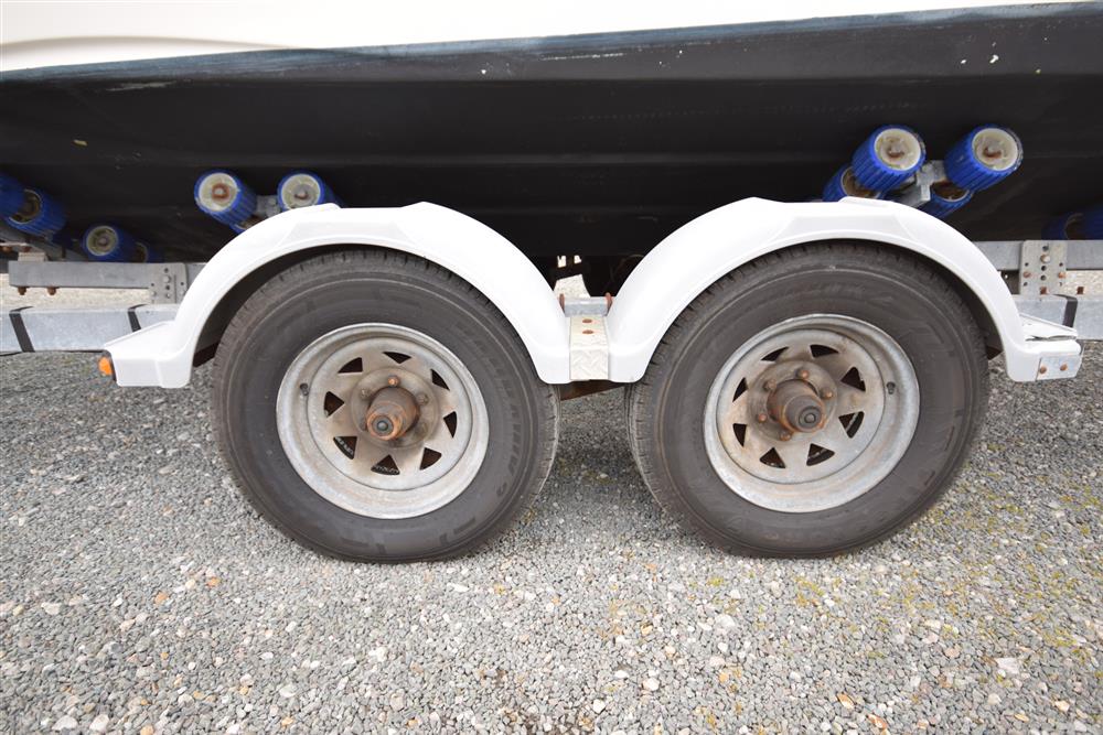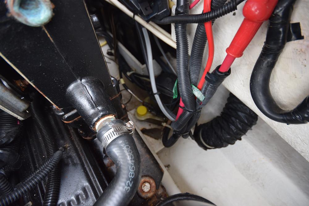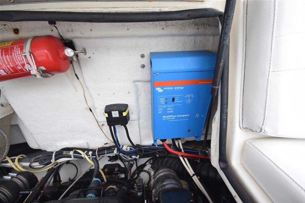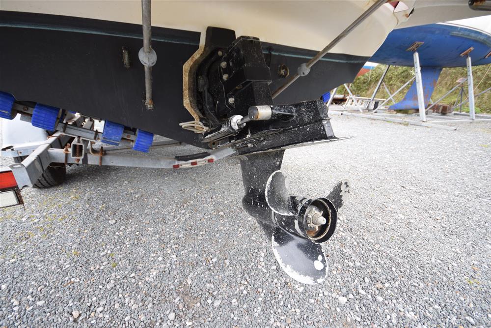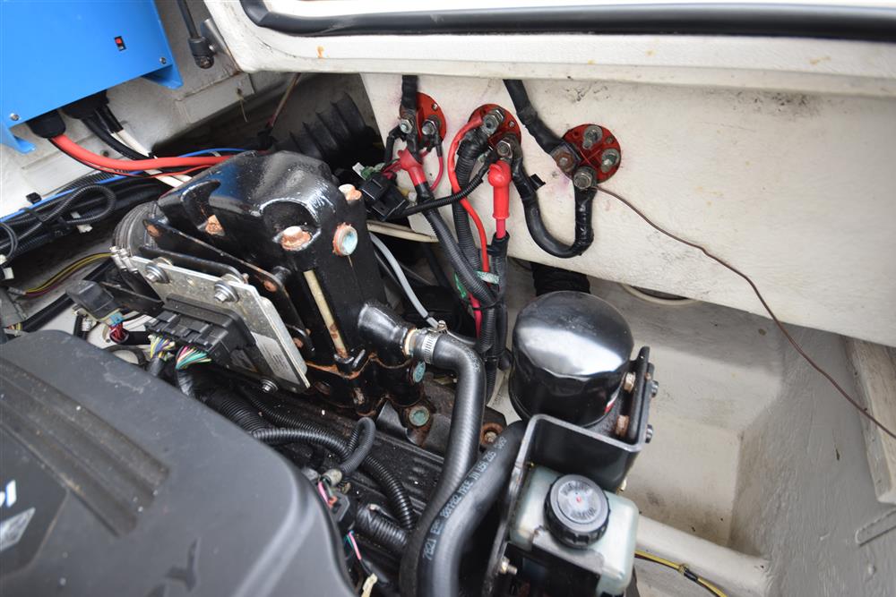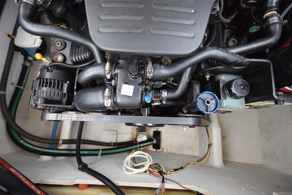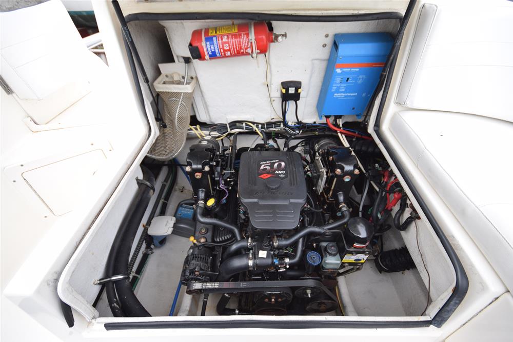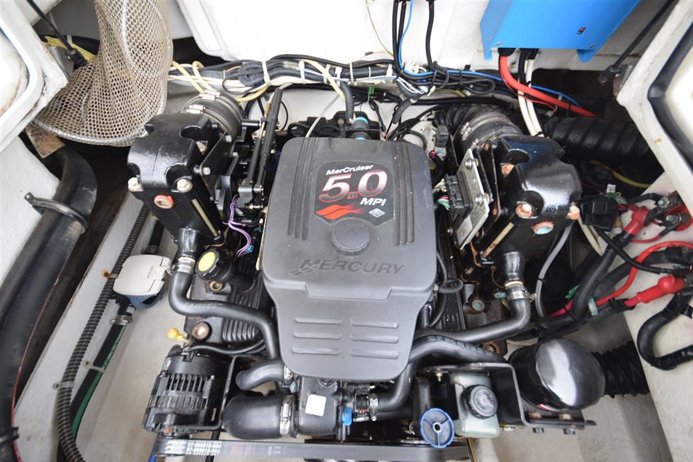 Found in an insulated engine compartment below the rear seats is a Mercruiser 5.0 MPI V8 petrol engine that has approximately 389 hours. Single lever controls at the helm. Powering a three bladed alloy propeller through a hydraulicly adjustable drive leg. The engine and leg are serviced yearly, the bellows were last replaced in 2023.