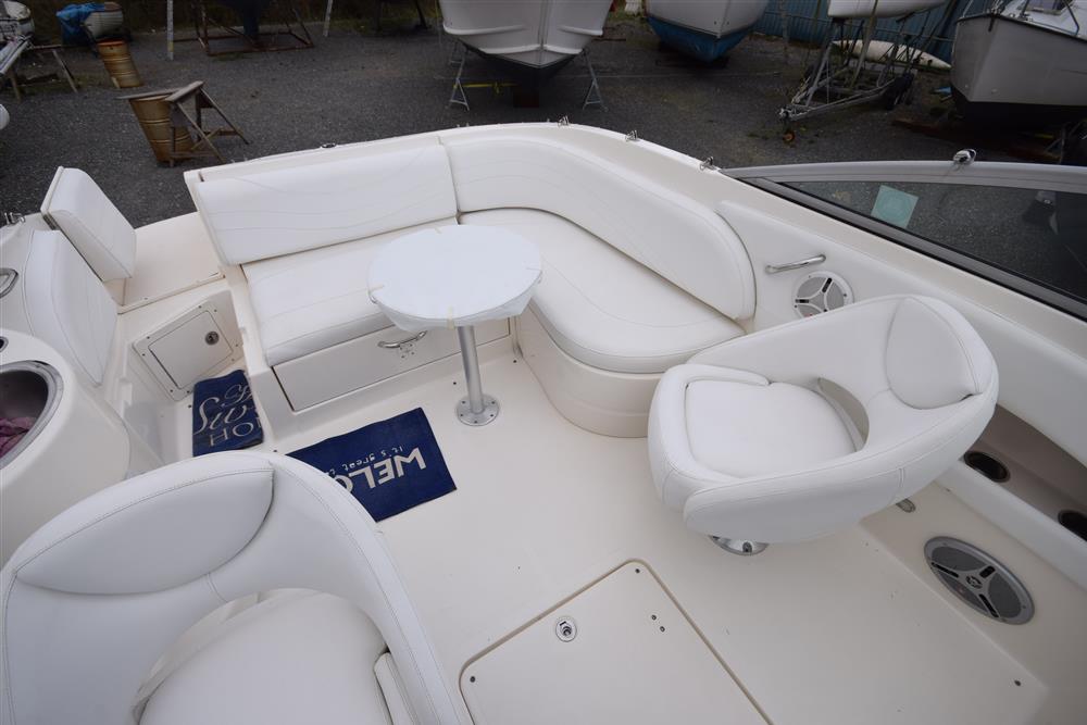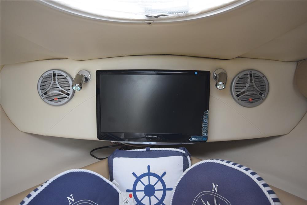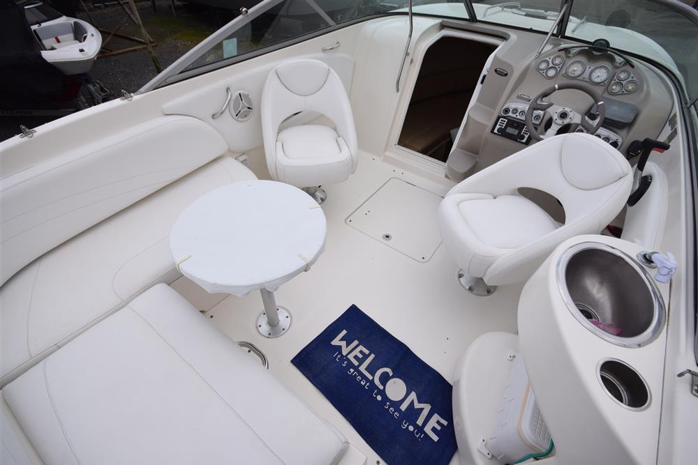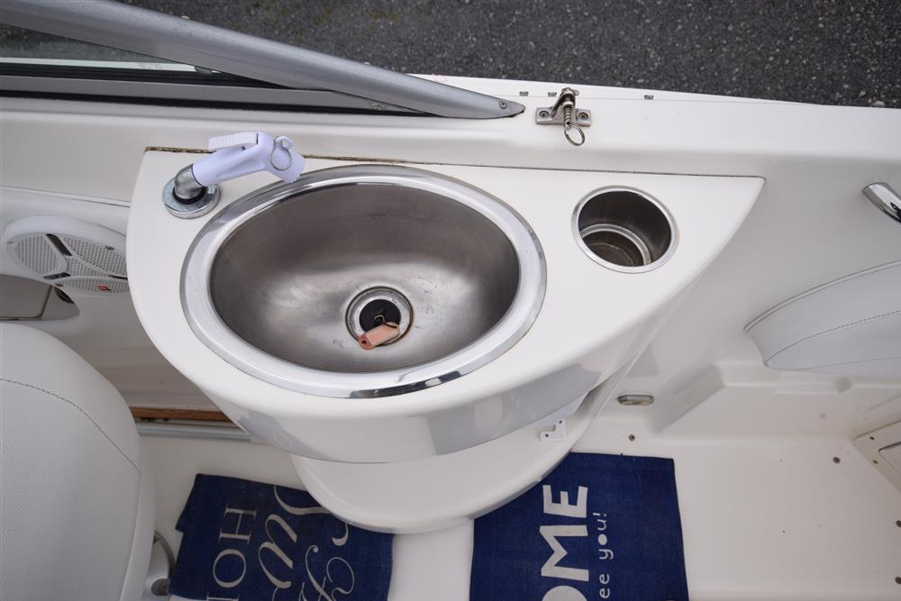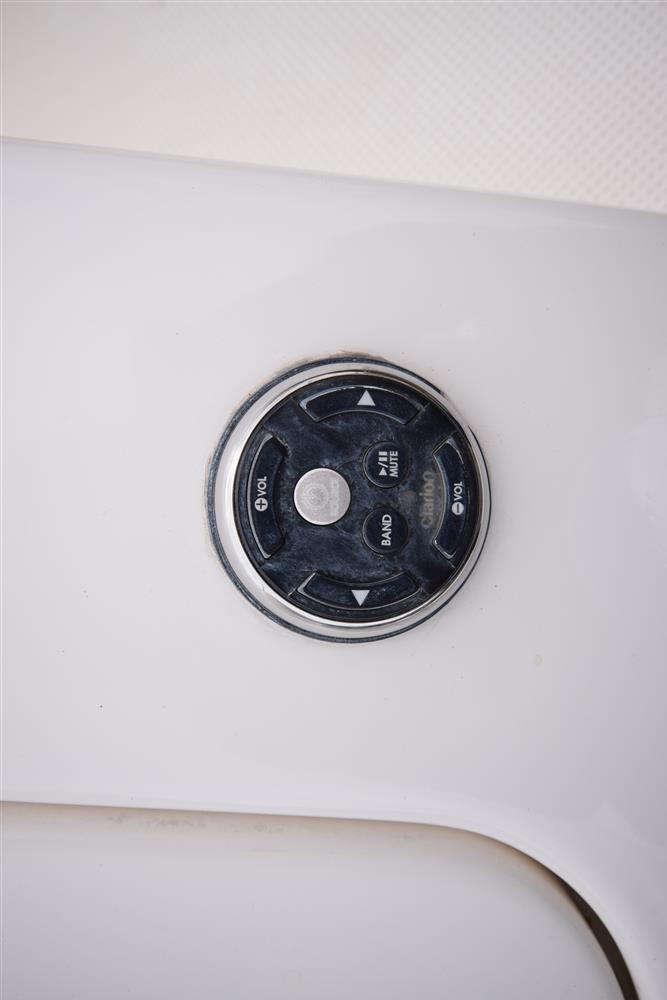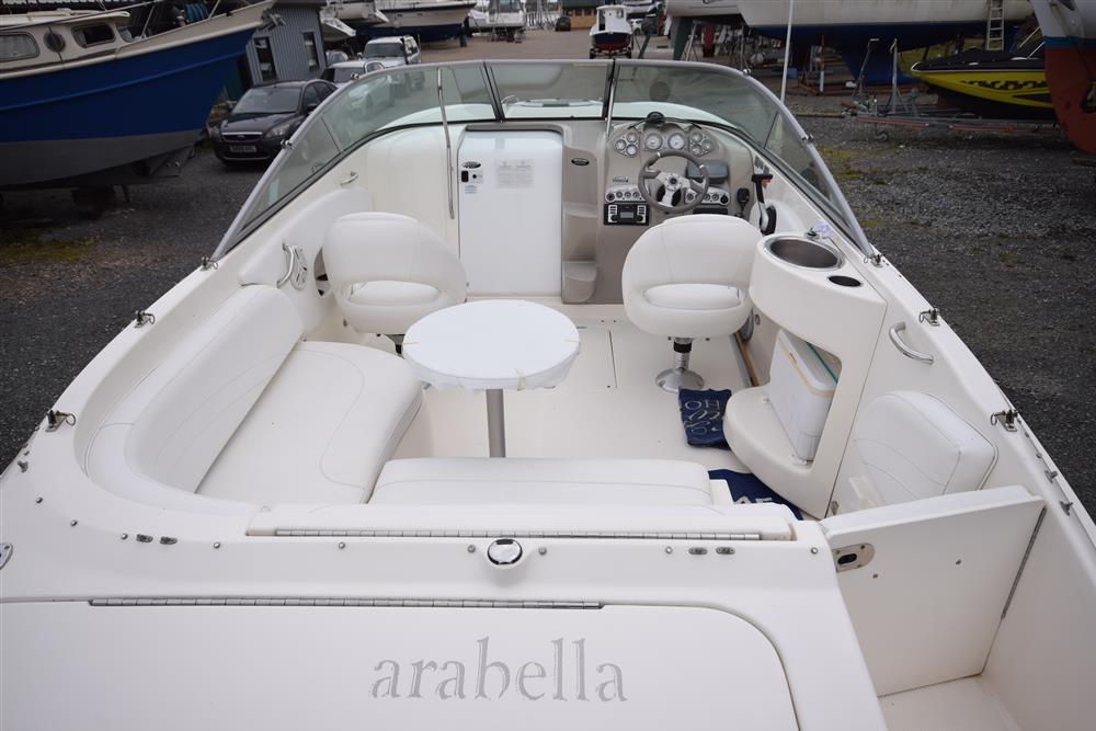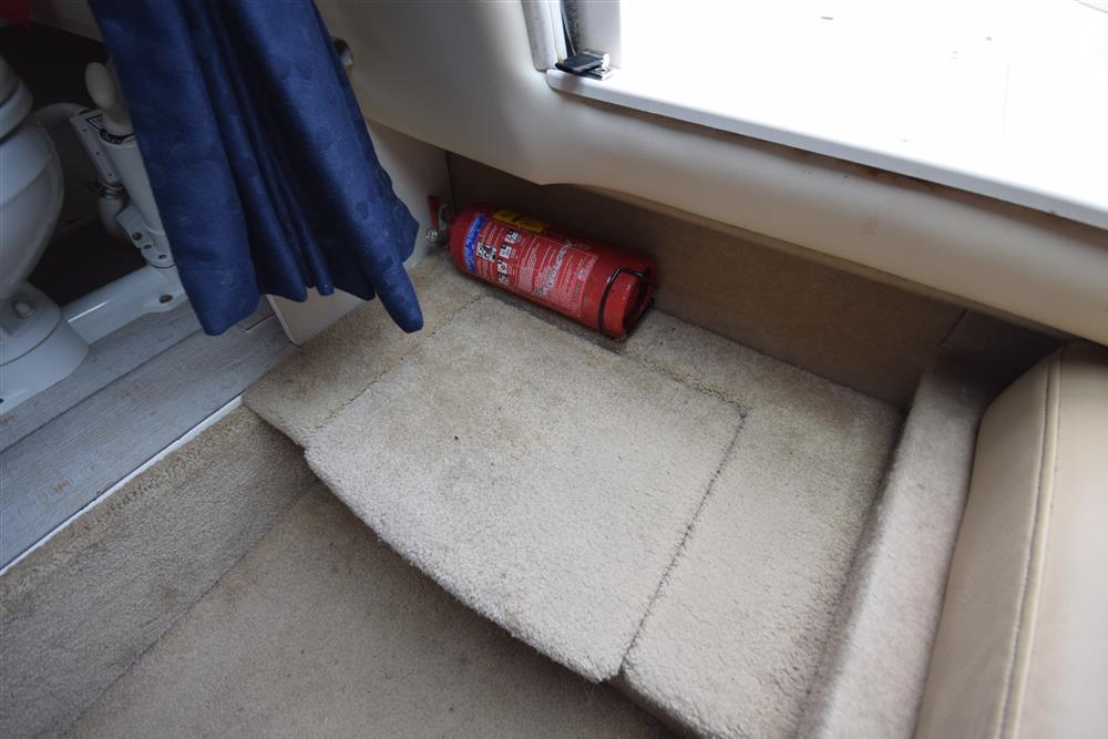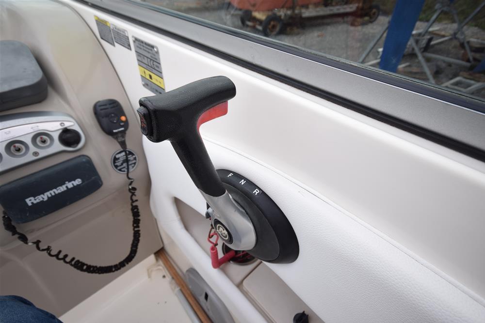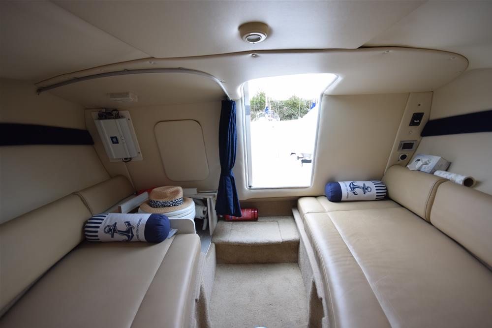 Up forward, behind the lockable door is the cleverly designed cuddy cabin which boasts superb interior volume for her size of boat. Large U shape settee with an infill to make a comfortable double berth, perfect for the occasional overnight stay. Handy stowage lockers under the seating. Cream vinyl upholstery. Manual sea toilet with a privacy curtain against the starboard bulkhead. TV on the forward bulkhead. Although the cabin is cleverly laid out, the cockpit and bathing platform is where this boat really shines. There is ample room for four adults to sit around the table and both helm seat and nav seat swivel to face the aft when socialising. Good stowage throughout the cockpit for fenders, warps, towable toys etc. To starboard, there is a wet bar with a pressurised fresh water supply and an IGLOO cool box below. The Clarion entertainment system has speakers inside and out, which can be controlled from the helm and the bathing platform. Cockpit shower, again with a pressurised cold water supply.