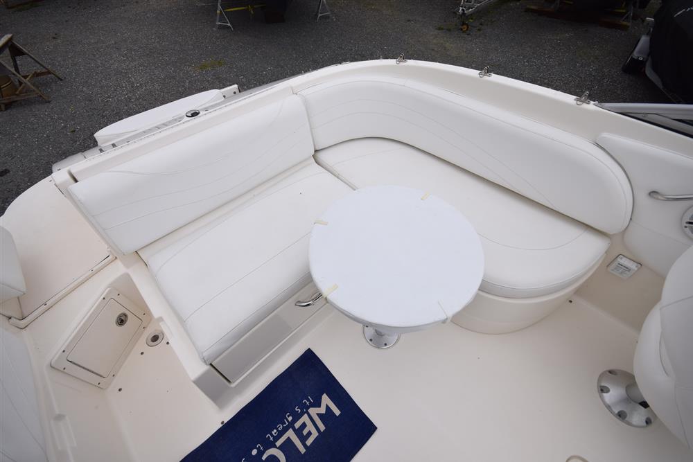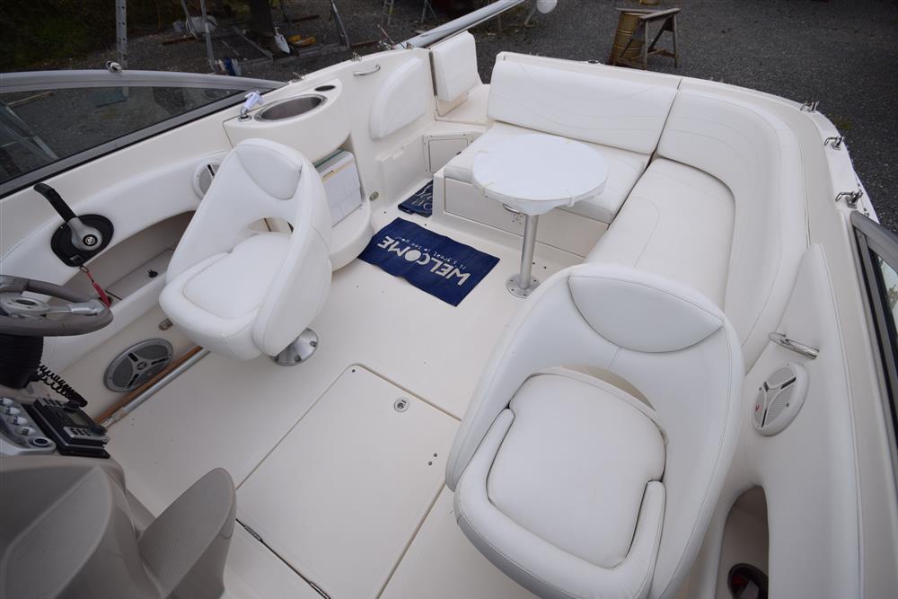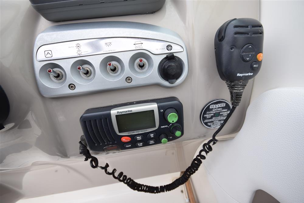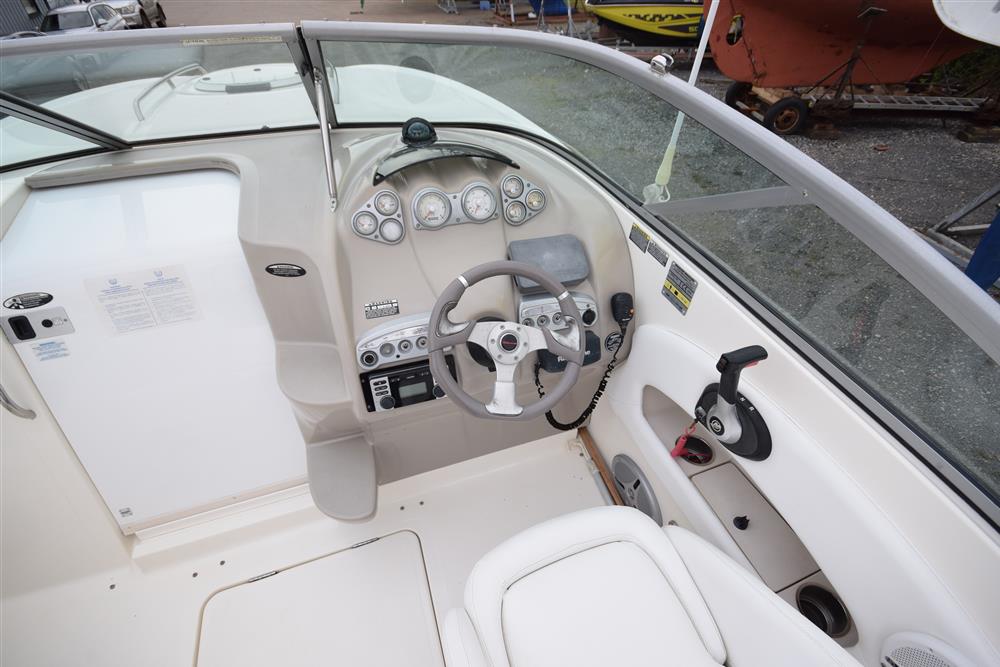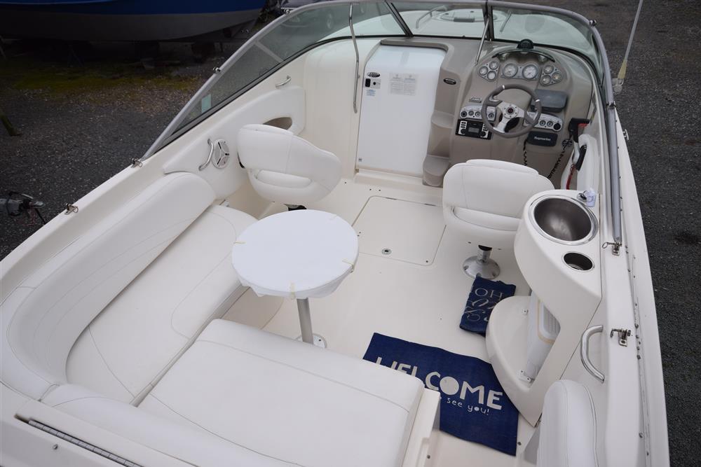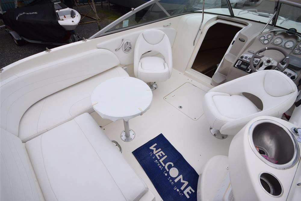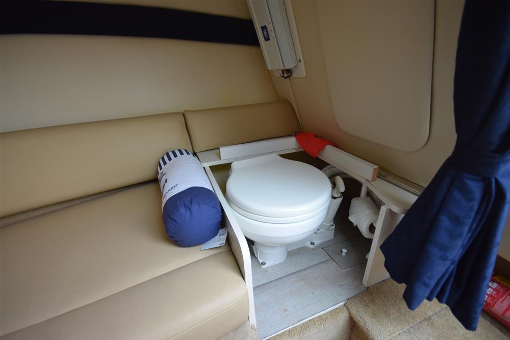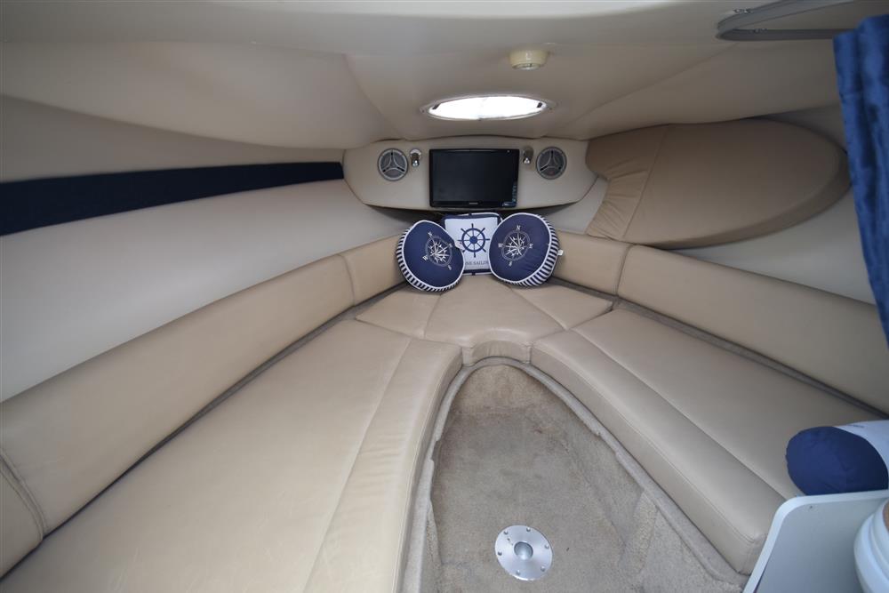 Up forward, behind the lockable door is the cleverly designed cuddy cabin which boasts superb interior volume for her size of boat. Large U shape settee with an infill to make a comfortable double berth, perfect for the occasional overnight stay. Handy stowage lockers under the seating. Cream vinyl upholstery. Manual sea toilet with a privacy curtain against the starboard bulkhead. TV on the forward bulkhead. Although the cabin is cleverly laid out, the cockpit and bathing platform is where this boat really shines. There is ample room for four adults to sit around the table and both helm seat and nav seat swivel to face the aft when socialising. Good stowage throughout the cockpit for fenders, warps, towable toys etc. To starboard, there is a wet bar with a pressurised fresh water supply and an IGLOO cool box below. The Clarion entertainment system has speakers inside and out, which can be controlled from the helm and the bathing platform. Cockpit shower, again with a pressurised cold water supply.