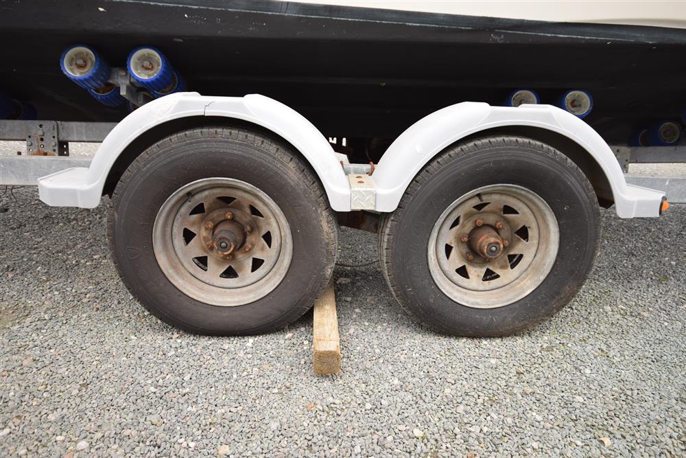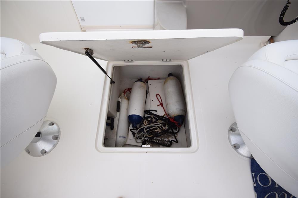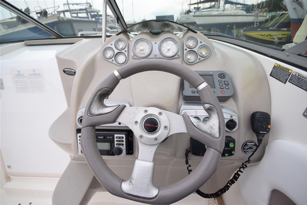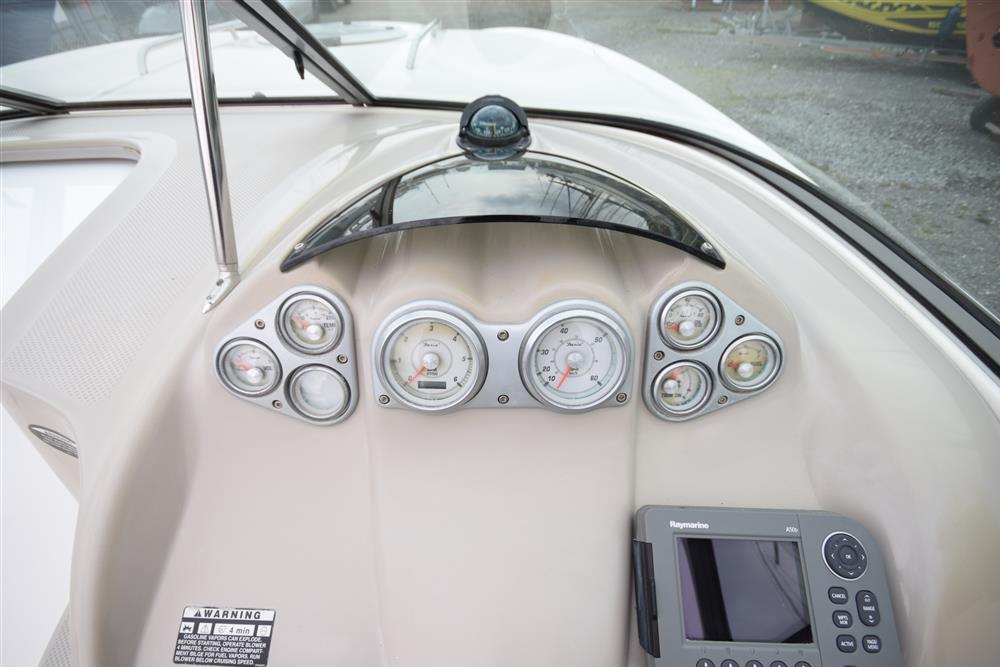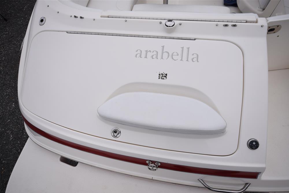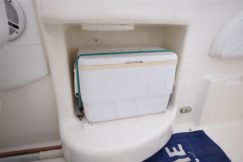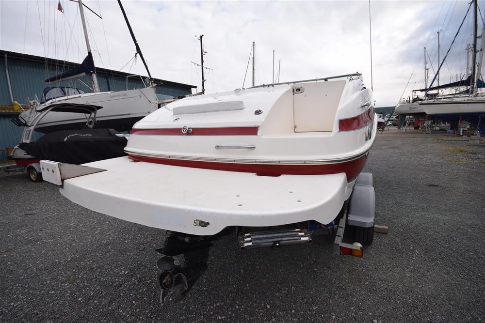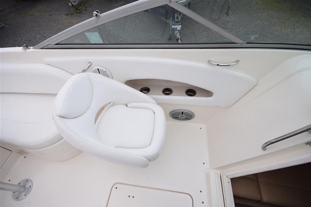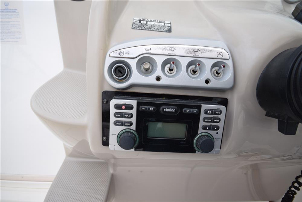 Up forward, behind the lockable door is the cleverly designed cuddy cabin which boasts superb interior volume for her size of boat. Large U shape settee with an infill to make a comfortable double berth, perfect for the occasional overnight stay. Handy stowage lockers under the seating. Cream vinyl upholstery. Manual sea toilet with a privacy curtain against the starboard bulkhead. TV on the forward bulkhead. Although the cabin is cleverly laid out, the cockpit and bathing platform is where this boat really shines. There is ample room for four adults to sit around the table and both helm seat and nav seat swivel to face the aft when socialising. Good stowage throughout the cockpit for fenders, warps, towable toys etc. To starboard, there is a wet bar with a pressurised fresh water supply and an IGLOO cool box below. The Clarion entertainment system has speakers inside and out, which can be controlled from the helm and the bathing platform. Cockpit shower, again with a pressurised cold water supply.