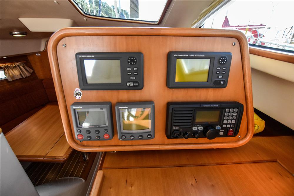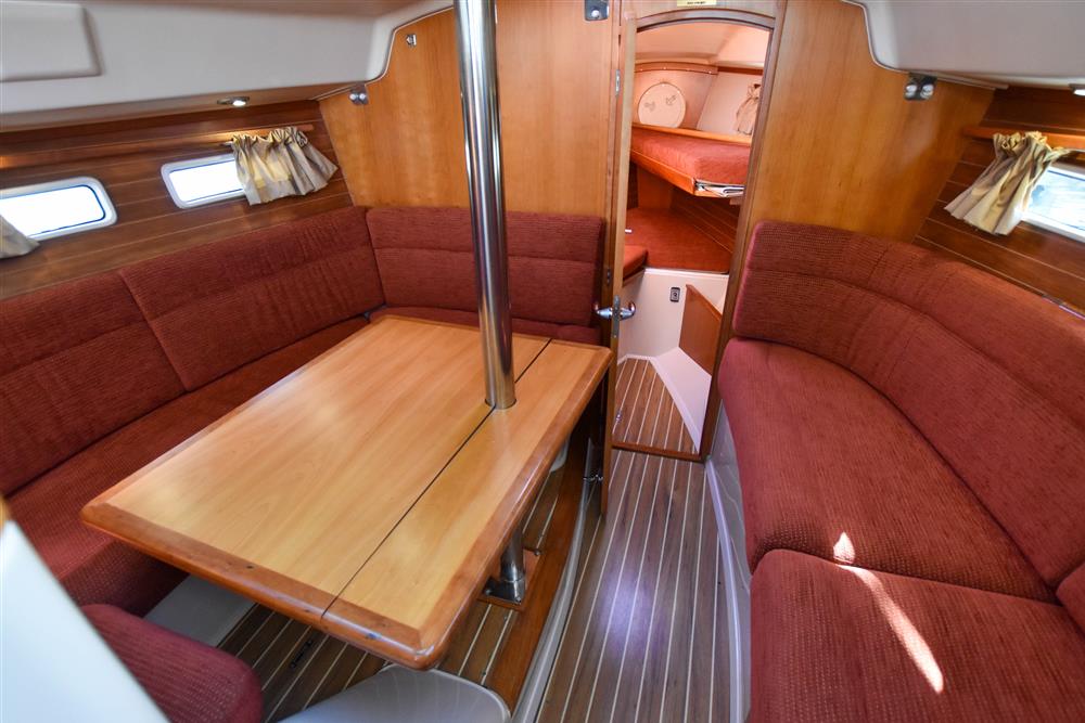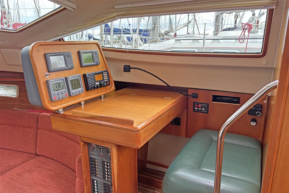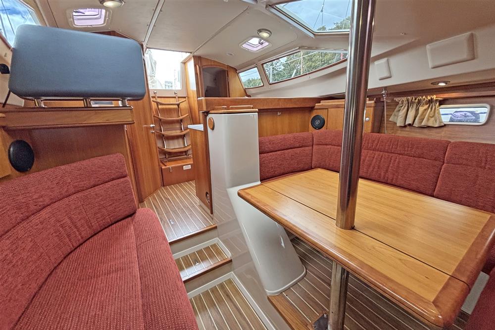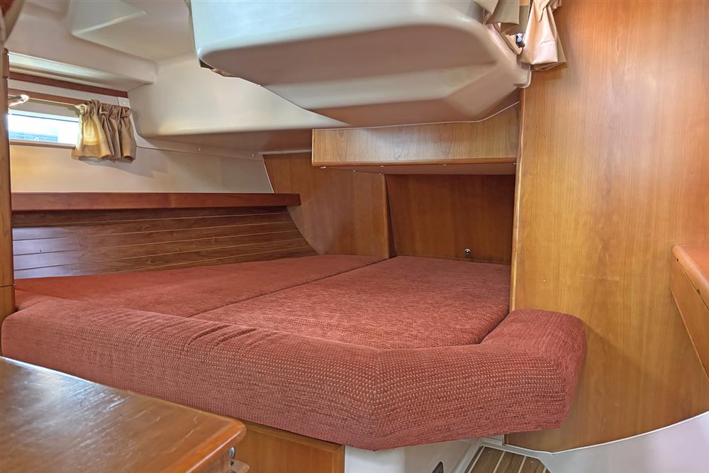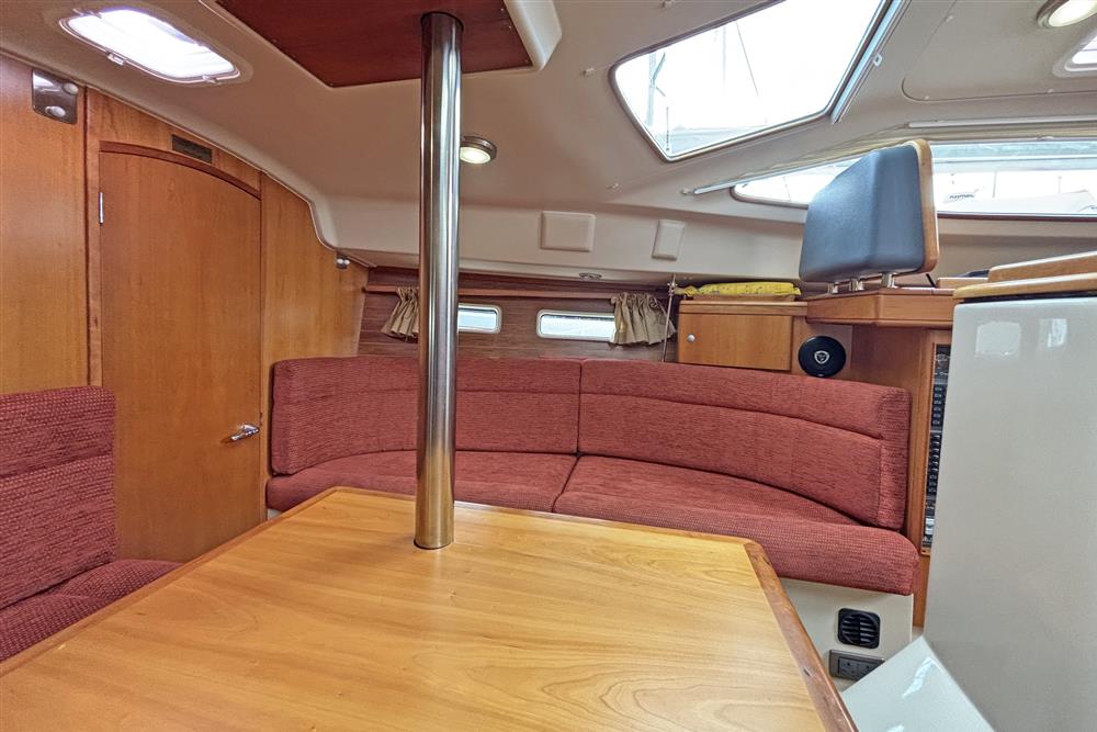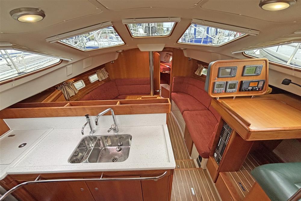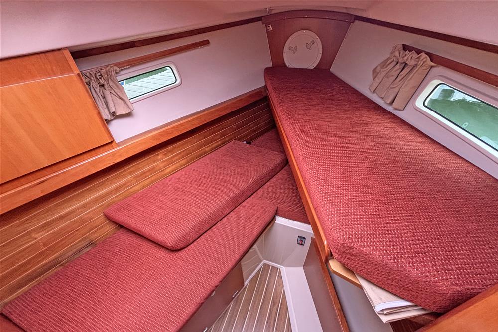 Offering up to 8 berths in well-ventilated interior, with standing headroom throughout and plenty of natural light. Superbly finished in American Cherry joinery which is complimented by the Christina Morrone Prim, red upholstery. Up forward there are three berths (over & two under). Good stowage, provided by a full-length shelf to port and a hanging locker to starboard. There is access to chain locker, two fixed hull ports and an opening hatch to the foredeck. Moving aft into the saloon, there is a large U-shape dinette seating arrangement to port. The saloon table is to centre, which attached to the stainless-steel mast support. The table slides and extends with insert so that you can easily sit 6 people. The table also drops down to convert in to a double berth. Opposite to starboard, there is a single settee. Good stowage around the saloon, with lockers under the seating and handy shelving. Bottle stowage. Four fixed hull portlights. Moving aft again, you step up to the galley and navigation area. The forward-facing chart table is to starboard with some navigation equipment, engine controls and the electrical distribution panel. Green vinyl cushion to navigators seat. There excellent visibility through the raised coach roof windows. The L-shaped galley is opposite to port, comprising of twin stainless steel sinks with a hot and cold pressurised water supply, 205 litre capacity. Separate manual cold water supply. Gemini Corian type worktop. Top loading 75 litre fridge. Plastimo gas cooker with two burners, grill and oven. Handy stowage around the galley. The separate heads compartment is to starboard as you come down the companionway. Jabsco marine toilet with a 78 litre holding tank. Hinged seat to cover marine toilet. Washbasin with Gemini Corian type worktop. Shower head/mixer tap. Stainless steel grab handle. Hot and cold pressurised water supply. Electric shower tray sump pump. Grating to shower tray. Oilskin stowage In the stern, there is aft cabin that has a large double berth offset to starboard. Large vanity unit to port with angled acrylic doors, stowage under and outboard. Two drawers. Locker. Shelved wardrobe. Stowage drawer under forward end of double berth. Two reading lights. Two fixed hull ports. Two opening ports to cockpit. Door to en-suite heads facilities. Eberspacher diesel fired central heating system. Extra sole hatches giving access to additional sub floor stowage. Cream concertina blinds to raised coach roof windows and cream curtains to portlights.