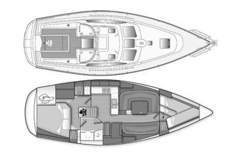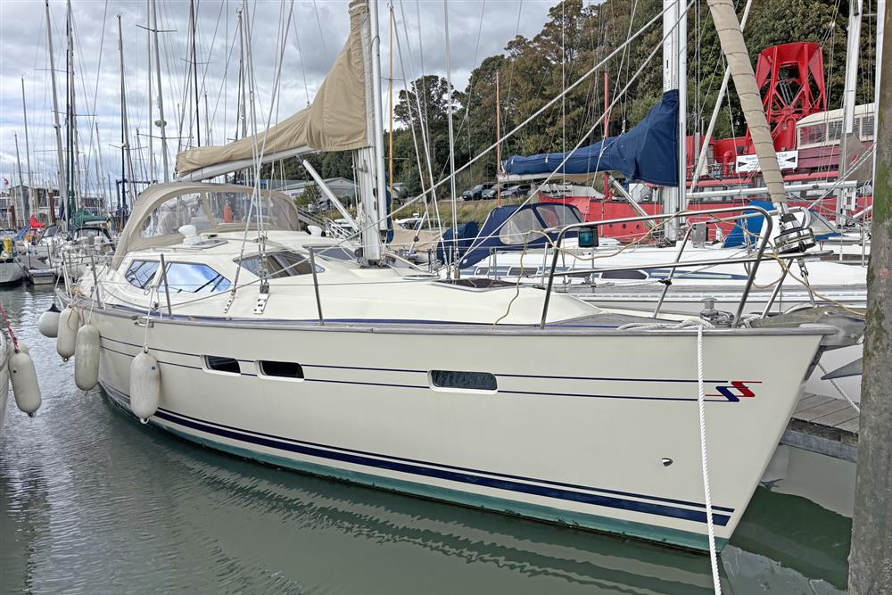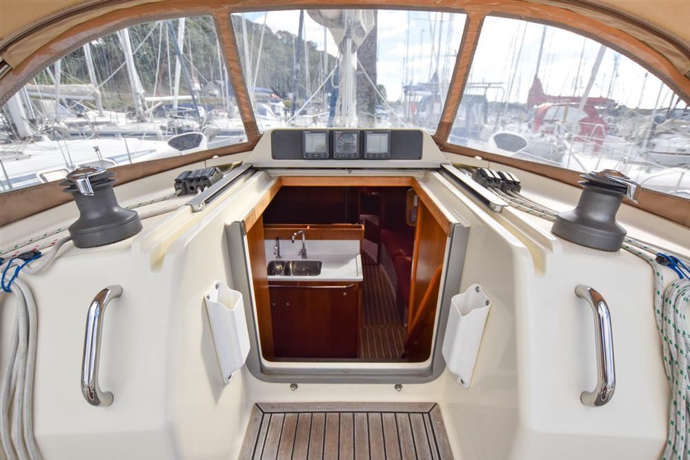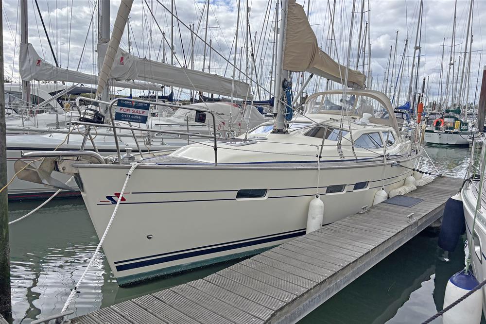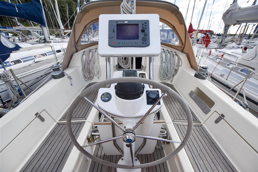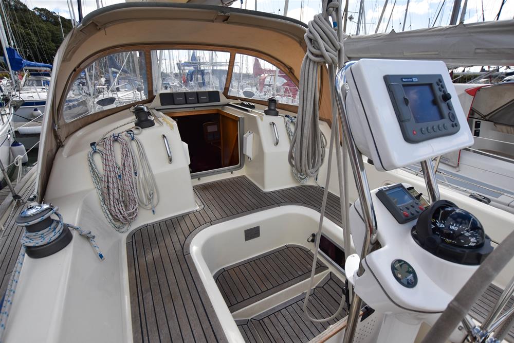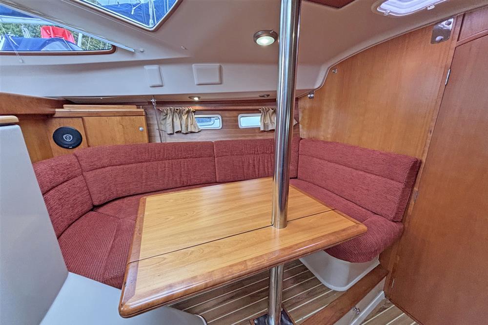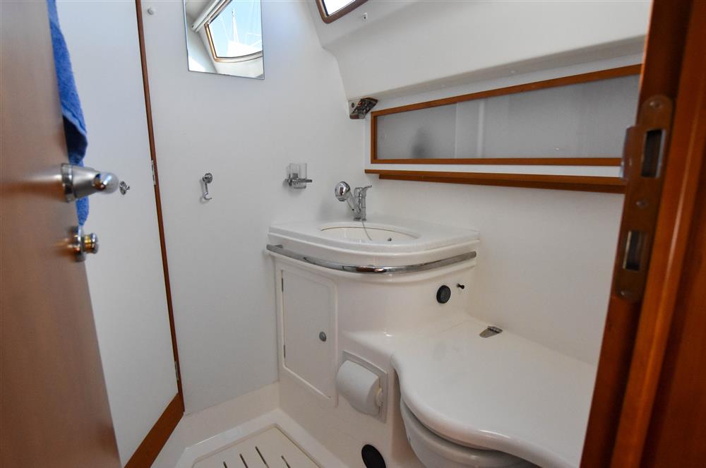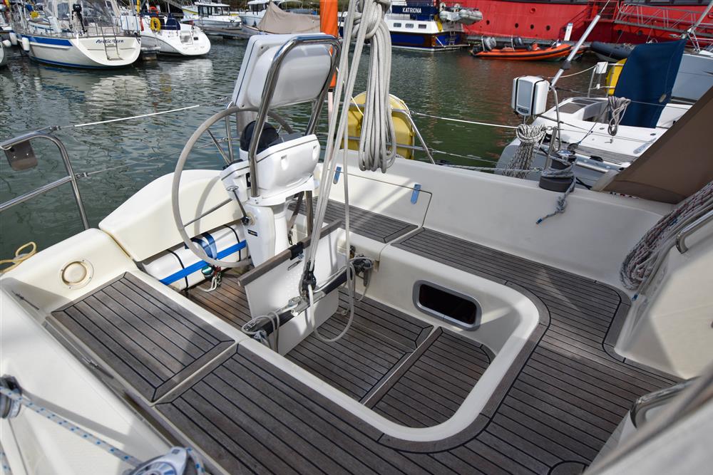 Offering up to 8 berths in well-ventilated interior, with standing headroom throughout and plenty of natural light. Superbly finished in American Cherry joinery which is complimented by the Christina Morrone Prim, red upholstery. Up forward there are three berths (over & two under). Good stowage, provided by a full-length shelf to port and a hanging locker to starboard. There is access to chain locker, two fixed hull ports and an opening hatch to the foredeck. Moving aft into the saloon, there is a large U-shape dinette seating arrangement to port. The saloon table is to centre, which attached to the stainless-steel mast support. The table slides and extends with insert so that you can easily sit 6 people. The table also drops down to convert in to a double berth. Opposite to starboard, there is a single settee. Good stowage around the saloon, with lockers under the seating and handy shelving. Bottle stowage. Four fixed hull portlights. Moving aft again, you step up to the galley and navigation area. The forward-facing chart table is to starboard with some navigation equipment, engine controls and the electrical distribution panel. Green vinyl cushion to navigators seat. There excellent visibility through the raised coach roof windows. The L-shaped galley is opposite to port, comprising of twin stainless steel sinks with a hot and cold pressurised water supply, 205 litre capacity. Separate manual cold water supply. Gemini Corian type worktop. Top loading 75 litre fridge. Plastimo gas cooker with two burners, grill and oven. Handy stowage around the galley. The separate heads compartment is to starboard as you come down the companionway. Jabsco marine toilet with a 78 litre holding tank. Hinged seat to cover marine toilet. Washbasin with Gemini Corian type worktop. Shower head/mixer tap. Stainless steel grab handle. Hot and cold pressurised water supply. Electric shower tray sump pump. Grating to shower tray. Oilskin stowage In the stern, there is aft cabin that has a large double berth offset to starboard. Large vanity unit to port with angled acrylic doors, stowage under and outboard. Two drawers. Locker. Shelved wardrobe. Stowage drawer under forward end of double berth. Two reading lights. Two fixed hull ports. Two opening ports to cockpit. Door to en-suite heads facilities. Eberspacher diesel fired central heating system. Extra sole hatches giving access to additional sub floor stowage. Cream concertina blinds to raised coach roof windows and cream curtains to portlights.