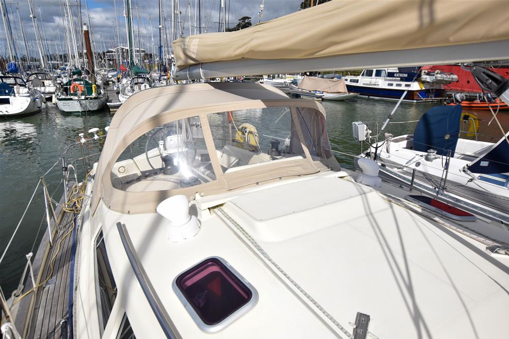 Built by Northshore in 2007 to a design by Rob Humphreys. Off-White GRP hull with Oxford blue style stripes. Hull Coppercoated in 2015. Teak toe rails. Off-White GRP superstructure with a teak laid deck. Cast iron swing keel (0.72m to 2.18m). Twin spade rudders. Wheel steering. Aft self-draining cockpit. Teak laid cockpit seating and sole. Walk-through transom. Bathing platform.