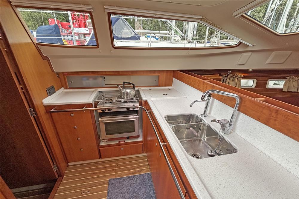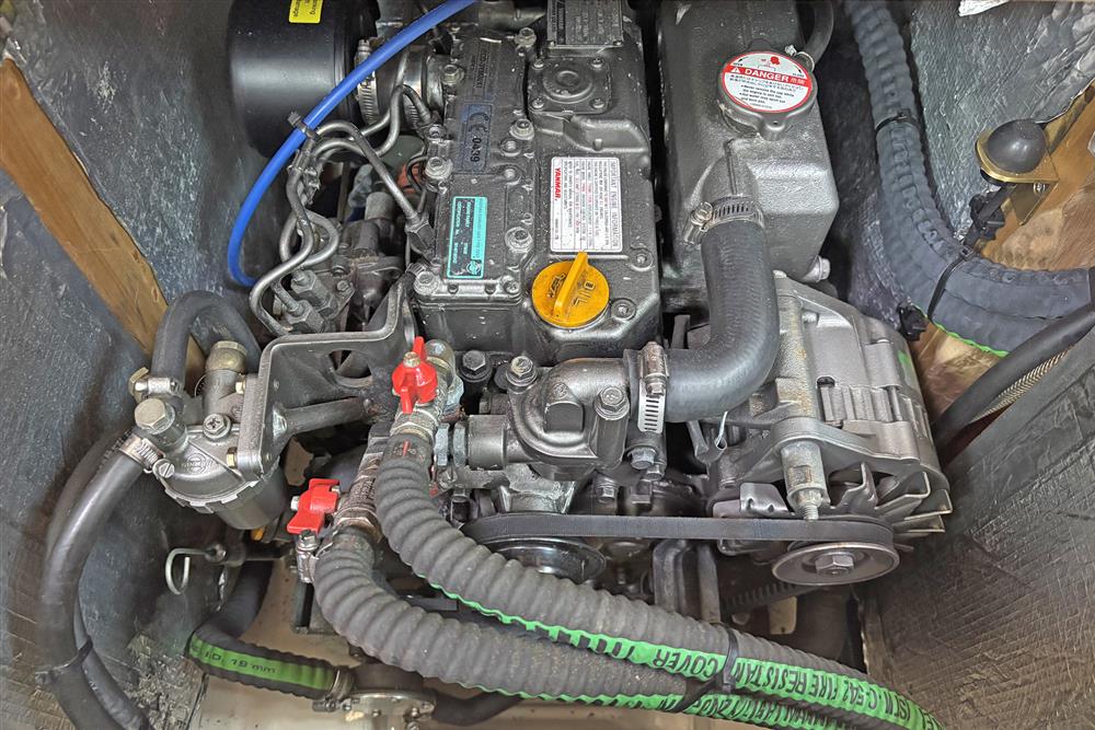 Located under the companionway stairs in a ventilated and insulated engine bay is the Yanmar 3YM30F marine diesel engine fitted in 2007. Three cylinders, 30hp, fresh water cooled via a heat exchanger. Shaft drive to a feathering three bladed propeller. Ambassador rope cutter. Single lever controls. Electric start. 182 litre plastic fuel tank. Annually serviced and winterised by local Yanmar dealers. Vetus double oil filter system with pressure gauge. 55kg BOWTHRUSTER.