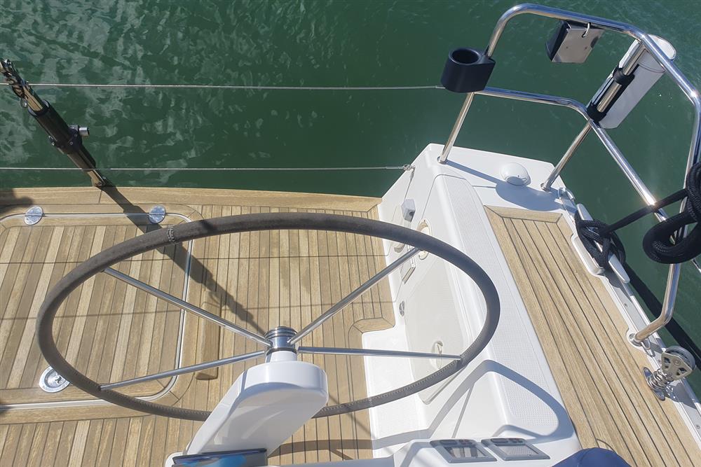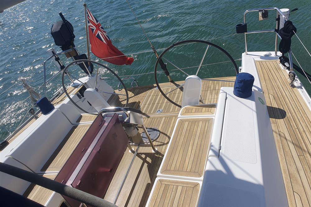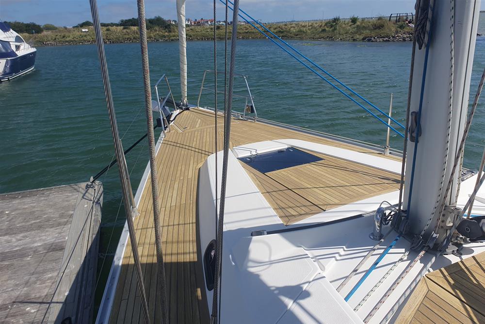 Built in 2008 by Hanse Yachts to a Judel/Vrolijk & Co design. White GRP hull with white decks/superstructure. Underwater hull epoxied and Coppercoated from new and epoxied again in 2018 after removal of the Coppercoat. Teak covered decks, coachroof, cockpit seats and cockpit floor. Cast iron shoal draft fin keel 1.8m/5'11". Spade hung rudder. Twin steering wheels with open self-draining transom. Two large cockpit lockers plus full width lazarette locker. All seacocks replaced between 2021-2023.