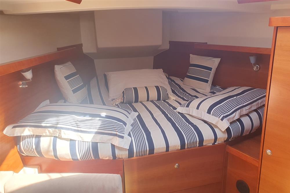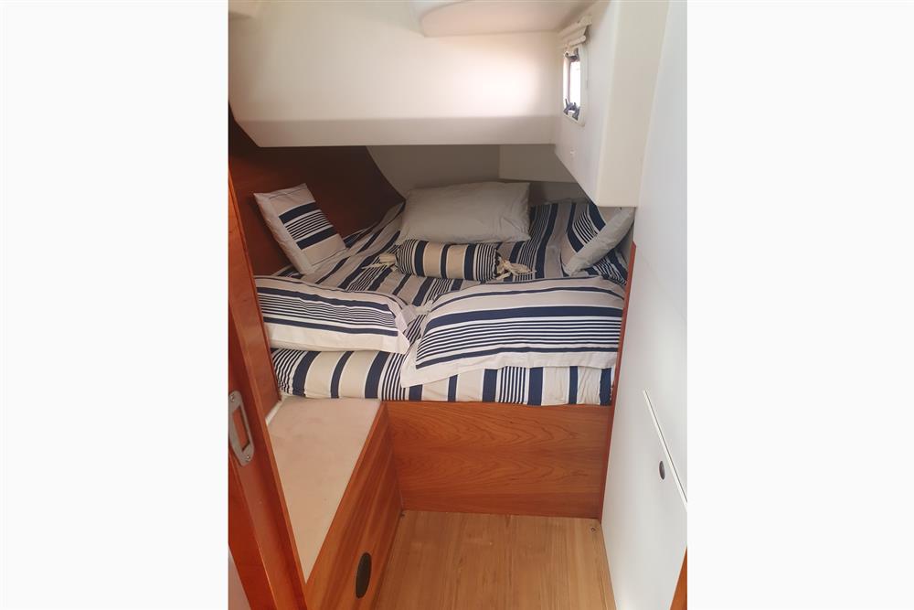 Aft cabins: Two double aft cabins with large double berths, opening hatches and hanging cupboard. Eberspacher Airtronic D5 diesel fired cabin heating system with six outlets. Curtains and blinds to ports and hatches. Navy blue leather upholstery in saloon. Bespoke bedding in sleeping cabins.