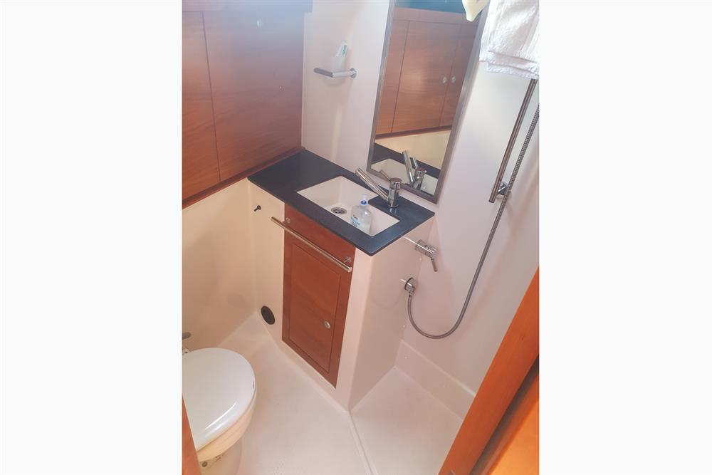 Aft heads: with Jabsco marine toilet (serviced 2024), holding tank and wash basin. Separate shower compartment with seat and electric pump out.