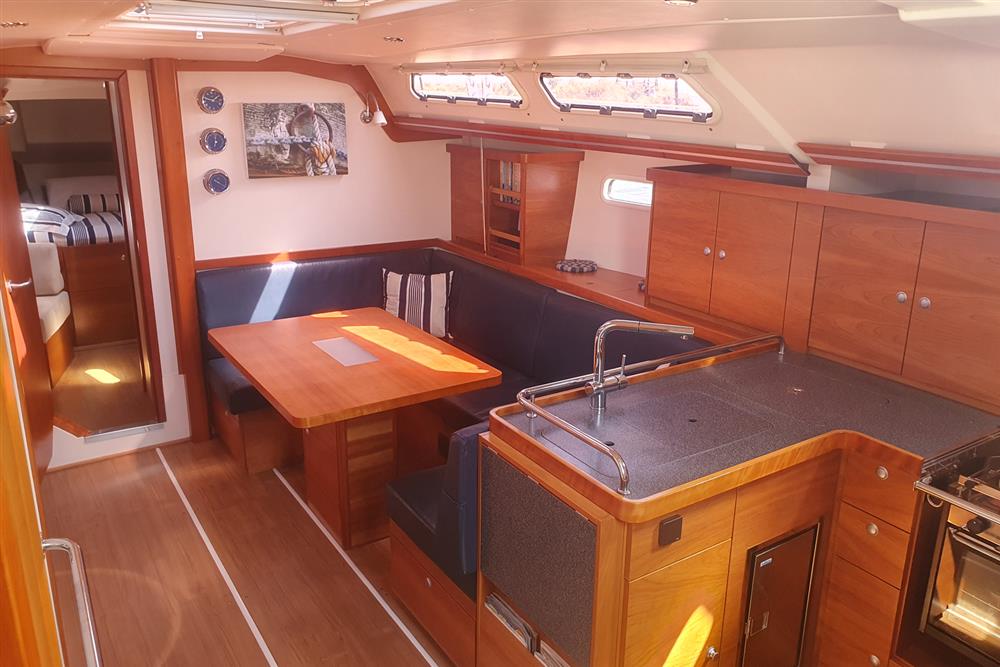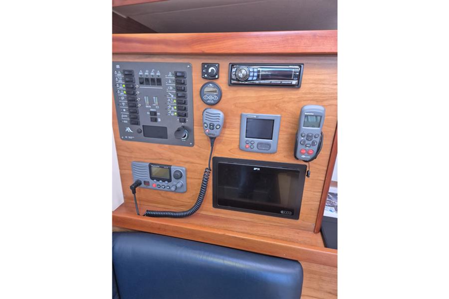 Saloon: C-shaped seating area to starboard with folding dining table. Seating to port with central chart table. Full 12v switch panel, instrumentation and Avtex TV/DVD player. Two opening hatches over saloon and two opening windows on each side of the coachroof.
