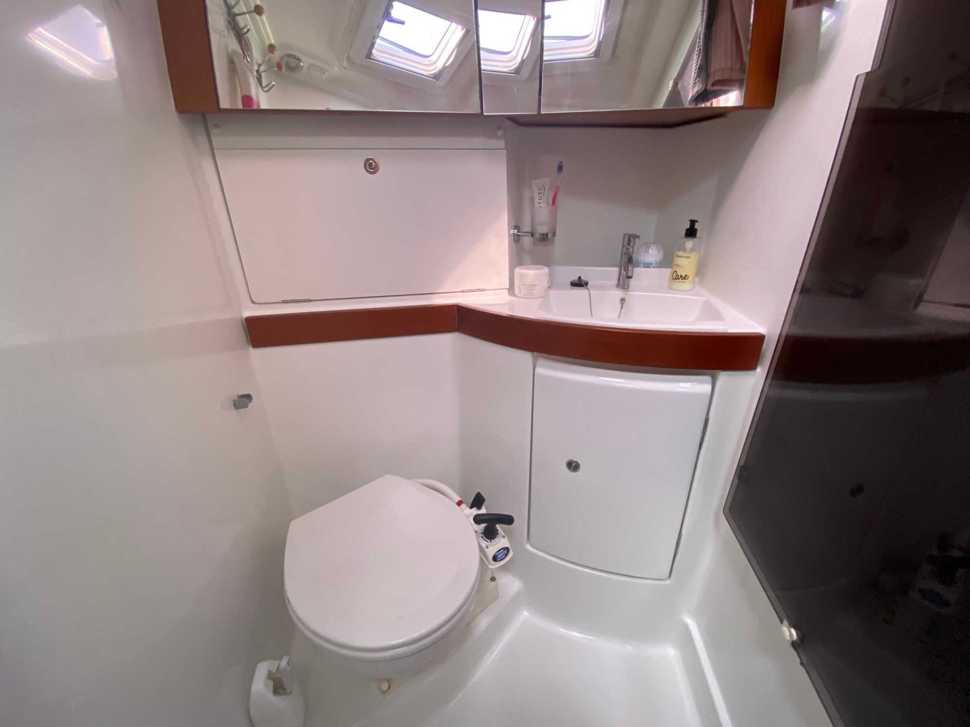 EN SUITE: Separate compartment to starboard with a marine toilet, shower with solid foldout screen, washbasin, mirrors, opening hatch and good storage in various cupboards.