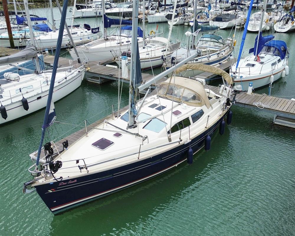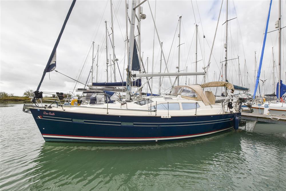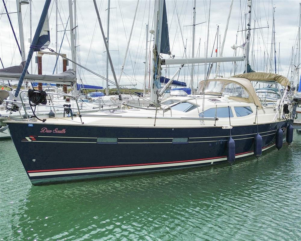 Built by Northshore in 2010 to a design by Rob Humphreys. Dark Blue GRP hull with red and white style stripes. Hull Coppercoated in 2020. Teak toe rails. Off-white GRP superstructure with non-slip decks. Cast iron swing keel (0.72m to 2.18m). Twin spade rudders. Wheel steering. Aft self-draining cockpit. Teak laid cockpit seating and sole. Walk-through transom. Bathing platform. Last surveyed in 2023. Copy available on request.
