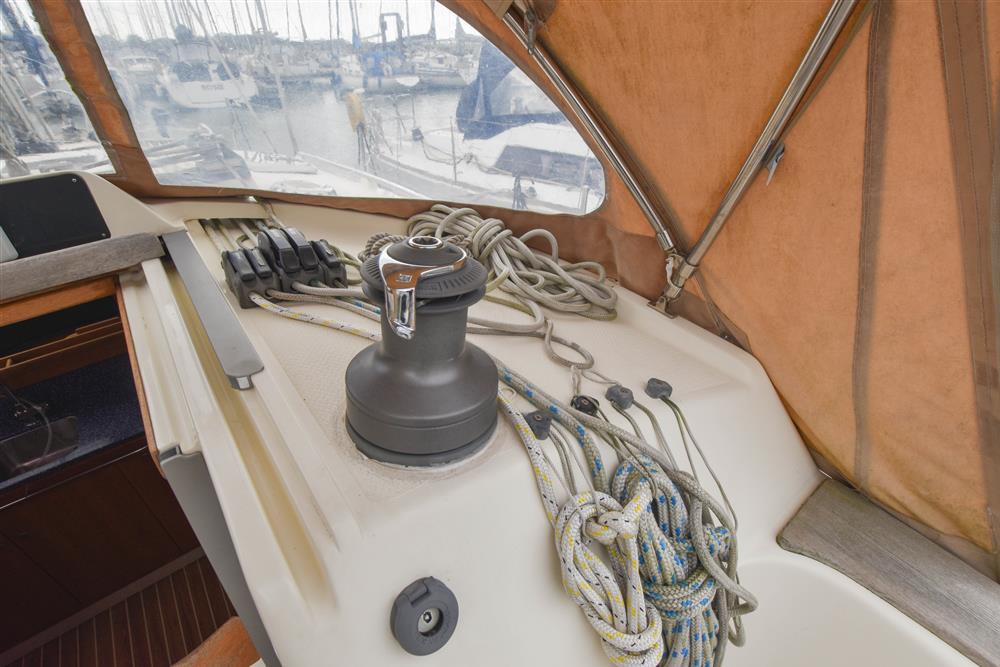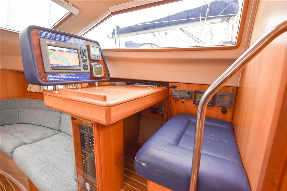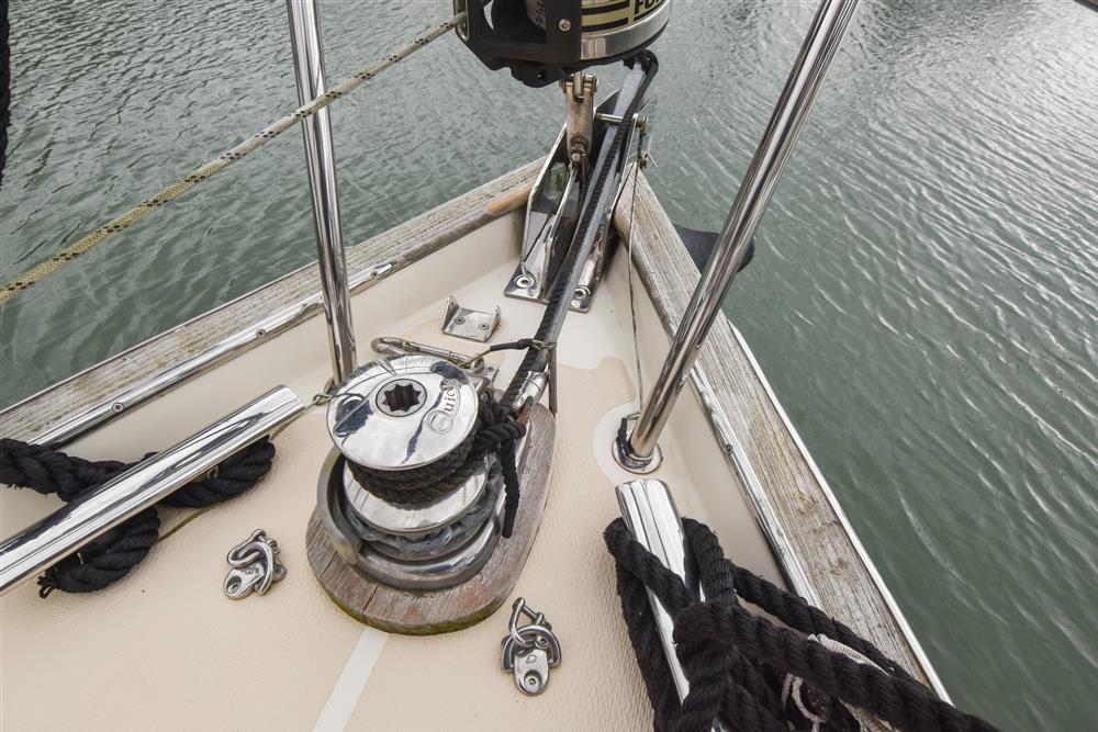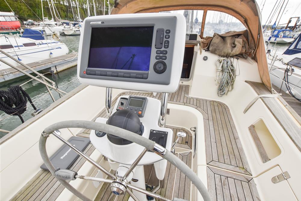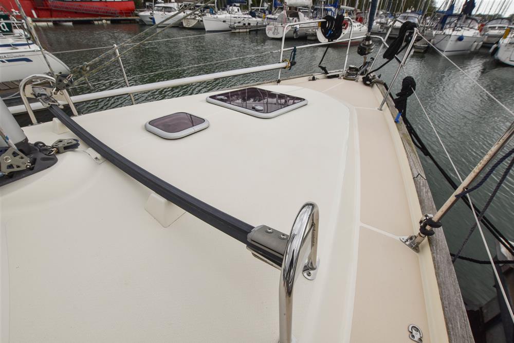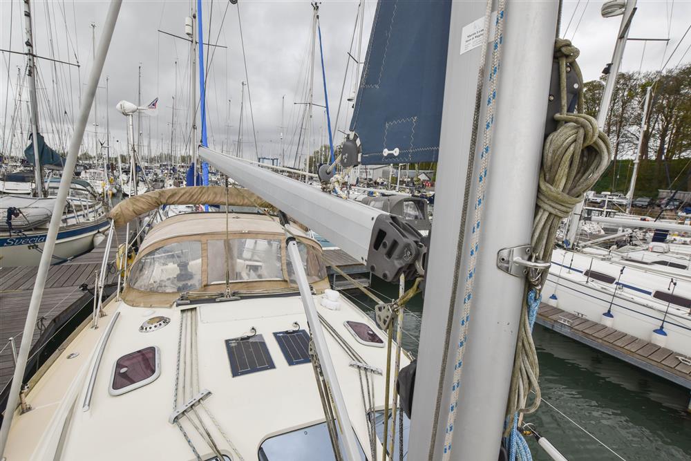 Fractionally rigged Bermudan sloop with the taller mast option. Self tacking jib. Deckstepped alloy mast and boom by Selden Spars (2010). Stainless steel standing rigging (2025). Terylene running rigging. Inmast furling. Furlex headsail furling system. Lines led aft to cockpit. One electric Lewmar 46 self-tailing halyard winch. One manual Lewmar 46 self-tailing halyard winch. Rod kicker. One Lewmar 8 mast winch. Selden whisker pole mounted on port foredeck.