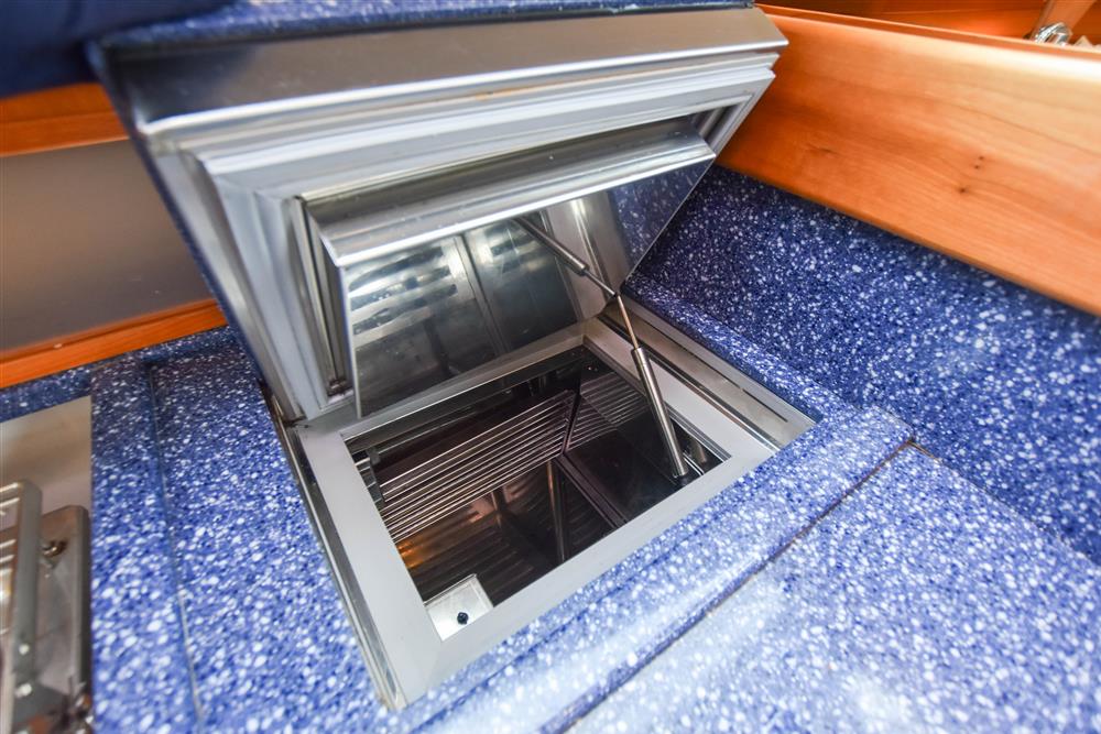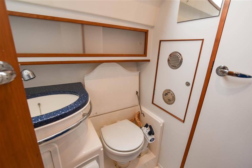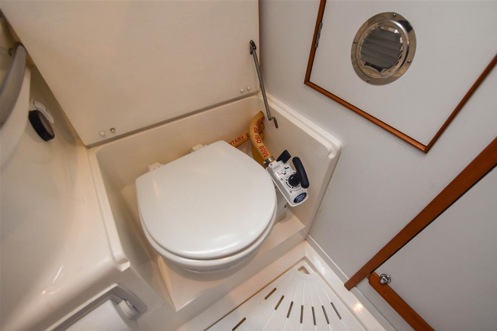 The separate heads compartment is to starboard as you come down the companionway. Jabsco marine toilet with a 78 litre holding tank. Hinged seat to cover marine toilet. Washbasin with Gemini Corian type worktop. Shower head/mixer tap. Stainless steel grab handle. Hot and cold pressurised water supply. Electric shower tray sump pump. Grating to shower tray. Oilskin stowage.