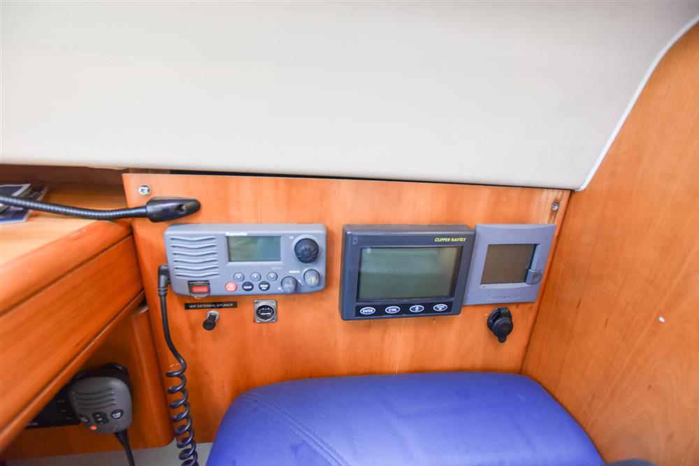 Moving aft into the saloon, there is a large U-shape dinette seating arrangement to port. The saloon table is to centre, which attached to the stainless-steel mast support. The table slides and extends with insert so that you can easily sit 6 people. The table also drops down to convert in to a double berth. Opposite to starboard, there is a single settee. Good stowage around the saloon, with lockers under the seating and handy shelving. Bottle stowage. Four fixed hull portlights. Moving aft again, you step up to the galley and navigation area. The forward-facing chart table is to starboard with some navigation equipment, engine controls and the electrical distribution panel. Blue vinyl cushion to navigators seat. There is excellent visibility through the raised coach roof windows. The L-shaped galley is opposite to port, comprising of twin stainless steel sinks with a hot and cold pressurised water supply, 205 litre capacity. Separate manual cold water supply. Gemini Corian type worktop. Top loading 75 litre fridge. Plastimo gas cooker with two burners, grill and oven. Handy stowage around the galley.