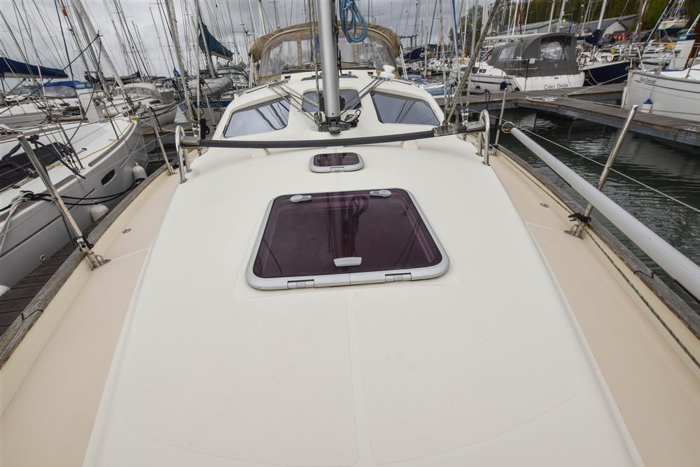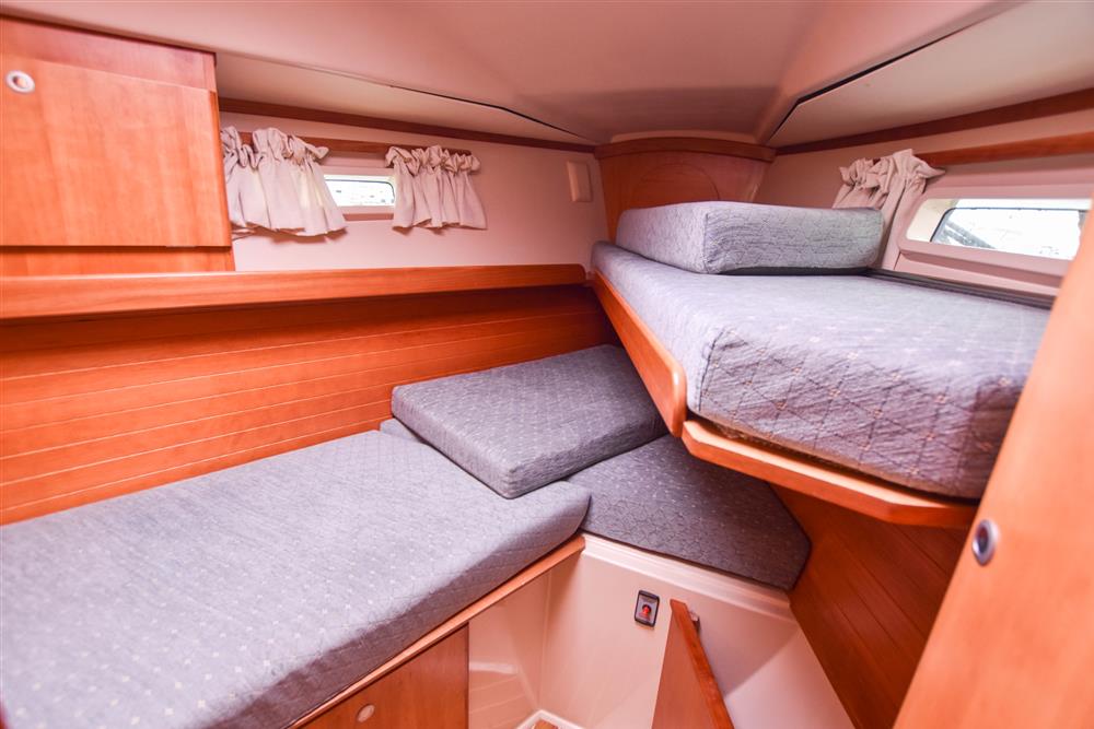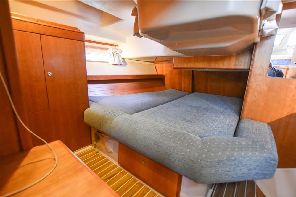 Offering up to 7 berths in well-ventilated interior, with standing headroom throughout and plenty of natural light. Superbly finished in American Cherry joinery which is complimented by the light blue upholstery. Up forward there are three berths (one over & two under). Good stowage, provided by a full-length shelf to port and a hanging locker to starboard. There is access to chain locker, two fixed hull ports and an opening hatch to the foredeck.