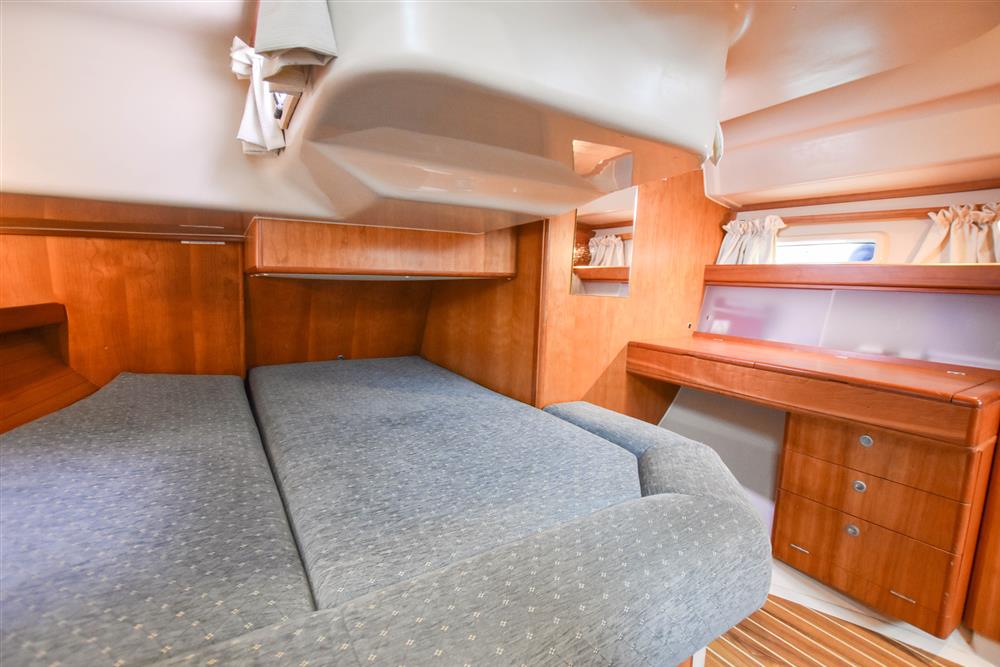 In the stern, there is aft cabin that has a large double berth offset to starboard. Large vanity unit to port with angled acrylic doors, stowage under and outboard. Two drawers. Locker. Shelved wardrobe. Stowage drawer under forward end of double berth. Two reading lights. Two fixed hull ports. Two opening ports to cockpit. Door to en-suite heads facilities.
