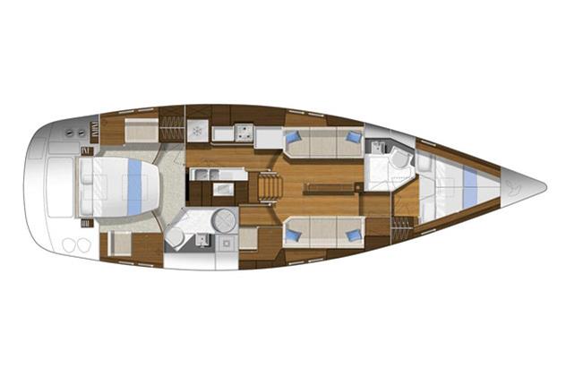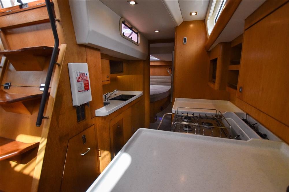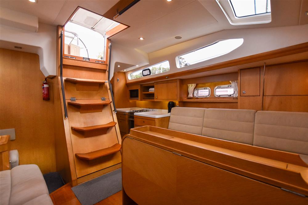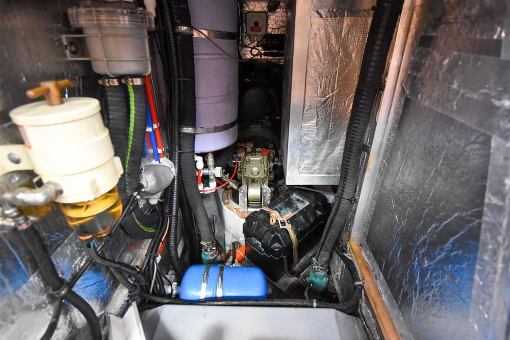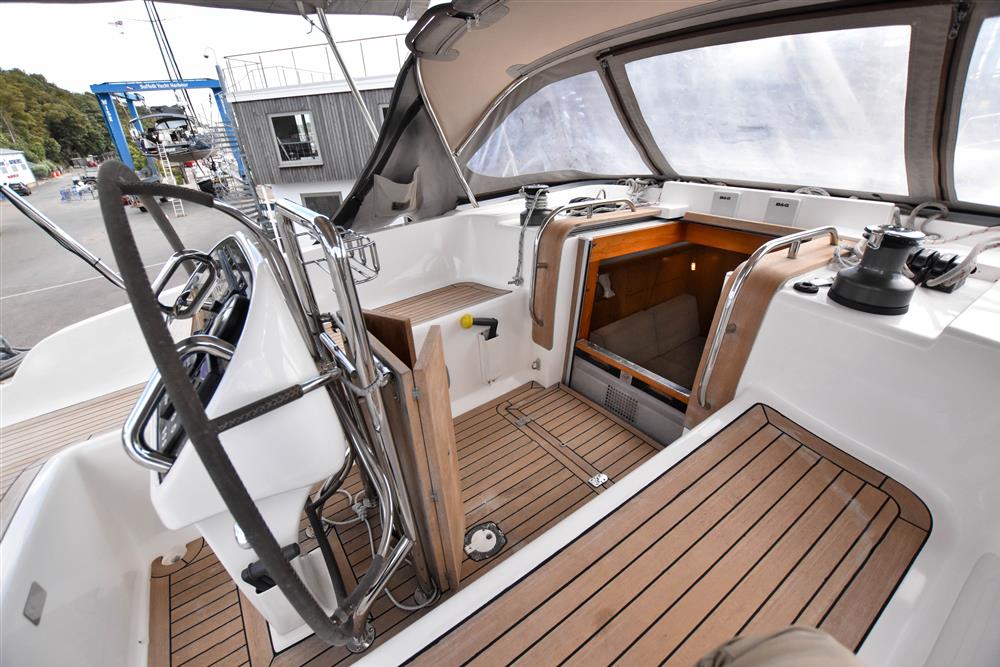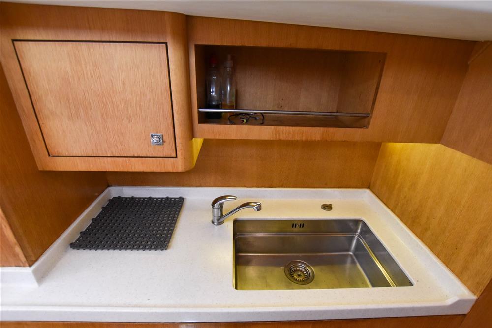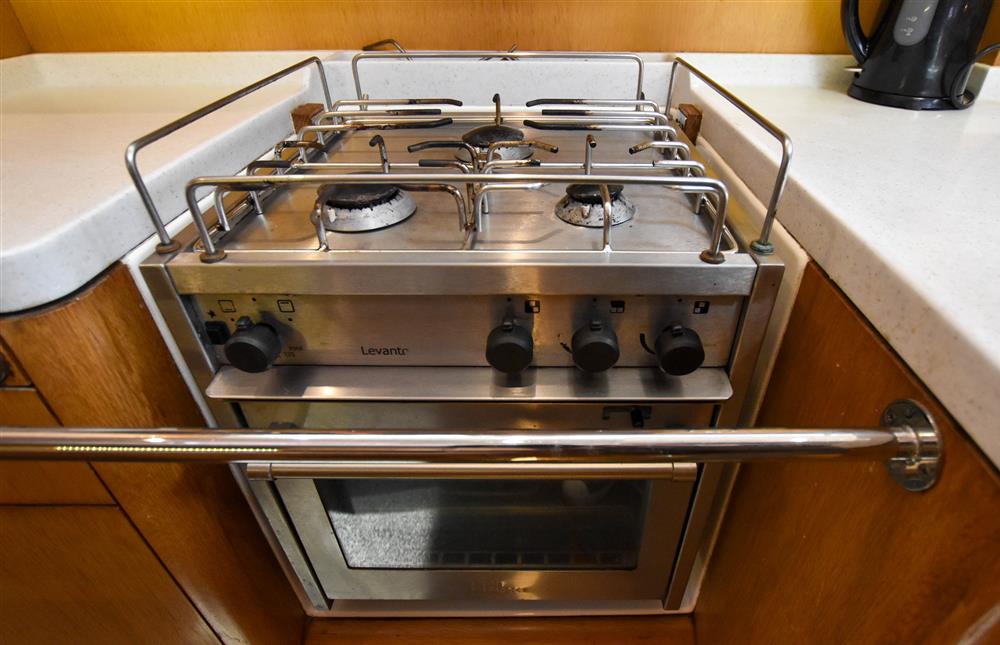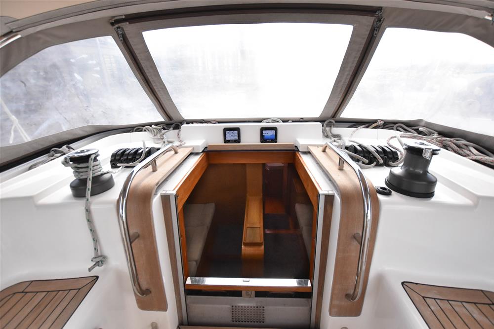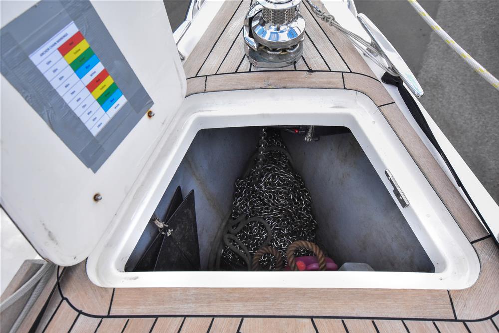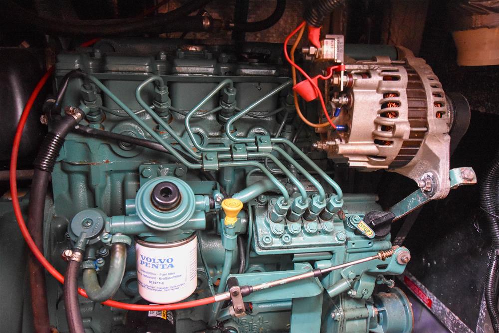 Located under the cockpit. Year 2012 Volvo Penta D2 marine diesel engine. 55hp. Single lever engine control. Saildrive to folding three blade propeller. Rope cutter. New Saildrive diaphragm in 2022. Fresh water cooling. 450 litre fuel tank. 6 knots cruising and 8 knots maximum speed (fouling and loading dependant). 2300 hours logged. The engine is owner serviced annually, last done in September 2024. New exhaust elbow and heat exchanger in 2023. Sleipner retractable bow thruster.