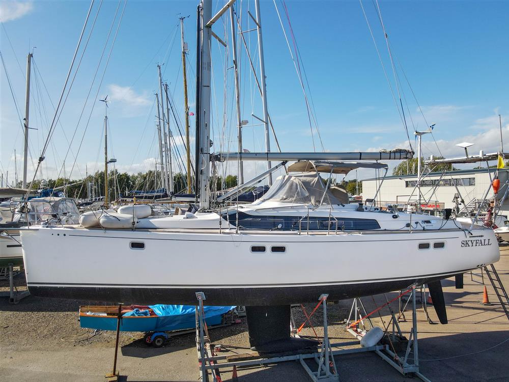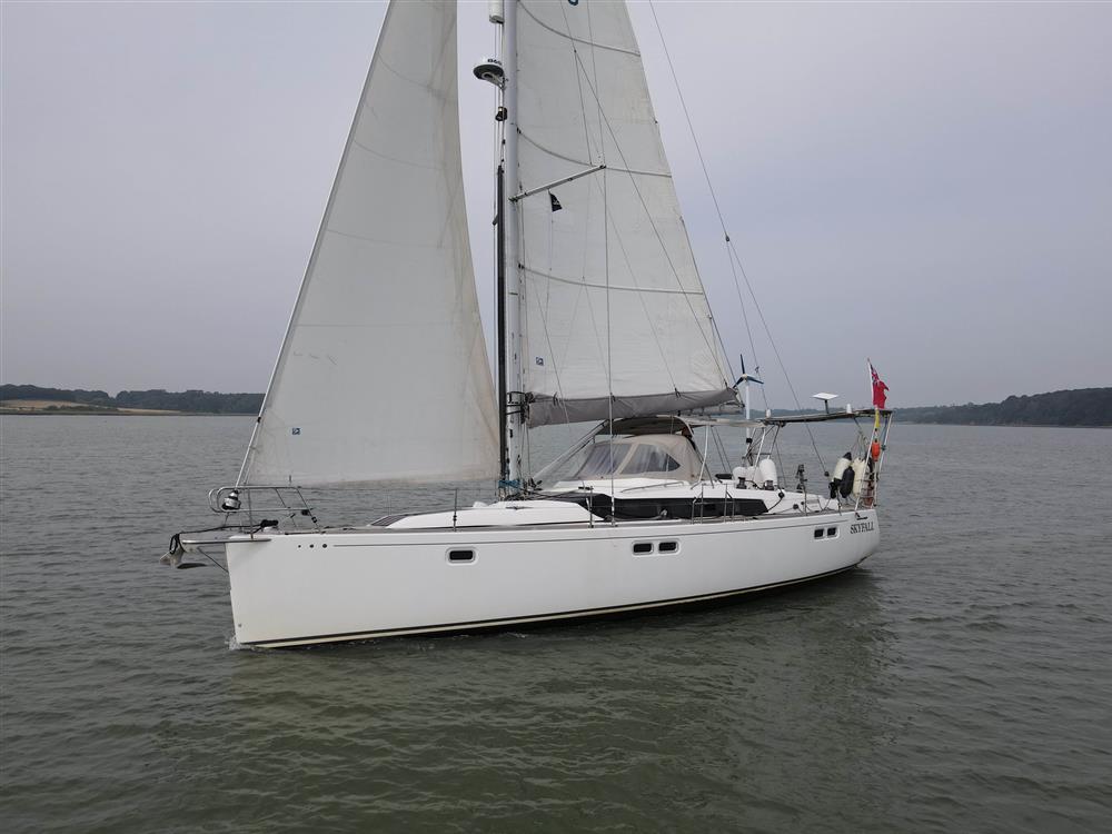 Built by Gunfleet Yachts, Norfolk in 2012 and first launched in 2013. White grp hull with grey style stripes. White grp coachroof with moulded non-skid top deck and teak laid ring decks and cockpit. Teak toe rails. Composite fin keel with cast-iron fin and lead bulb. Wheel steering to spade rudder. Black Micron antifouling. Stainless steel safety rails with side gates. Stainless steel coachroof hand rails. Large lazarette. Twin gas bottle locker. Stainless steel mooring cleats. Large self draining anchor well. Twin bow rollers. Helm seat backrest. Boat last surveyed in 2016 when current Vendor purchased. He has since cruised locally and then completed a four year round the world excursion. Full bog at www.skyfallrtw.com