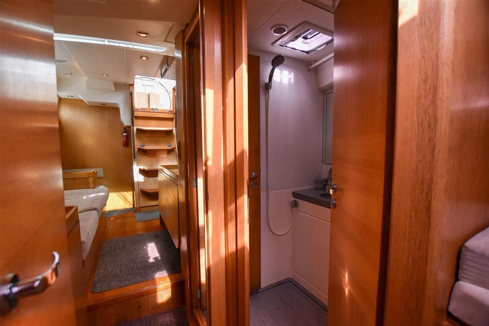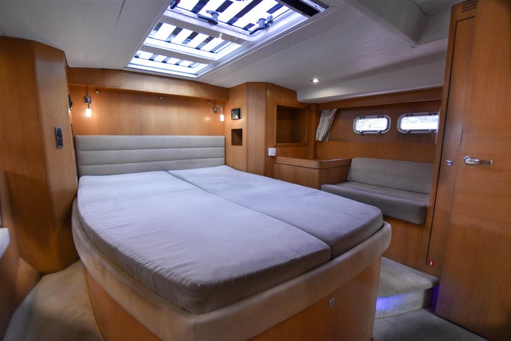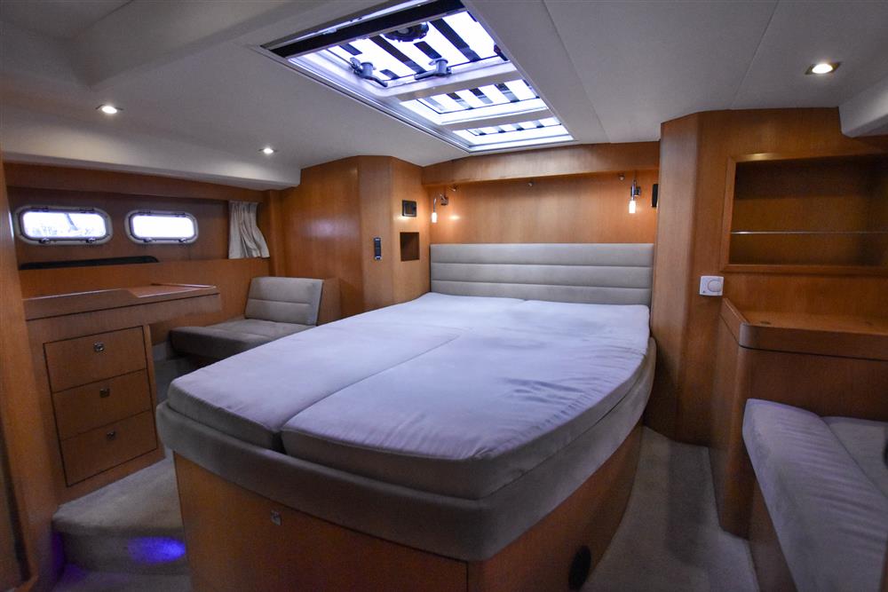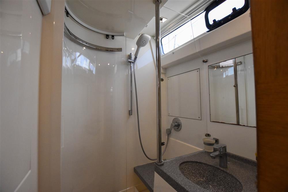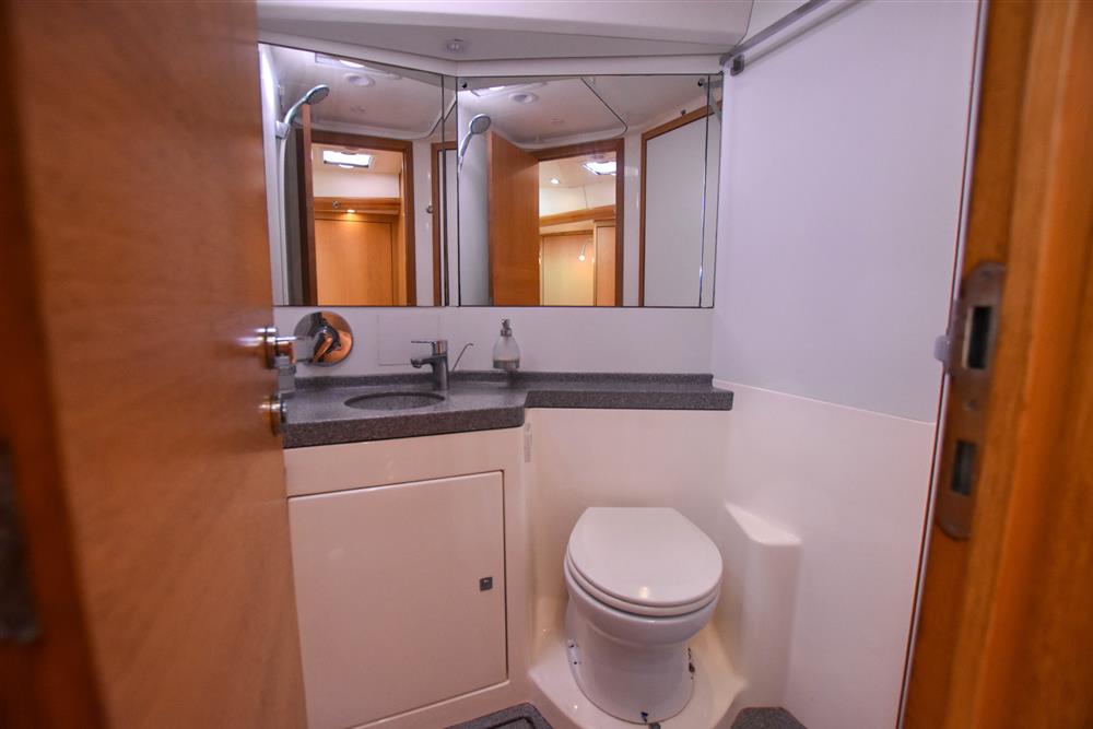 From Forward: Fore cabin with twin berths converting to a double with V berth infill/drop down step. Beige fabric upholstery. Hull ports both sides with large deck hatches. Blinds and screens to hatches. Hanging locker and under berth storage plus shelving and forward lockers. Separate central heating control. Doors to saloon and en-suite heads compartment. Forward heads with Jabsco electric toilet with holding tank. Moulded basin. Shower with curtain rail and electric pump out. Storage locker and large mirrors. Opposite the heads to starboard is a glasses locker, bottle drawer and spares drawer. The saloon has two long settee berths with lee cloths and plenty of storage lockers over. Beige Alcantara upholstery. Centreline saloon table with two large folding leaves and masses of bottle stowage. Four opening hull ports. Pull down Venetian blinds to coachroof windows plus blinds and screens to deck hatches. The forward facing chart table is to starboard. This has a good size chart table and is equipped with a B&G chart plotter, Racor fuel system alarm, Seafire fire suppression system, Fusion stereo, Simrad RD65 VHF radio, C Zone multi remote electronic control system, hand held VHF radio & Starlink system. The galley is to port of the companionway. This has a large stainless steel sink on the centreline, Sharp microwave oven, Levanto stainless steel cooker with three burners and oven, Corian worktop, Frigoboat stainless steel front loading fridge and separate freezer, plus multiple storage lockers and drawers. The aft cabin has a centreline double berth with drawer under. Easy chair to port with large locker and hanging lockers either side. To starboard is a vanity desk with seat. C Zone multi control system and Navtex. Large deck hatches with blinds and screens. Hull ports. The en-suite heads compartment is to starboard and is equipped with a Jabsco electric marine toilet with holding tank, moulded basin and shower with curved Perspex shower screen.