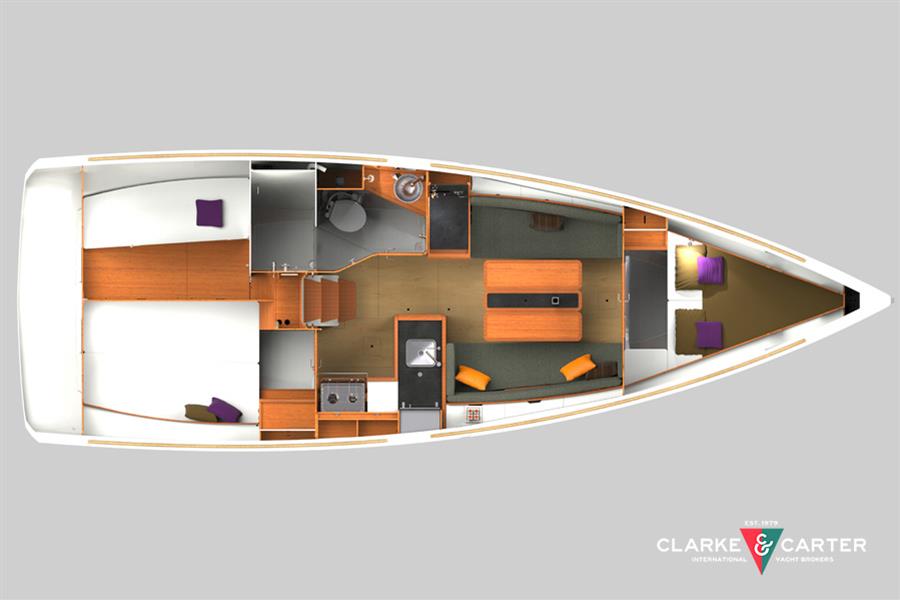 Offering six berths with two separate double cabins. Teak interior fit out. Laminate floorboards. Up in the forward Cabin, there is a large central double berth with stowage under. Hanging locker, eye level shelving and a deck opening hatch. Stepping aft in to the saloon, there are two single settee berths either side of a folding double drop leaf table. Brown upholstery to the saloon. Good stowage around the saloon. The L-shaped galley is to starboard counter tops, chrome plumbing fittings and storage cabinets. Stainless steel, top opening 100 litre fridge and gas cooker with two burners, grill and oven. Microwave. The navigation Station is opposite to port with the electrical distribution panel, chart light and some navigation equipment. The whole table lid hinges up to stow out of the way when in port. Extra chart storage. The separate heads compartment is aft, which comprises of a sink, clothes hook, mirror and cabinet above the sink. Wet locker with hanging bar. Marine toilet with holding tank. Shower with electric pump out and Perspex shower door. White laminate finish to heads compartment with additional opening port. Access door from shower compartment to very large cockpit locker. In the starboard quarter, is the large aft cabin with a spacious double berth, deep cabinet with shelving and hanging rail, reading light and LED ceiling lights, hull shelf. Shades and screens for hatches and ports. Planar 44D diesel fired central heating system. Hot and cold pressurised water supply throughout. TV with Apple tv.
