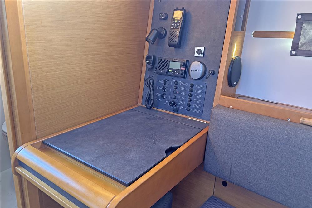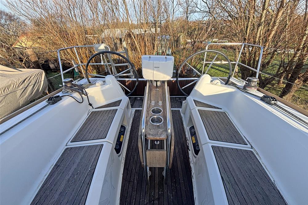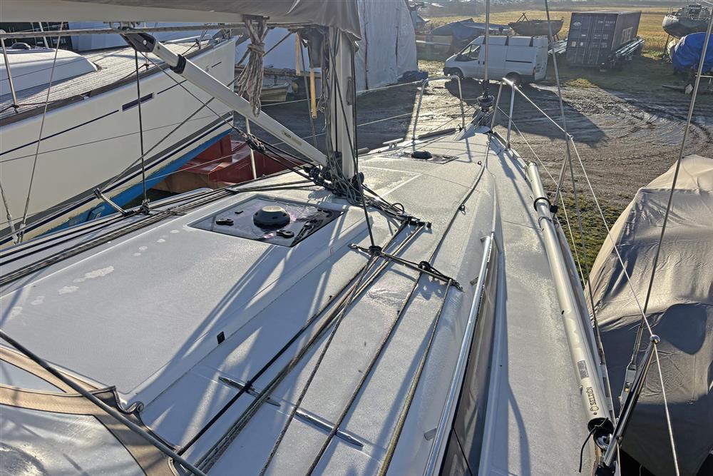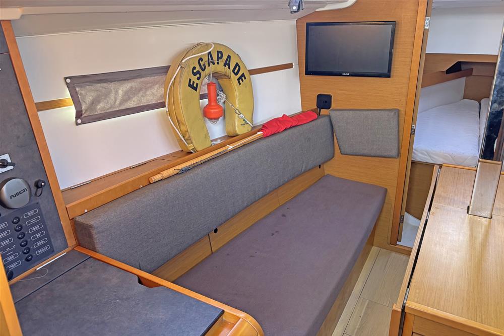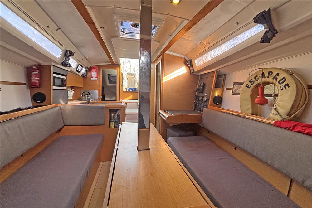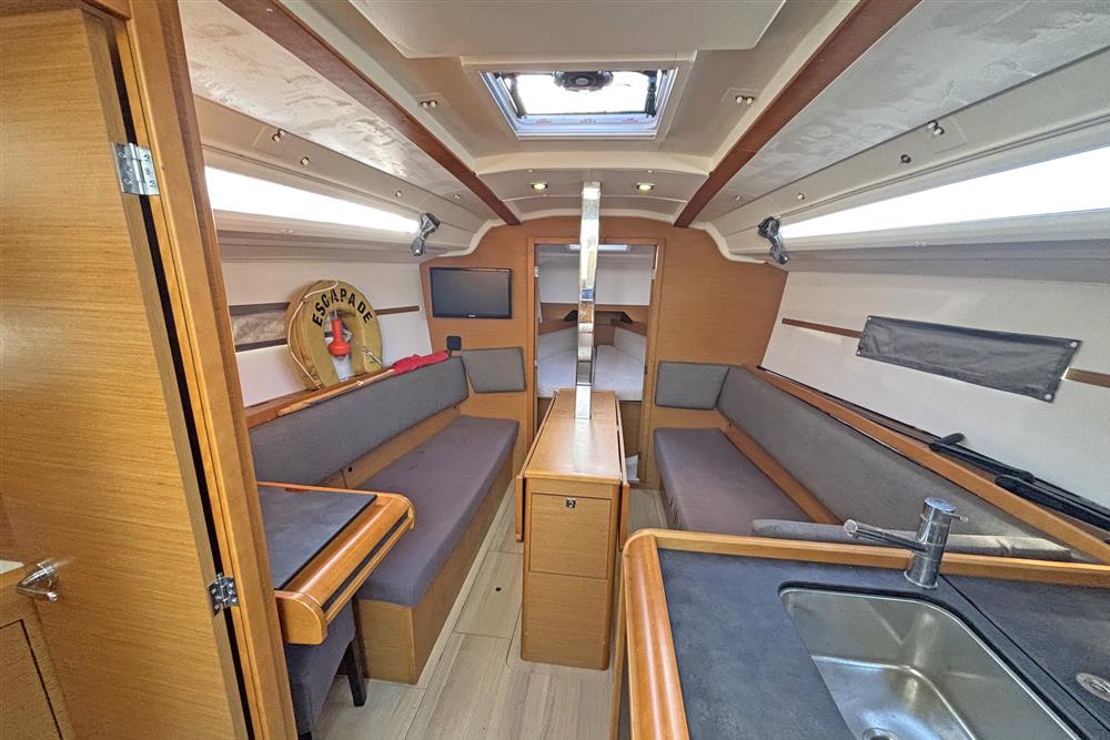 Built by Jeanneau in 2014 to a Marc Lombard design. White GRP hull with style stripes. White GRP coachroof with moulded in non-skid decks. Cast iron swing keel. Electric hydraulic keel mechanism. Wheel steering to twin balanced rudders on stainless steel shafts. Teak slats to cockpit seats and folding transom platform. Teak effect toe rails. Self-draining cockpit and anchor well. Large cockpit locker and life raft locker in cockpit sole. Enclosed port side locker under cockpit seat.
