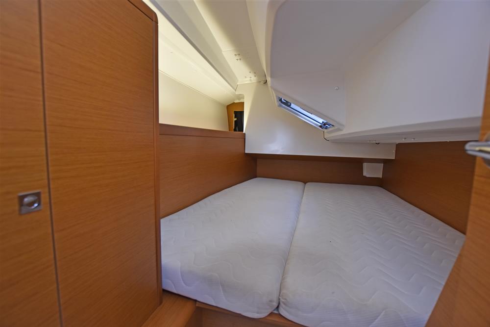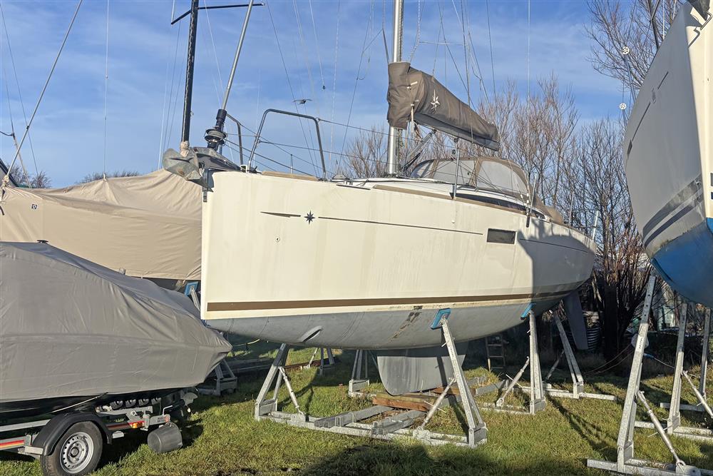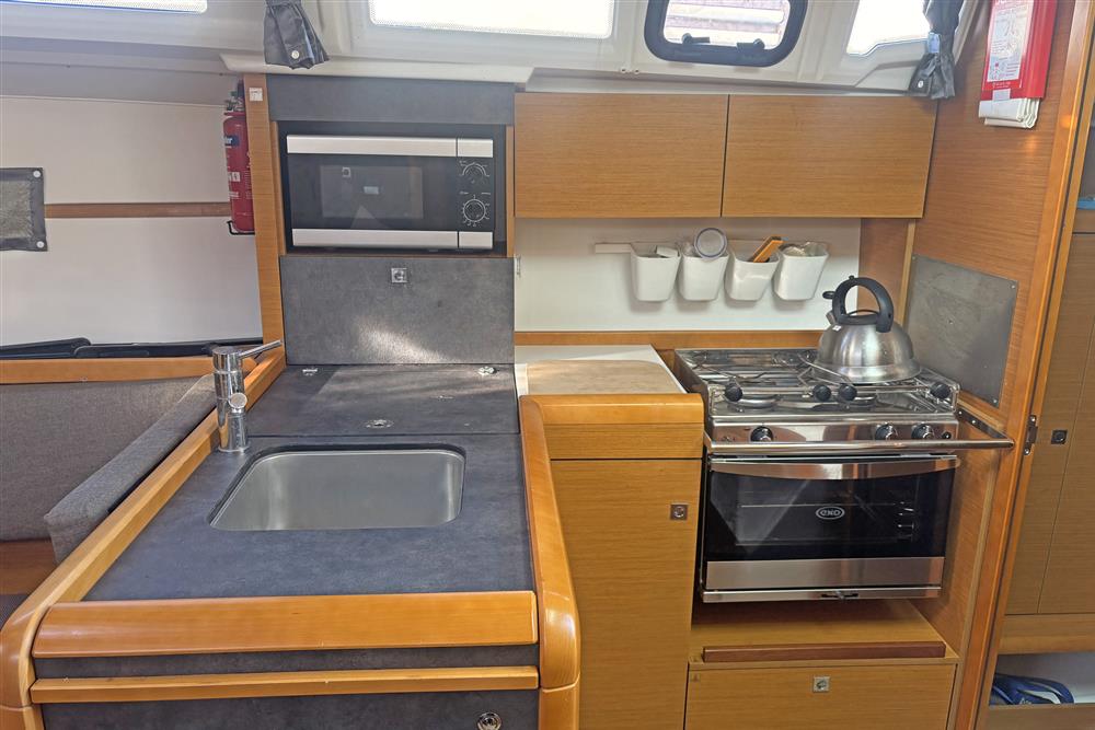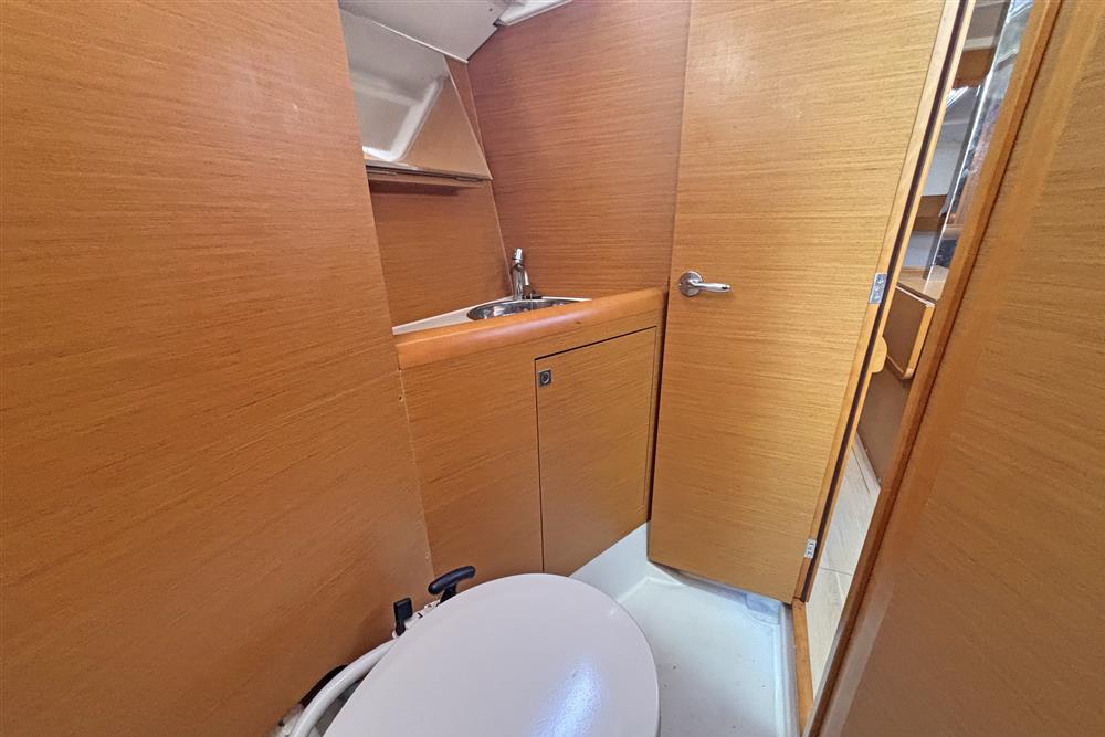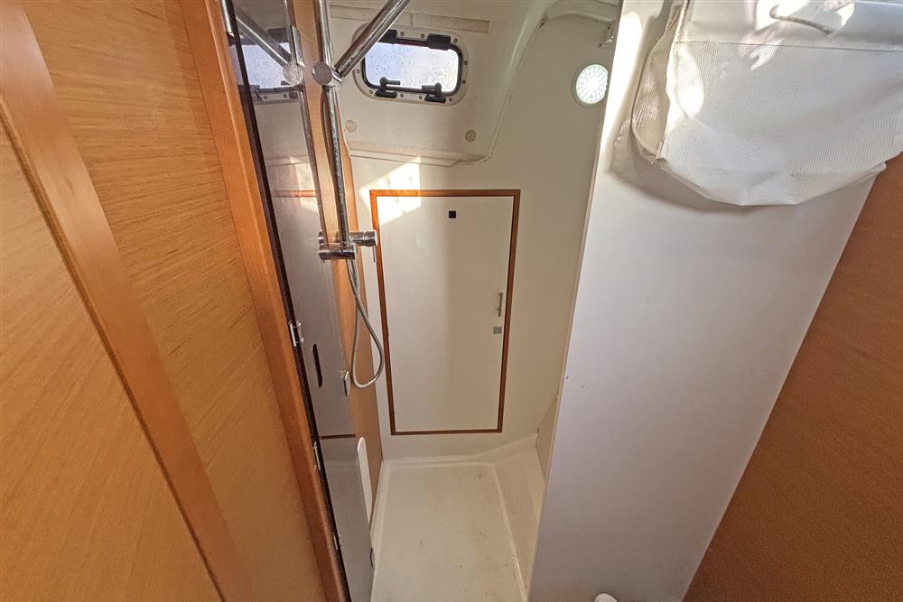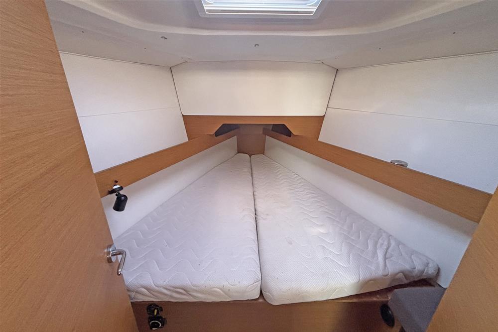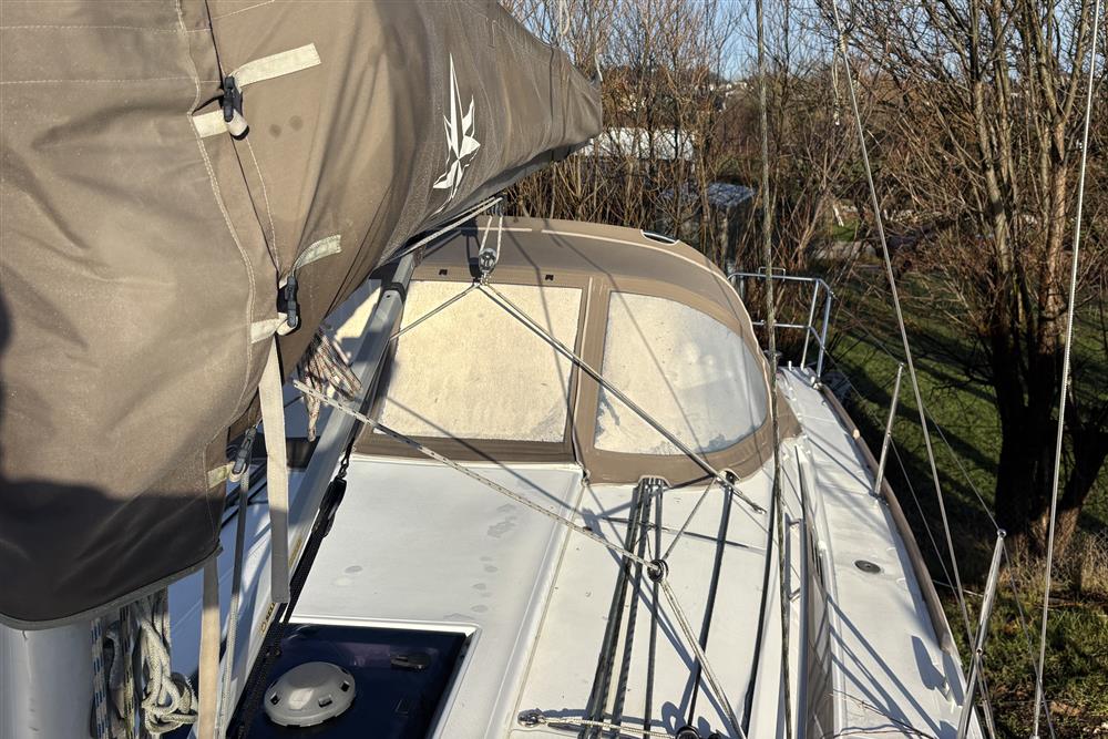 Built by Jeanneau in 2014 to a Marc Lombard design. White GRP hull with style stripes. White GRP coachroof with moulded in non-skid decks. Cast iron swing keel. Electric hydraulic keel mechanism. Wheel steering to twin balanced rudders on stainless steel shafts. Teak slats to cockpit seats and folding transom platform. Teak effect toe rails. Self-draining cockpit and anchor well. Large cockpit locker and life raft locker in cockpit sole. Enclosed port side locker under cockpit seat.