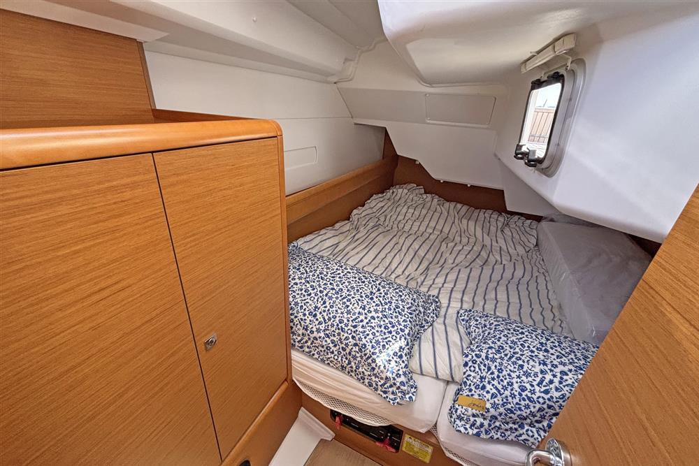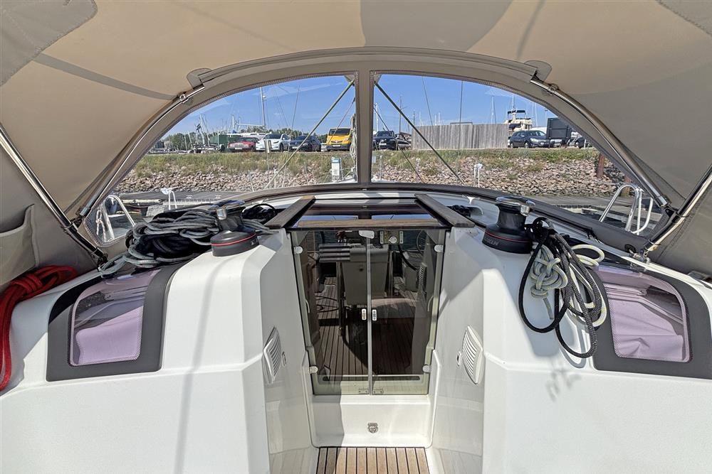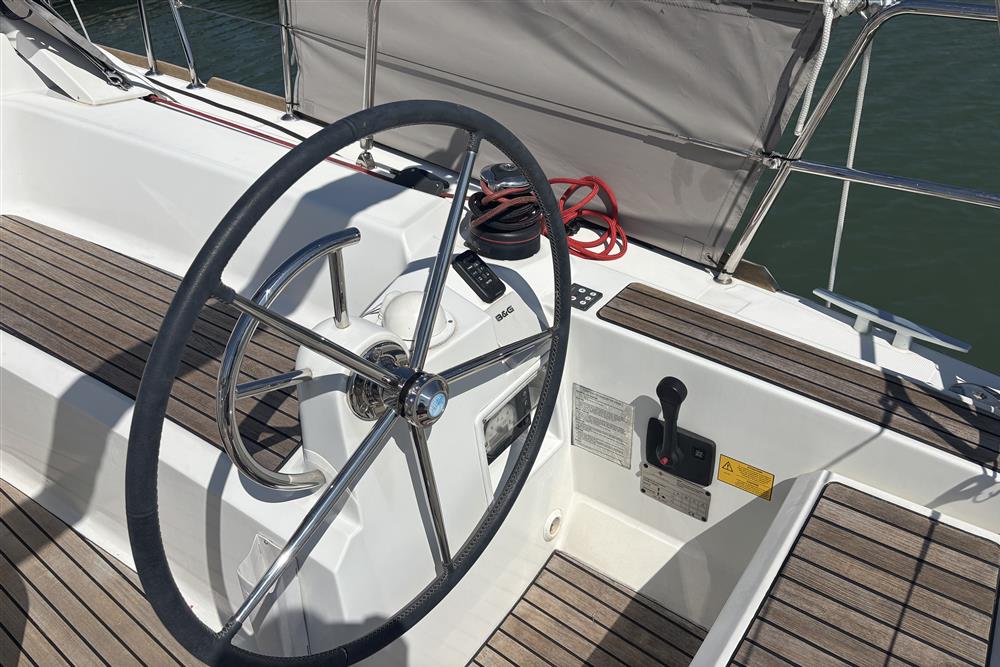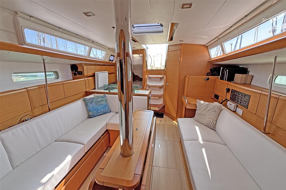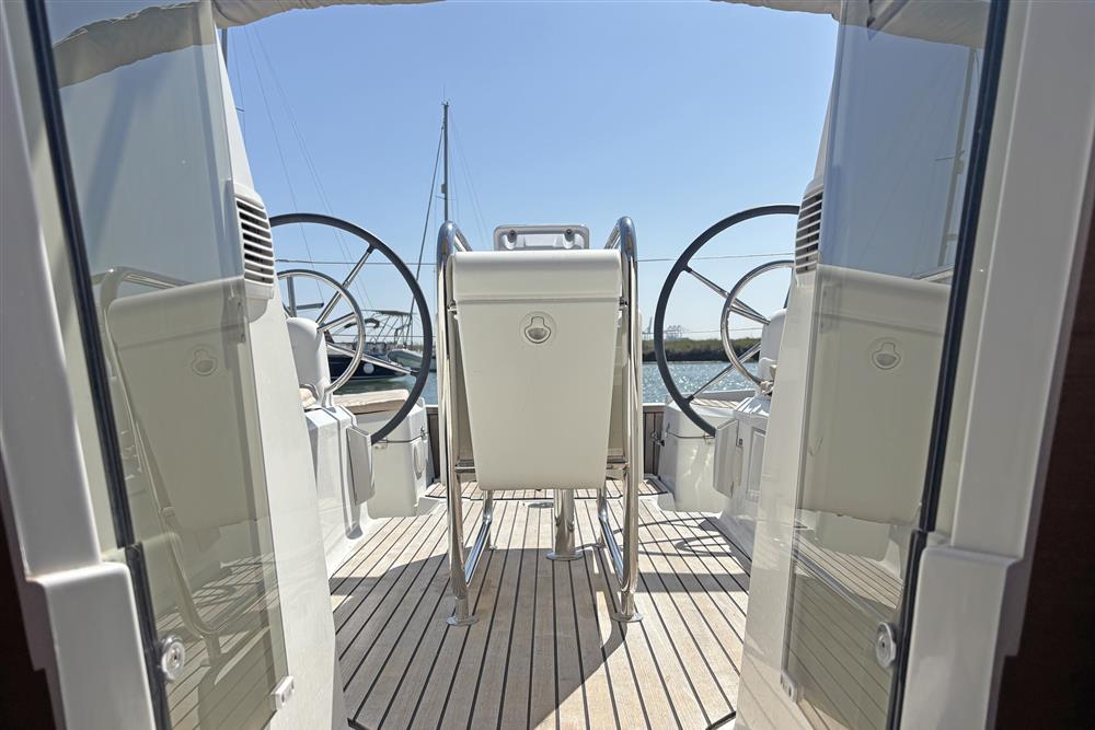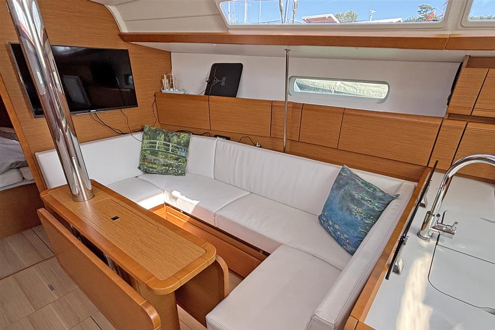 Giverny is the 2 cabins owners version layout, which offers up to 6 berths. Her interior is fitted out with teak woodwork and plenty of natural light and good ventilation. In the forward cabin, there is a large double berth with access to the bowthruster and water tank underneath, deep cabinet with hanging lockers and shelves. Deck opening hatch. Moving aft into the saloon, there is a large U shaped settee to starboard with luxury saloon table option and double berth conversion kit, upper storage cabinets, seating to port with storage locker forward and ceiling handrail. Aft facing chart table with storage and laptop space. Wet locker aft of chart table. Ambiance pure white leatherette saloon upholstery. The L shaped galley is to starboard with double stainless-steel sinks (hot and cold pressurised fresh water system, 40 litre hot water tank and tank gauge), large fridge with access from top and front opening door, gimballed two burner gas cooker with grill and oven, and a vast amount of stowage. Additional water tank. The separate heads compartment is opposite to port with a basin, shower with divider plus marine toilet with holding tank. Door to very large stowage to aft of heads compartment. Large double cabin in the starboard aft with hanging locker. Shades and screens for hatches and ports. Laminate flooring throughout. Flush mounted LED ceiling lights. Fusion RA210 stereo system (2022) with Bluetooth plus saloon and cockpit speakers. Webasto diesel fired central heating system. Bulkhead mounted TV. Fitted sheets for forward and aft cabins.