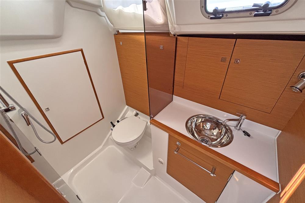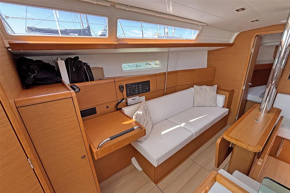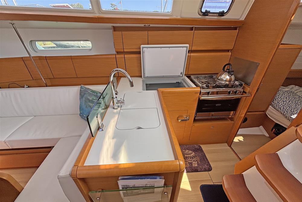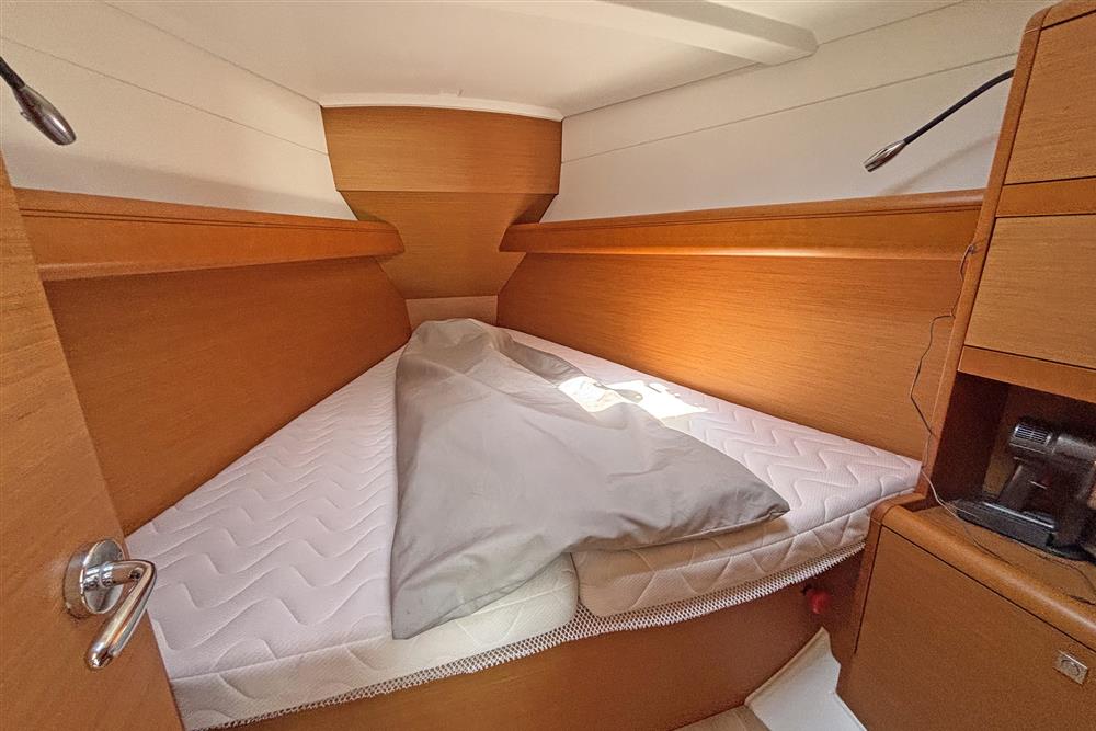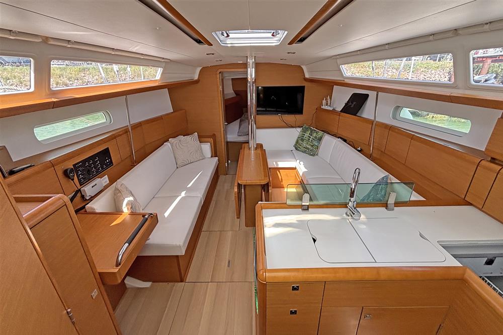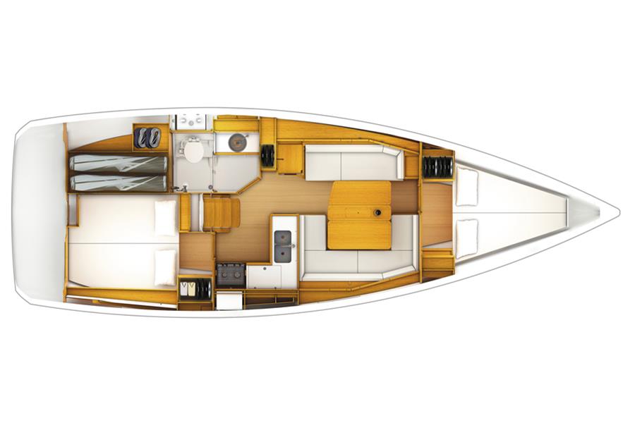 Giverny is the 2 cabins owners version layout, which offers up to 6 berths. Her interior is fitted out with teak woodwork and plenty of natural light and good ventilation. In the forward cabin, there is a large double berth with access to the bowthruster and water tank underneath, deep cabinet with hanging lockers and shelves. Deck opening hatch. Moving aft into the saloon, there is a large U shaped settee to starboard with luxury saloon table option and double berth conversion kit, upper storage cabinets, seating to port with storage locker forward and ceiling handrail. Aft facing chart table with storage and laptop space. Wet locker aft of chart table. Ambiance pure white leatherette saloon upholstery. The L shaped galley is to starboard with double stainless-steel sinks (hot and cold pressurised fresh water system, 40 litre hot water tank and tank gauge), large fridge with access from top and front opening door, gimballed two burner gas cooker with grill and oven, and a vast amount of stowage. Additional water tank. The separate heads compartment is opposite to port with a basin, shower with divider plus marine toilet with holding tank. Door to very large stowage to aft of heads compartment. Large double cabin in the starboard aft with hanging locker. Shades and screens for hatches and ports. Laminate flooring throughout. Flush mounted LED ceiling lights. Fusion RA210 stereo system (2022) with Bluetooth plus saloon and cockpit speakers. Webasto diesel fired central heating system. Bulkhead mounted TV. Fitted sheets for forward and aft cabins.