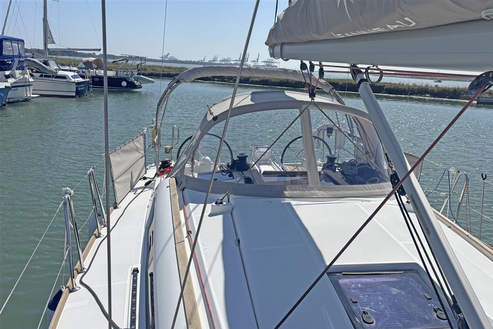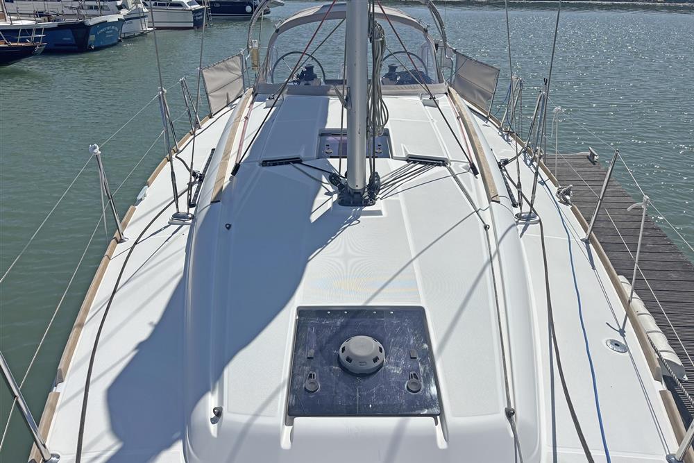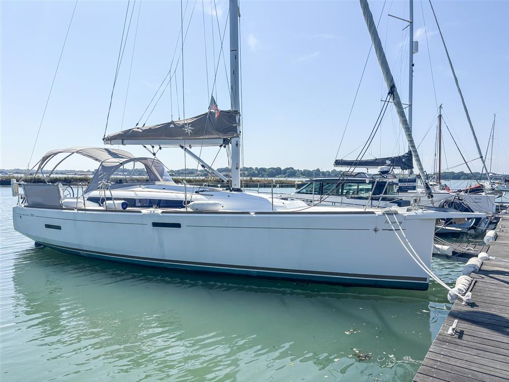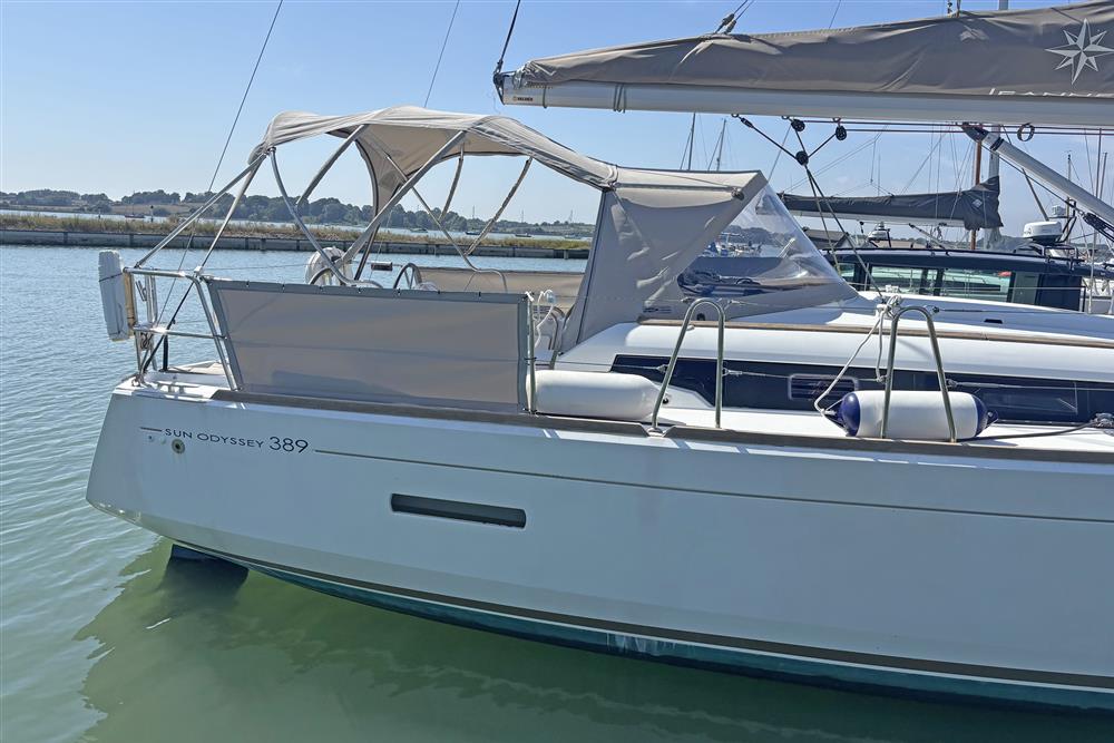 Sun Odyssey 389 built by Jeanneau in 2015 and commissioned in 2017 to a design of Marc Lombard. White grp hull with style stripes. Coppercoat epoxy system to hull from new. White grp coachroof with moulded non-skid decks. GRP bowsprit. Cast iron shoal fin keel. Twin wheel steering system to two spade hung rudders. Self-draining cockpit and anchor well. Wood to cockpit seats, sole and transom. Large cockpit and lazarette lockers. Life raft locker. Washboard storage. Gas locker for twin bottles. Wood coach roof hand rails. Large fold down swim platform with telescopic ladder. Large twin leaf cockpit table.