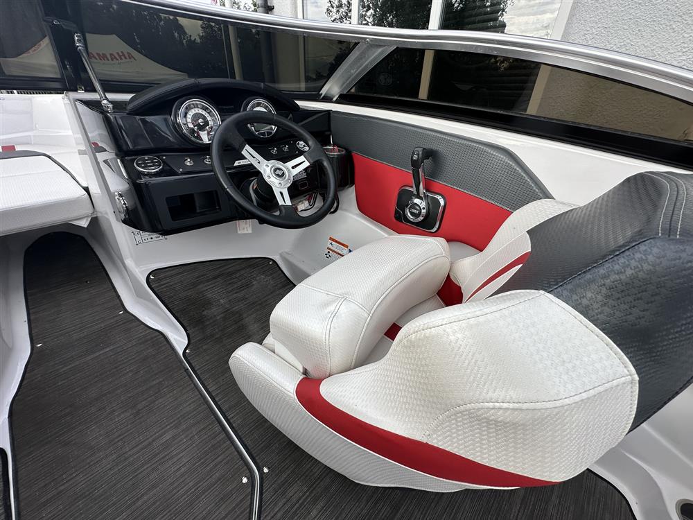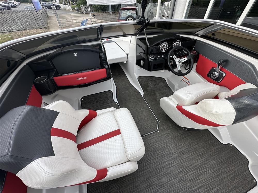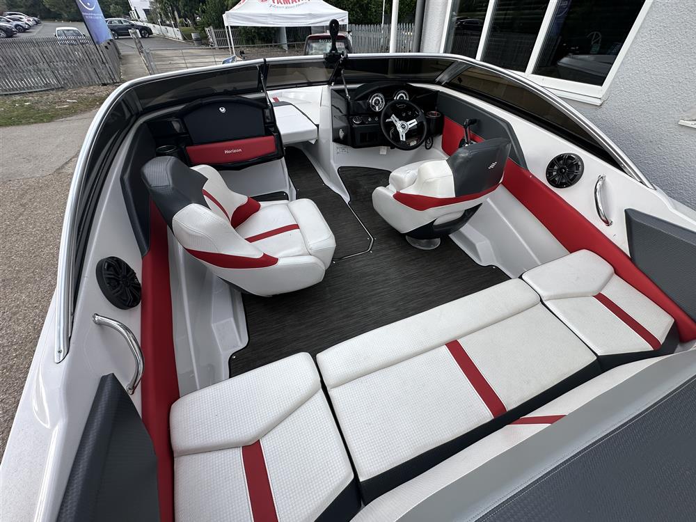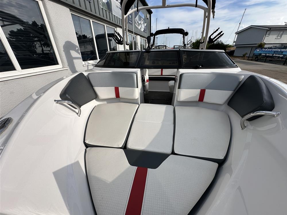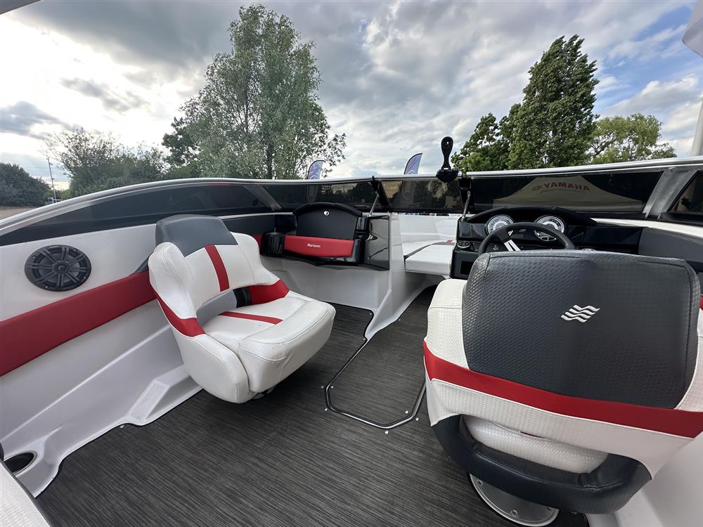 Open cockpit with bowrider seating in grey, white and red trim. Helm and navigator seats with bolsters that swivel. Infill cushion for bow seating that forms a sunpad. Quick drying carpet.