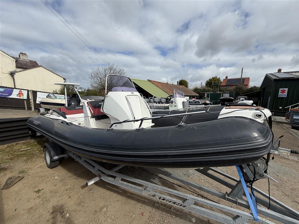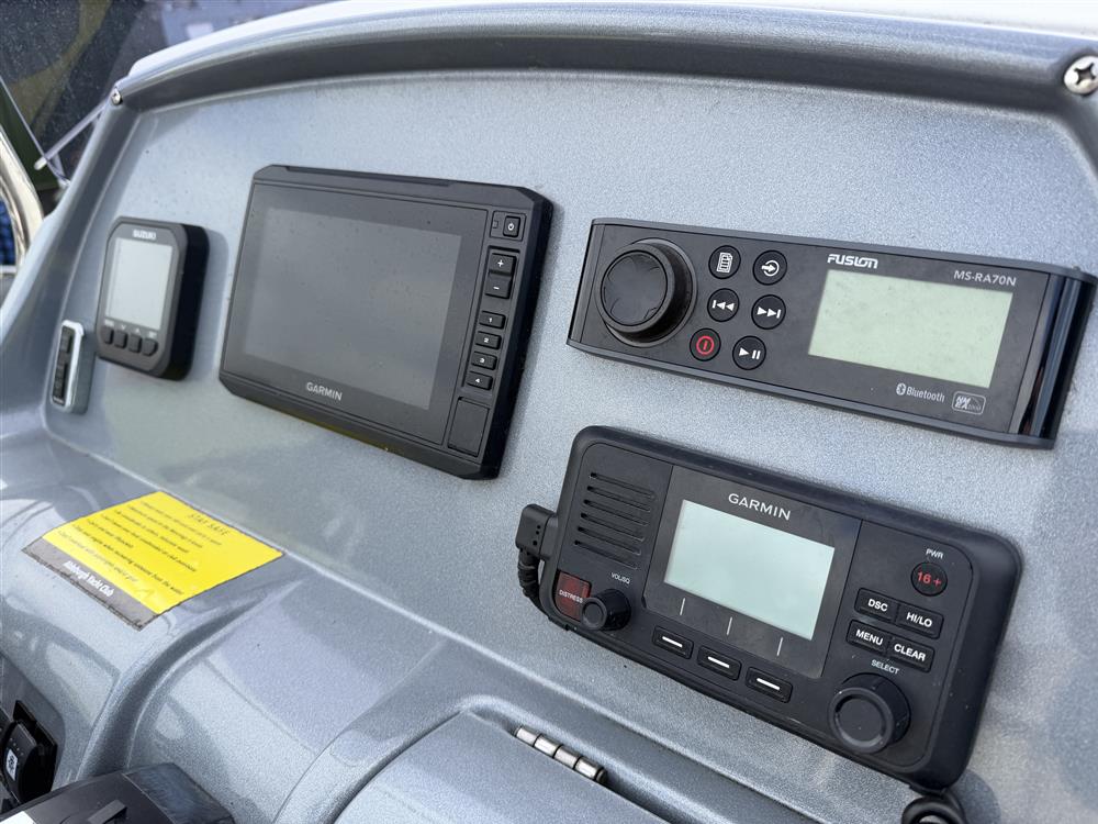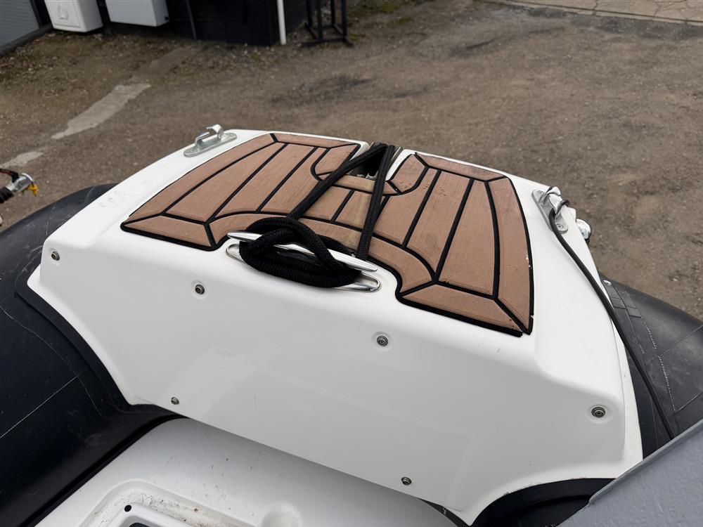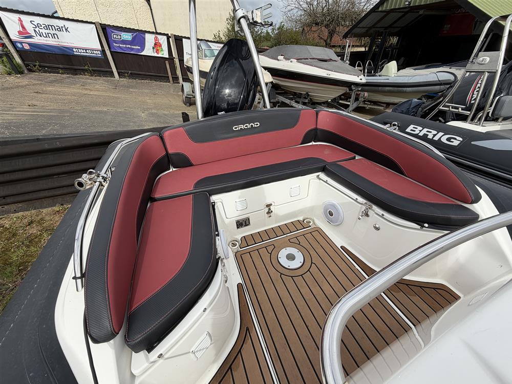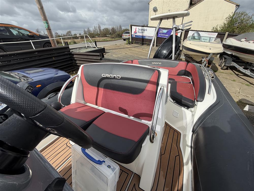 Built by Grand Boats, 2020. White GRP deep V hull with black ORCA Hypalon multi chamber tubes. Self draining deck. SeaDek laid floor. Under seat, bow and console storage lockers. Dual console with windscreen and stainless handrail. Category C RIB.