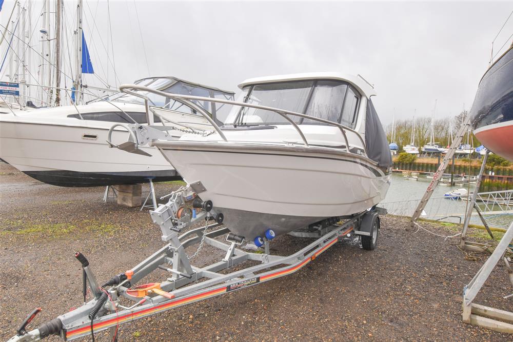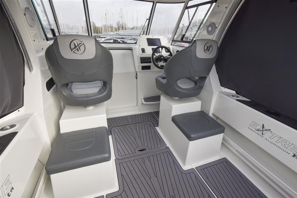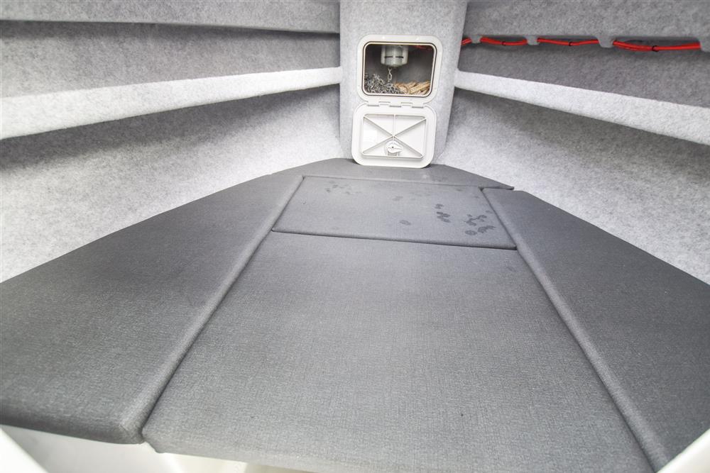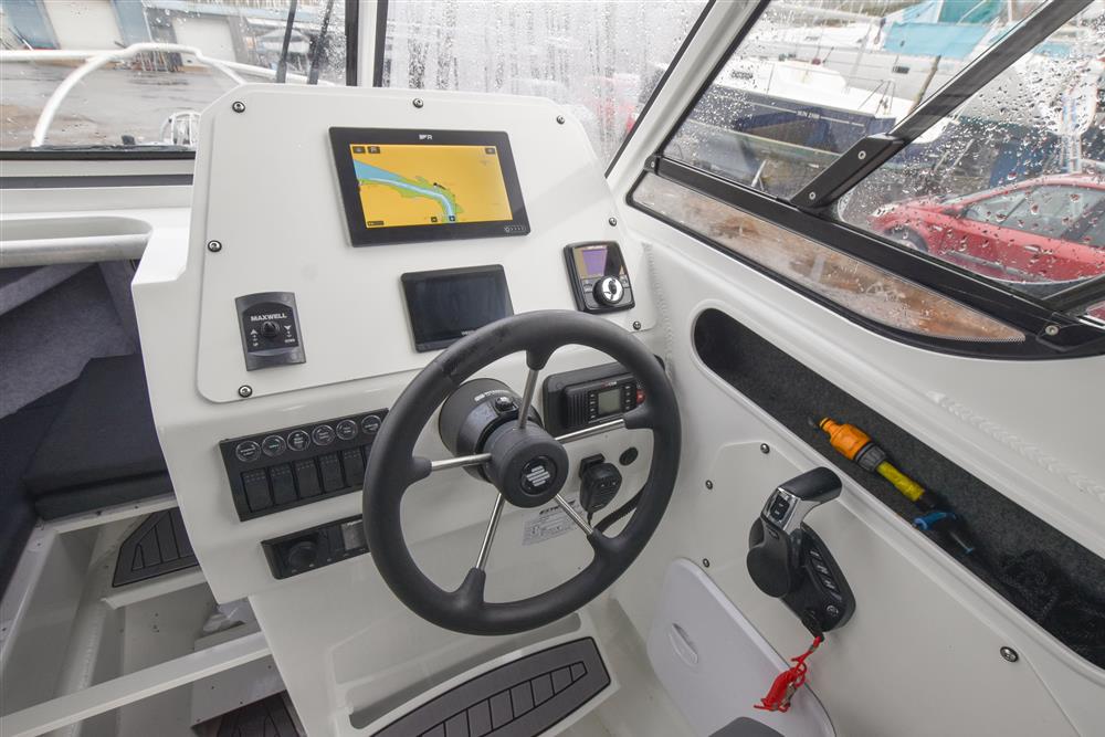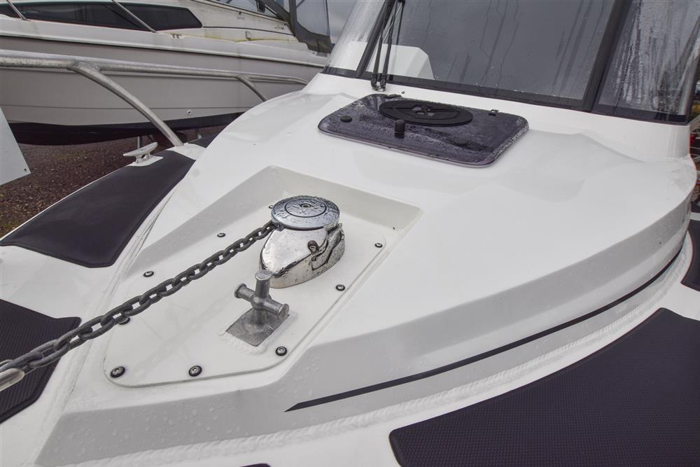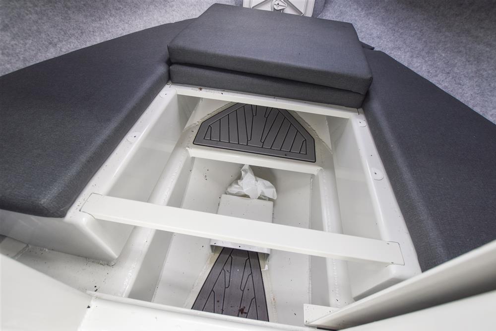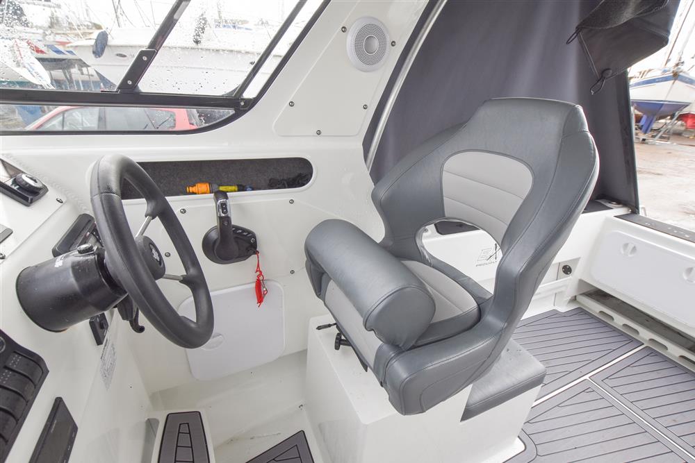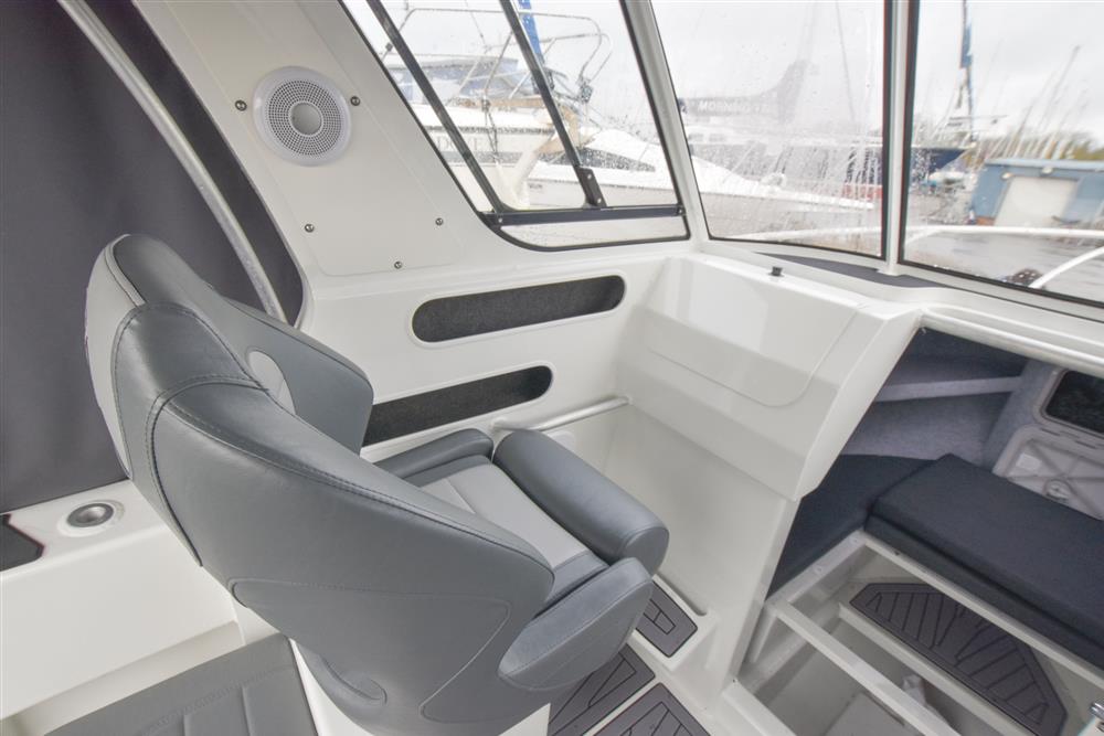 Up front there is a small cabin area for two, with an infill to create a simple double berth. Beneath the seating there is space for a toilet. Deck opening hatch gives plenty of light, ventilation and access to the foredeck. Deck opening hatch that provides plenty of light, ventilation and access to the foredeck. Moving aft into the wheelhouse, the hardtop provides good shelter and clear forward visibility. There are two adjustable bolster seats, with storage behind. The helm is to starboard with the engine controls and navigation equipment. Further aft in the open cockpit, there is plenty of storage in the side coamings and a large underfloor locker for gear and fish boxes. At the stern, there are bathing platforms either side of the outboard, with a boarding ladder to port for easy access in and out of the water.