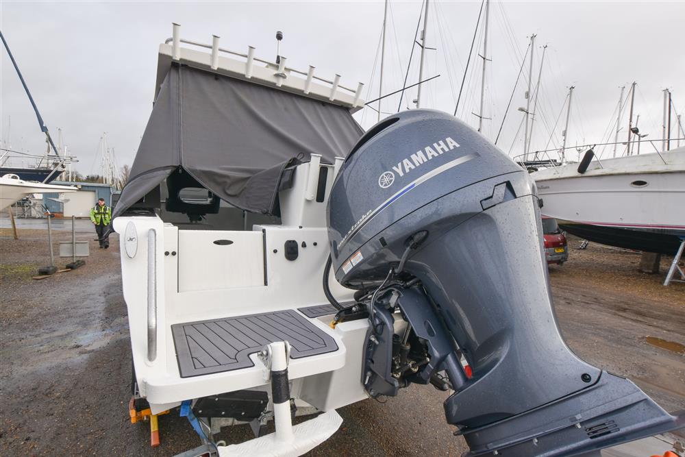 Located on the transom in an outboard well, is a 2022 Yamaha F150 XCA, four-cylinder, four stroke, 150 HP petrol outboard. Three bladed stainless steel propellor. Hydraulic steering. Single lever drie-by-wire engine throttle. Yamaha electronic instrument display. Approximately 180 litre underfloor fuel tank. Electric Zipwake trim tabs.