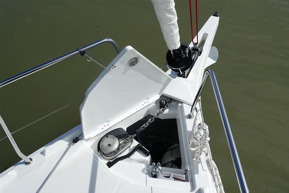 Four large hull ports, many opening ports (including 3 in the aft cabin) and flush deck hatches. 12V USB plugs in cabins. Indirect lighting, lamps on bulkheads, RA70N fusion player (radio/USB/Bluetooth) with saloon and cockpit speakers, upholstered bulkheads, shades and blinds for windows and ports, under floor wine storage, clock and barometer, extra porthole in aft cabin.
