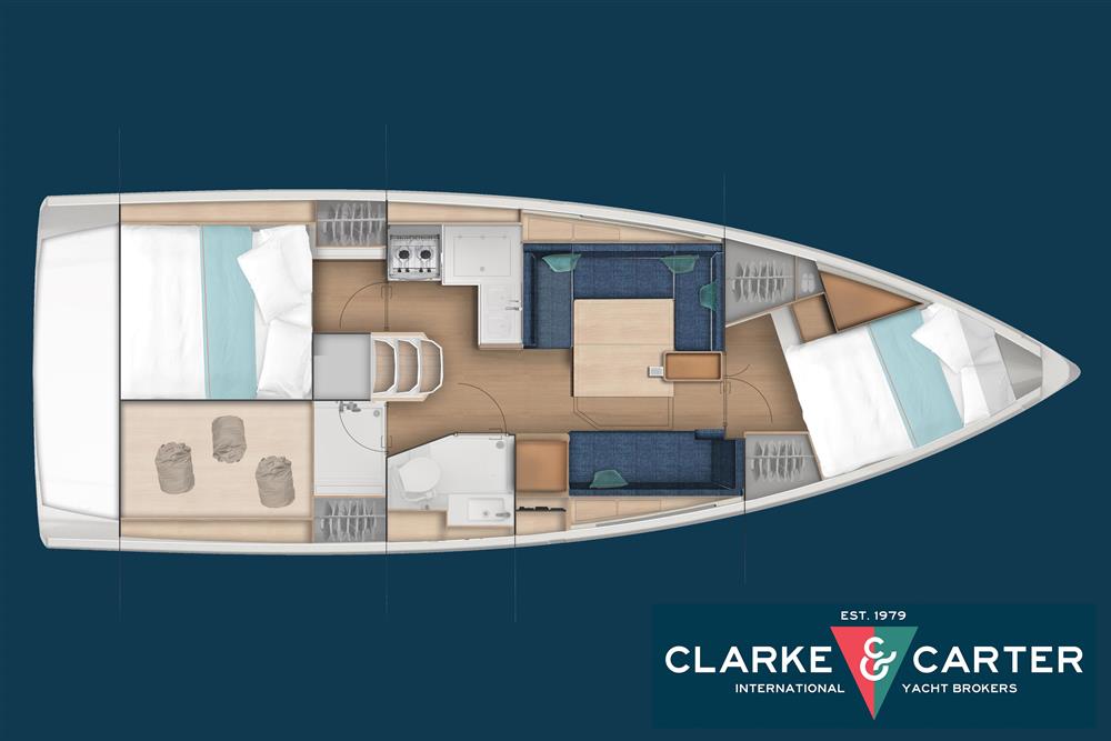 White grp hull with style stripes. Full length hull chine with negative angle and flying bow to extend the waterline and prevent slamming. The large beam at the waterline gives a shallow hull (less wetted surface are), more buoyancy forward and a more powerful sailing hull shape. White grp coachroof with moulded non skid decks. Walk around side decks, unique to Jeanneau. Self draining cockpit and anchor well. Integrated bowsprit with central anchor roller, Code 0 and asymmetric tack points. Teak to cockpit seats, fold down swim platform and cockpit sole. Twin wheels to twin rudders and self aligning rudder bearings. Cast iron keels. Flush deck hatches.