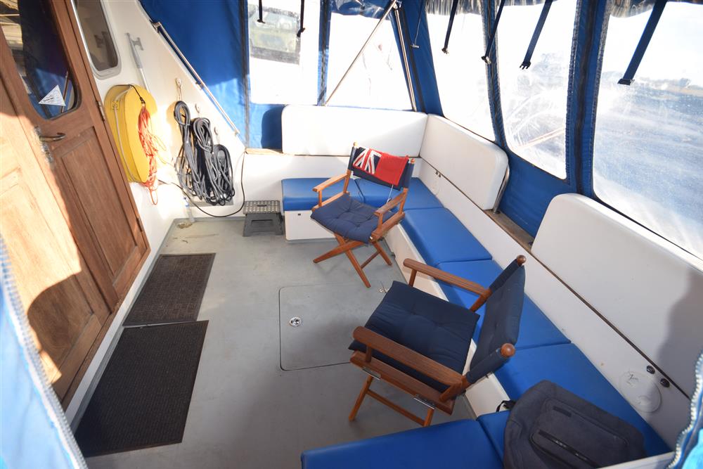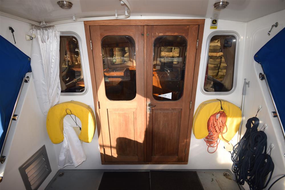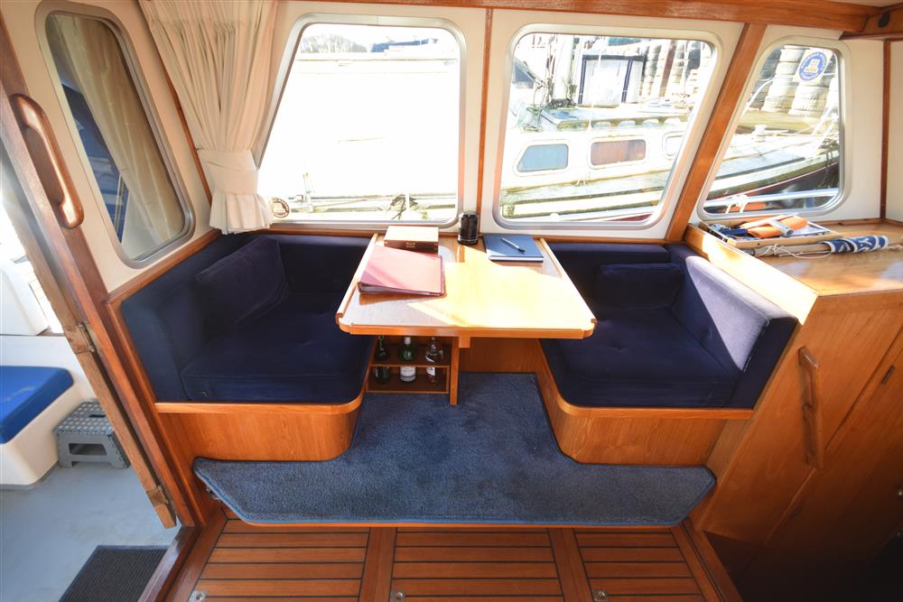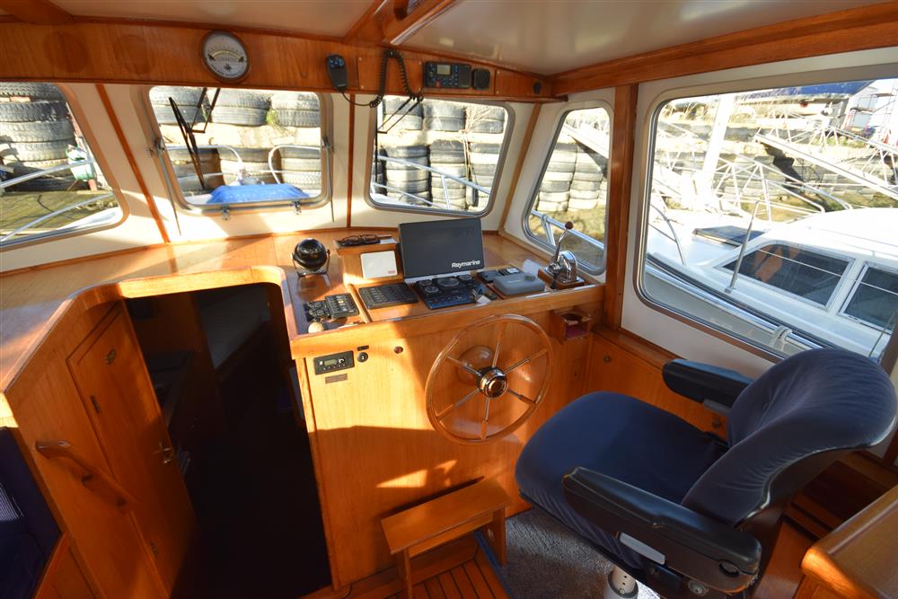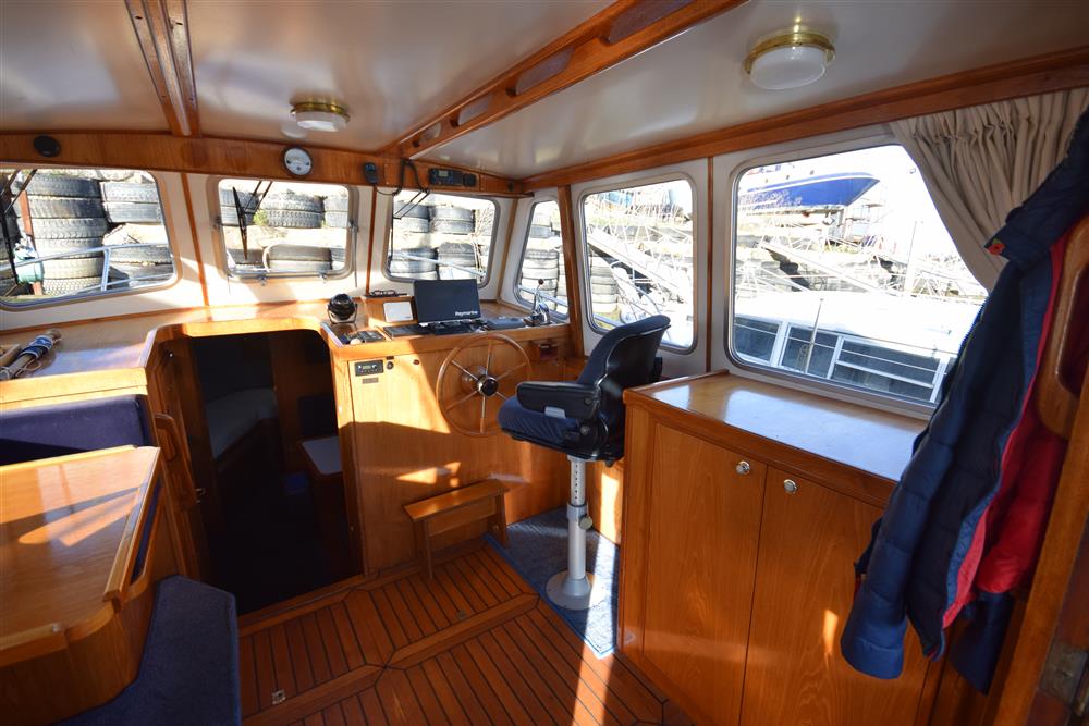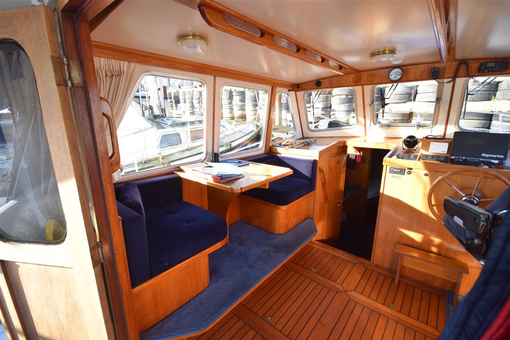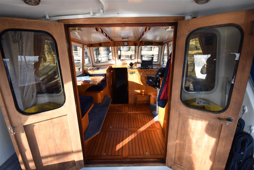 Forward you will find a cabin with a V berth arrangement with infill, there is hanging stowage, LED reading lights and a hatch for light and ventilation. Coming aft is the galley and dinette. The galley to port is equipped with a modern two burner gas hob, large fridge and a stainless steel sink with hot and cold pressurised water. There is ample stowage for crockery and utensils in the galley area. To starboard is the dinette, there is a wall mounted flat screen TV, twin 240v outlet, comfortable C shaped seating for six adults around the large dining table. The dinette also converts into a large double berth. Further aft to port is the heads with an electric sea toilet, vanity and stowage. Up the companionway you will find the fully enclosed wheelhouse that offers excellent 360 degree visibility around the vessel. To starboard is the helm with a comfortable, height adjustable, captains chair offering easy access to the controls and the array of modern navigation equipment. There is room to port for paper charts or you could use the table further aft. Also to port is a stowage cabinet with another good flat surface to be used for navigation or you could have a television to service the upper dining area. There are wooden hand rails throughout the wheelhouse and fettled edges on the flat surfaces again pointing towards this boat's capability of taking rough seas in comfort and safety. Under the sole boards of the wheelhouse is the insulated engine bay, there is easy access to serviceable equipment. At the entrance to the wheelhouse is hanging space for wet weather gear. Through the double wheelhouse doors you enter the cockpit, with high bulwarks, extended superstructure and canopy you are well protected from the elements. The cockpit has fixed seating with cushions in a C shape along with mooring line and safety equipment stowage. Again there are stainless steel grab rails throughout. Under the cockpit is a large lazarette for further stowage.