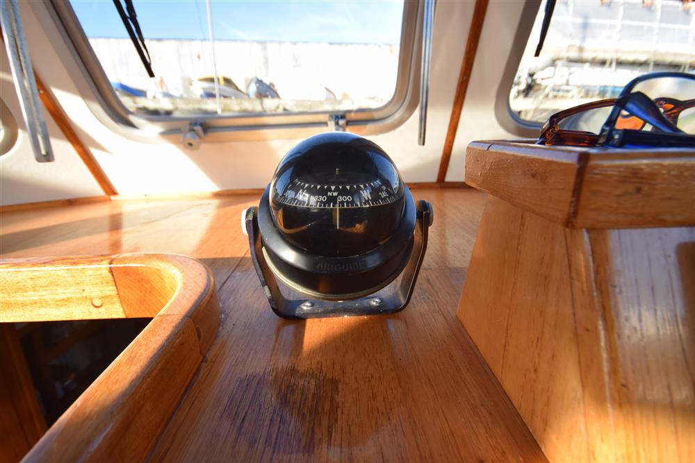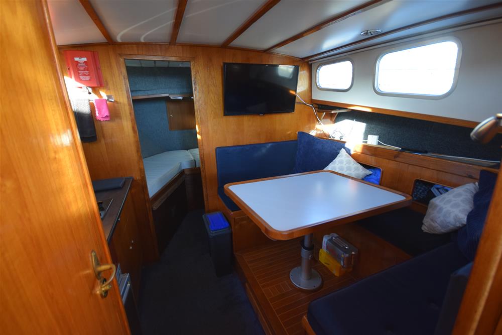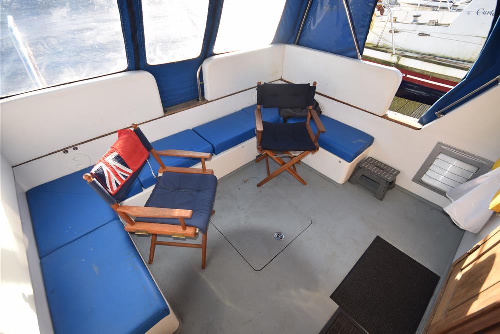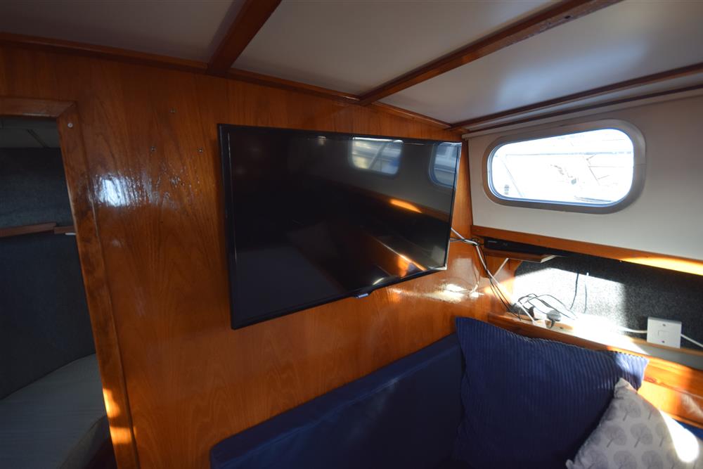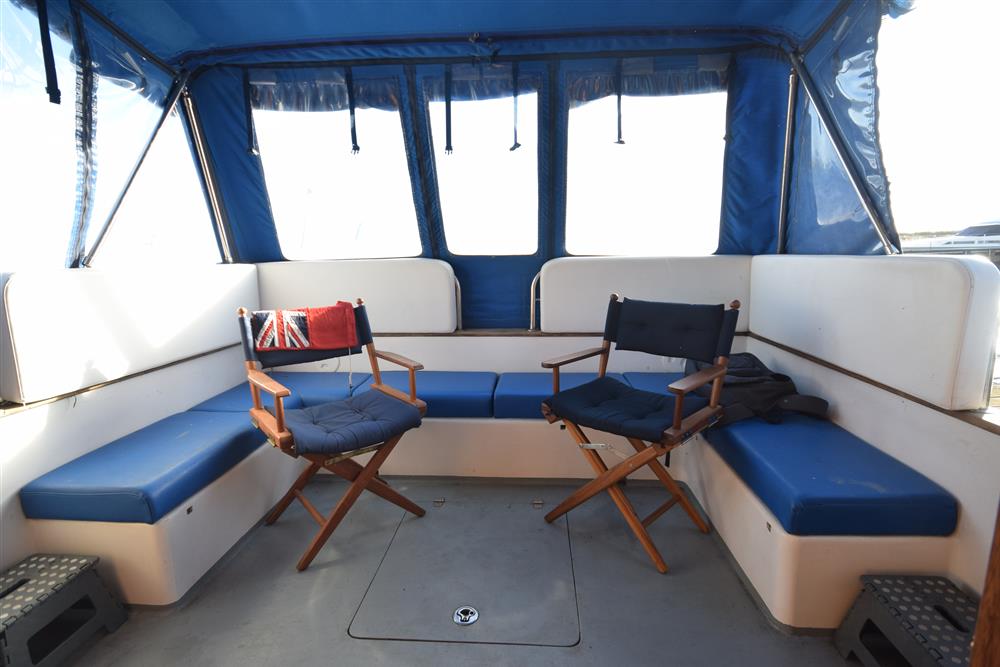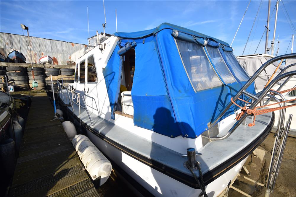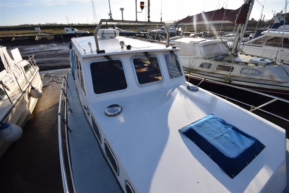 Forward you will find a cabin with a V berth arrangement with infill, there is hanging stowage, LED reading lights and a hatch for light and ventilation. Coming aft is the galley and dinette. The galley to port is equipped with a modern two burner gas hob, large fridge and a stainless steel sink with hot and cold pressurised water. There is ample stowage for crockery and utensils in the galley area. To starboard is the dinette, there is a wall mounted flat screen TV, twin 240v outlet, comfortable C shaped seating for six adults around the large dining table. The dinette also converts into a large double berth. Further aft to port is the heads with an electric sea toilet, vanity and stowage. Up the companionway you will find the fully enclosed wheelhouse that offers excellent 360 degree visibility around the vessel. To starboard is the helm with a comfortable, height adjustable, captains chair offering easy access to the controls and the array of modern navigation equipment. There is room to port for paper charts or you could use the table further aft. Also to port is a stowage cabinet with another good flat surface to be used for navigation or you could have a television to service the upper dining area. There are wooden hand rails throughout the wheelhouse and fettled edges on the flat surfaces again pointing towards this boat's capability of taking rough seas in comfort and safety. Under the sole boards of the wheelhouse is the insulated engine bay, there is easy access to serviceable equipment. At the entrance to the wheelhouse is hanging space for wet weather gear. Through the double wheelhouse doors you enter the cockpit, with high bulwarks, extended superstructure and canopy you are well protected from the elements. The cockpit has fixed seating with cushions in a C shape along with mooring line and safety equipment stowage. Again there are stainless steel grab rails throughout. Under the cockpit is a large lazarette for further stowage.