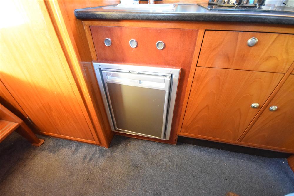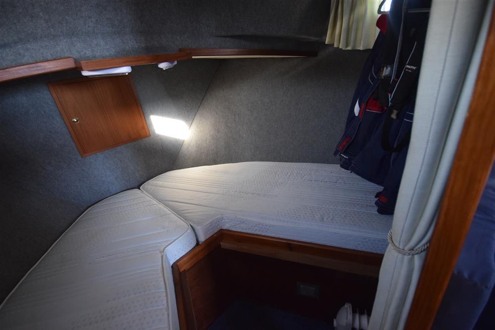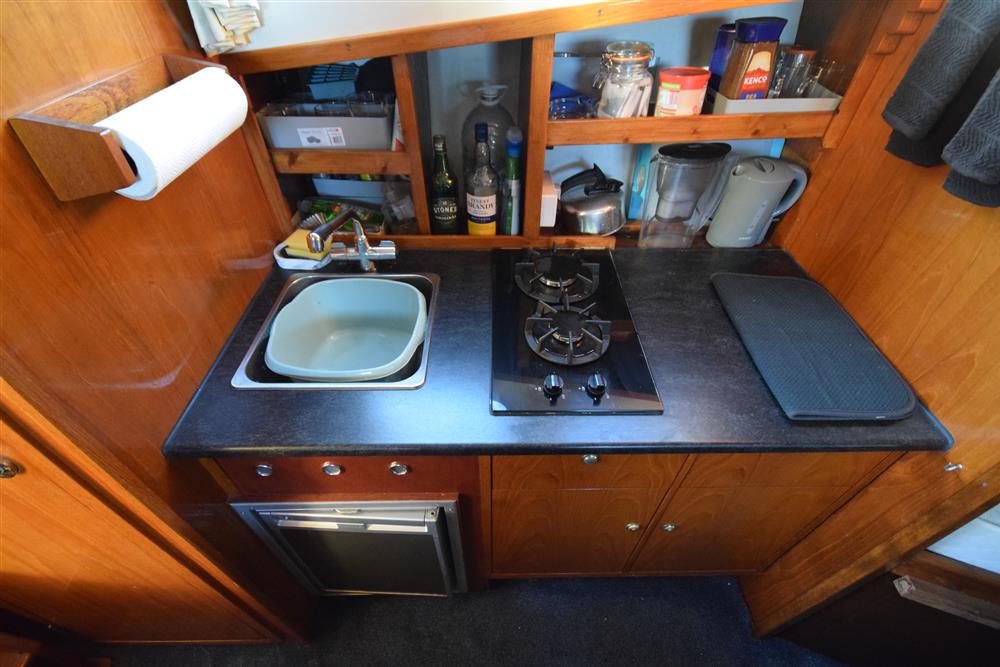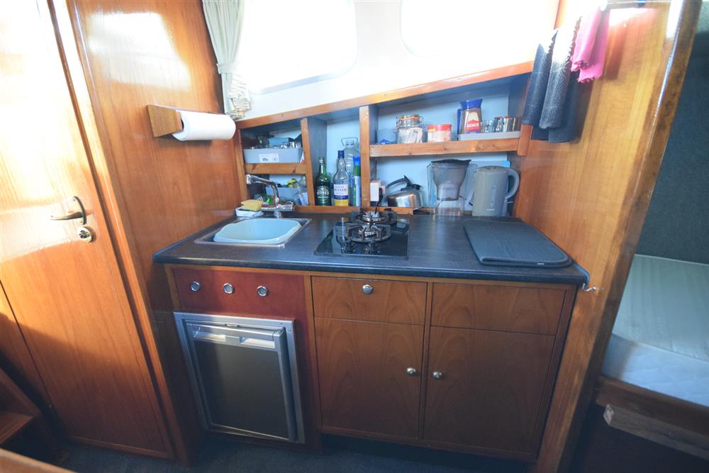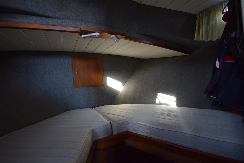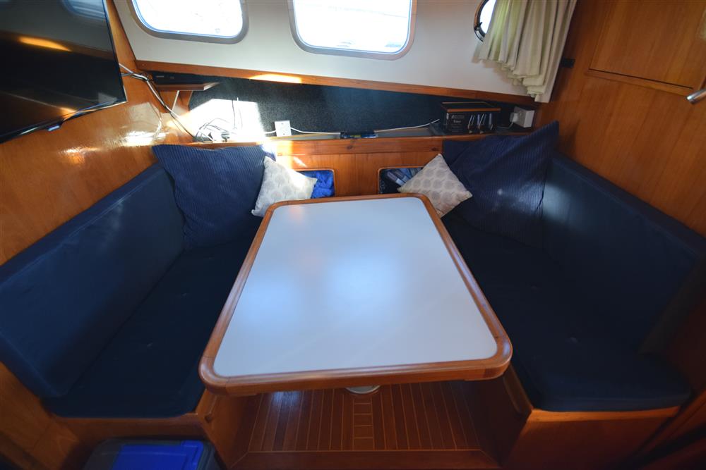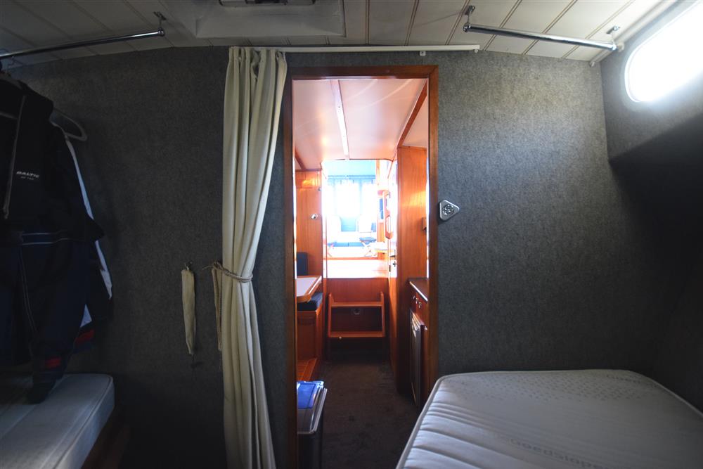 Forward you will find a cabin with a V berth arrangement with infill, there is hanging stowage, LED reading lights and a hatch for light and ventilation. Coming aft is the galley and dinette. The galley to port is equipped with a modern two burner gas hob, large fridge and a stainless steel sink with hot and cold pressurised water. There is ample stowage for crockery and utensils in the galley area. To starboard is the dinette, there is a wall mounted flat screen TV, twin 240v outlet, comfortable C shaped seating for six adults around the large dining table. The dinette also converts into a large double berth. Further aft to port is the heads with an electric sea toilet, vanity and stowage. Up the companionway you will find the fully enclosed wheelhouse that offers excellent 360 degree visibility around the vessel. To starboard is the helm with a comfortable, height adjustable, captains chair offering easy access to the controls and the array of modern navigation equipment. There is room to port for paper charts or you could use the table further aft. Also to port is a stowage cabinet with another good flat surface to be used for navigation or you could have a television to service the upper dining area. There are wooden hand rails throughout the wheelhouse and fettled edges on the flat surfaces again pointing towards this boat's capability of taking rough seas in comfort and safety. Under the sole boards of the wheelhouse is the insulated engine bay, there is easy access to serviceable equipment. At the entrance to the wheelhouse is hanging space for wet weather gear. Through the double wheelhouse doors you enter the cockpit, with high bulwarks, extended superstructure and canopy you are well protected from the elements. The cockpit has fixed seating with cushions in a C shape along with mooring line and safety equipment stowage. Again there are stainless steel grab rails throughout. Under the cockpit is a large lazarette for further stowage.