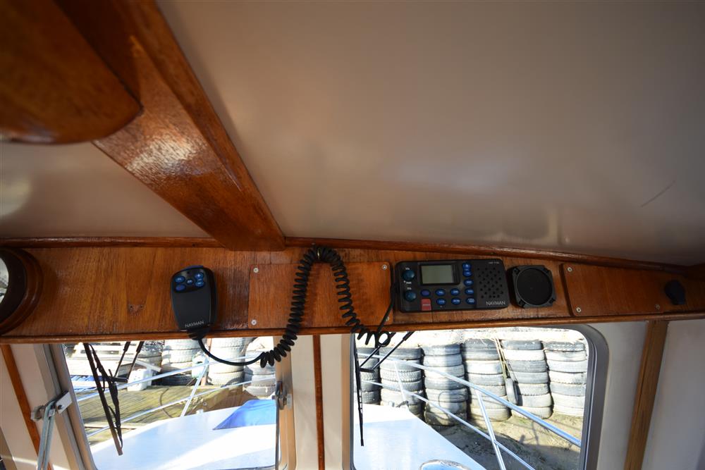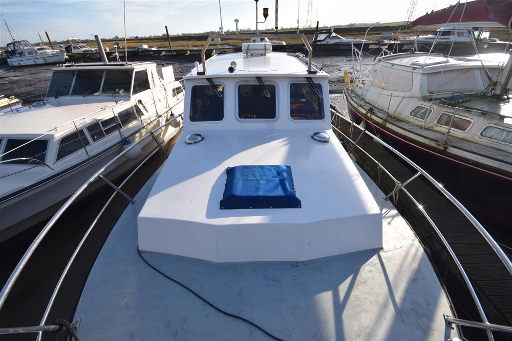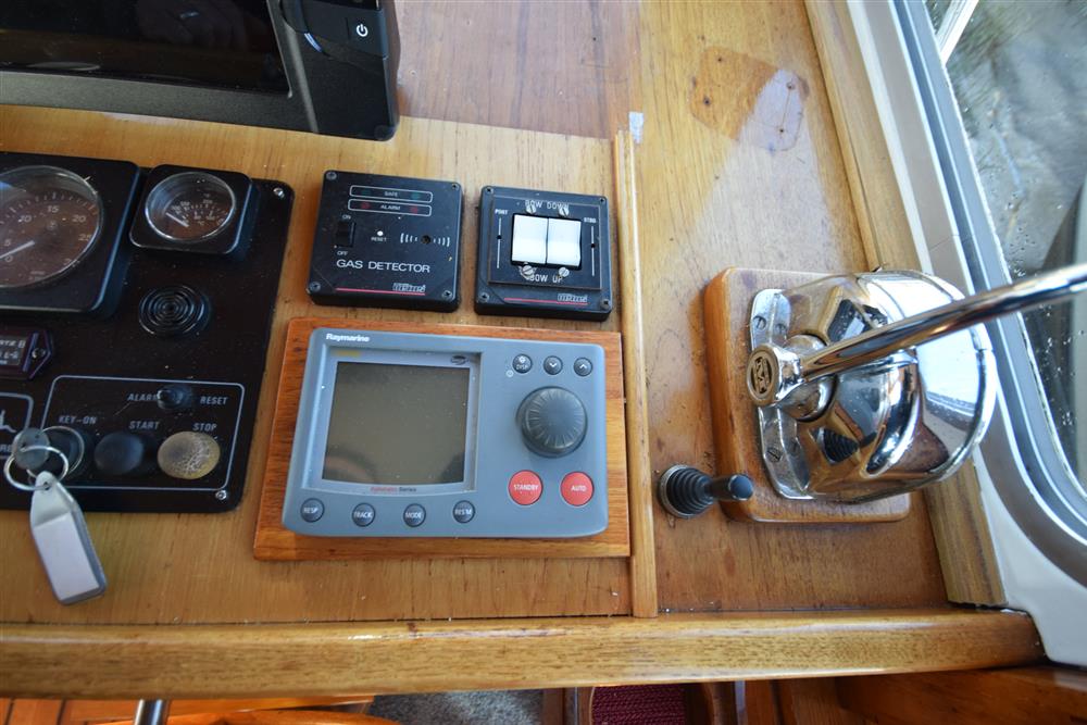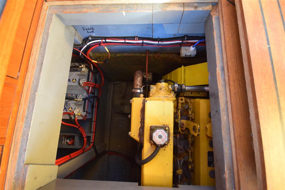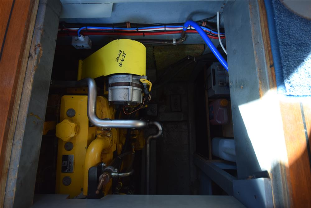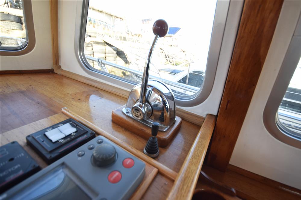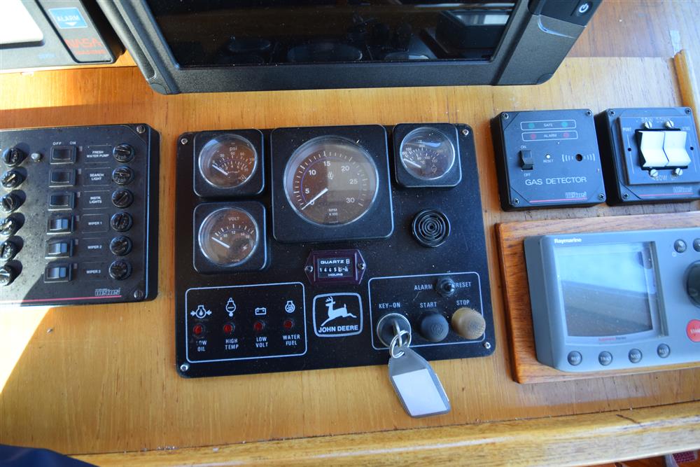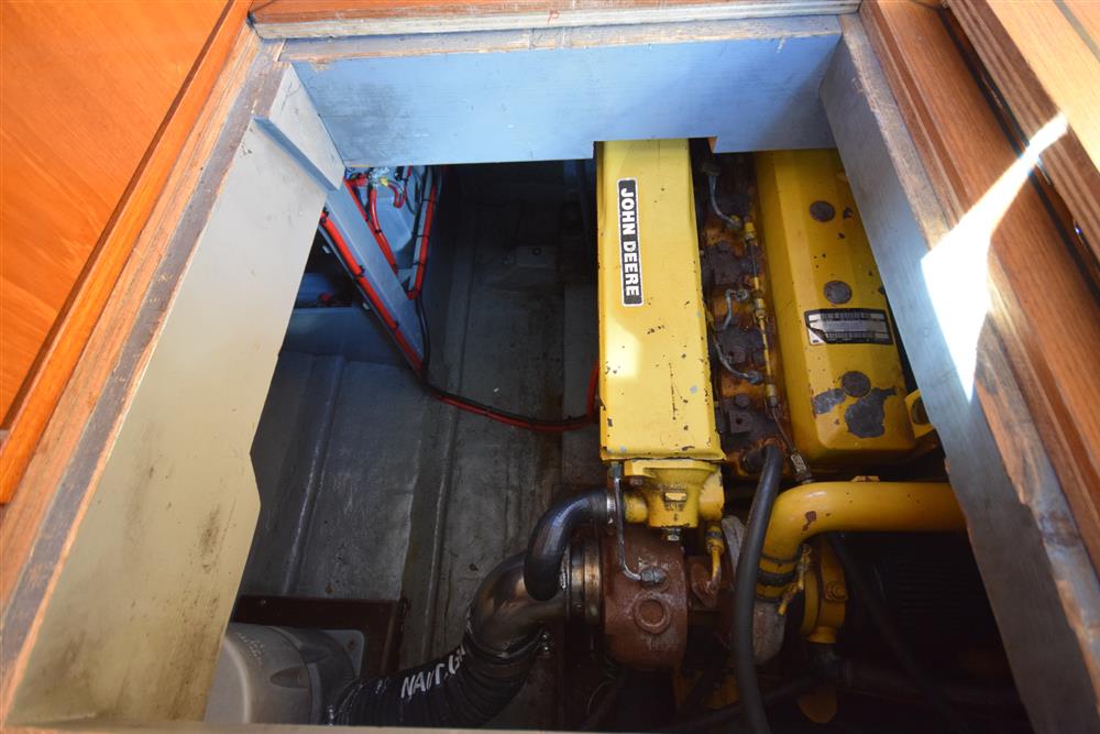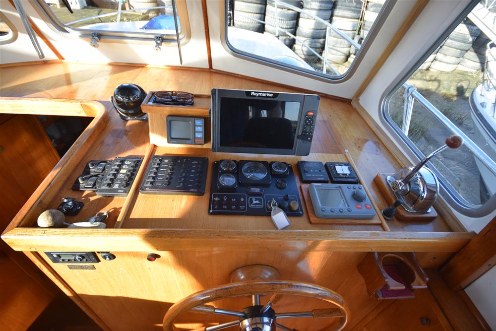 Under the wheelhouse in an insulated engineering space is a single John Deere turbo diesel engine producing approximately 270hp, indirectly cooled via heat exchanger, powering a five bladed bronze propeller via shaft drive. Single lever control at the helm. She should reach a maximum speed of approximately 15 knots but will cruise comfortably at 10-12 knots consuming approximately 15 litres of fuel per hour. Engine hours are approximately 1450 since 1990 when it was installed and has most recently been serviced in April 2025. Visually, it appears to have been well maintained since installation. Also in the engineering space you will find the 700 litre aluminium fuel tank. This should offer a range of approximately 460 nautical miles at 10 knots. There is also a bow thruster, electric anchor windlass and trim tabs, all with controls at the helm.