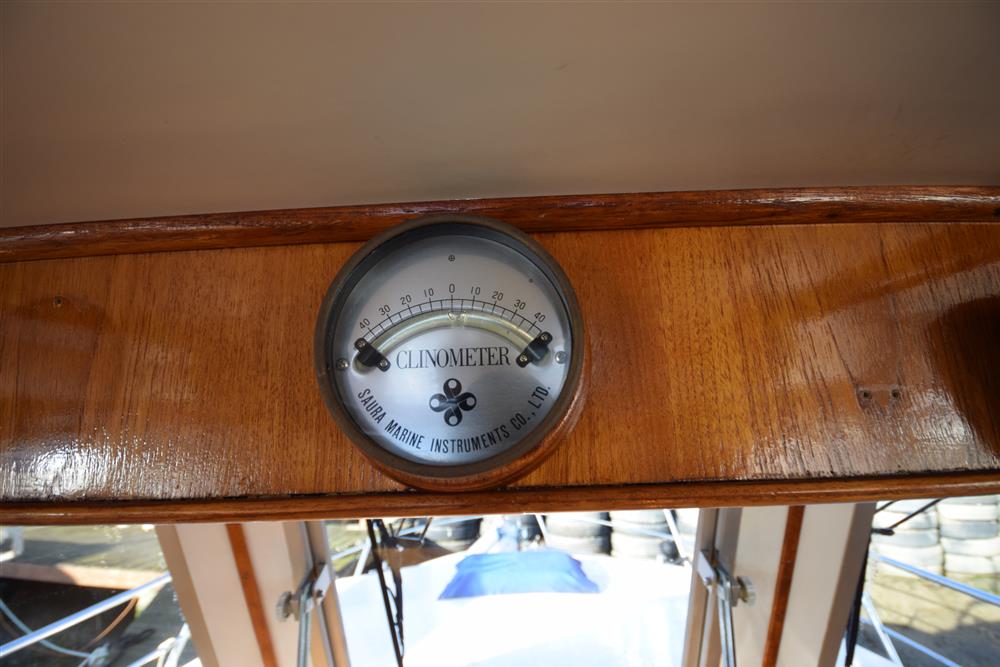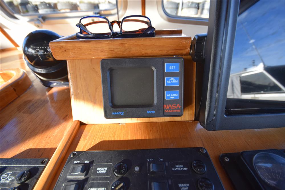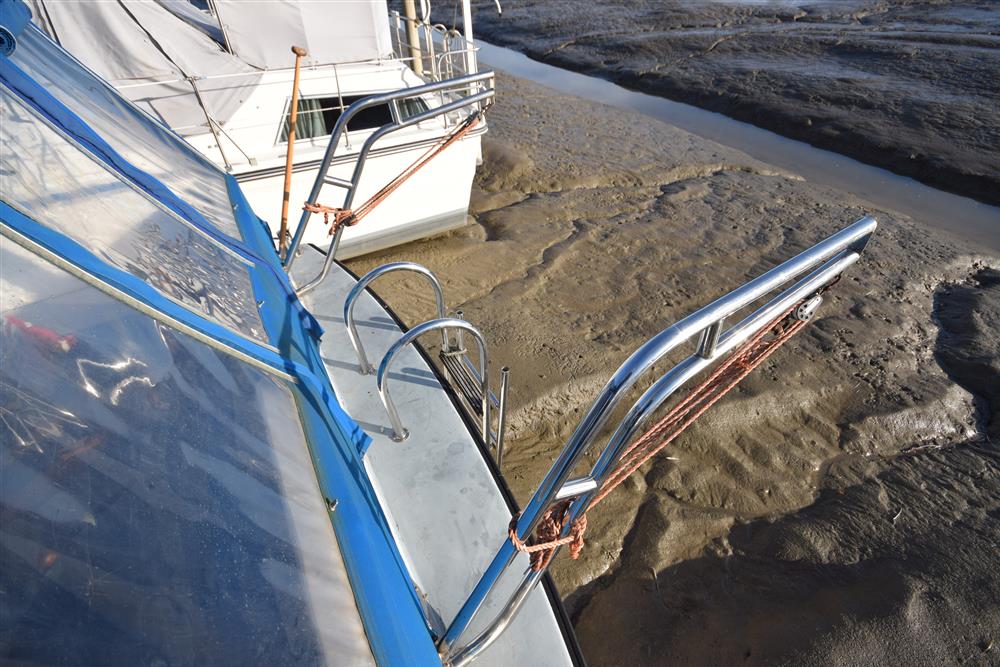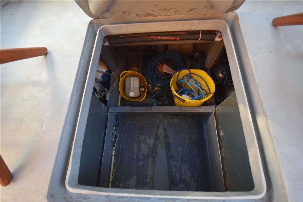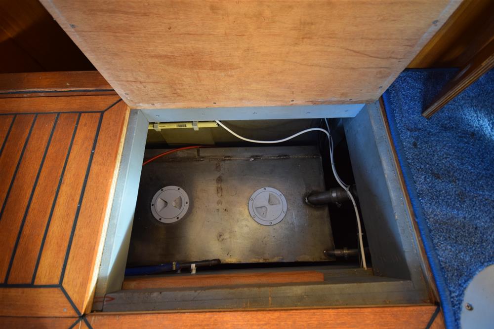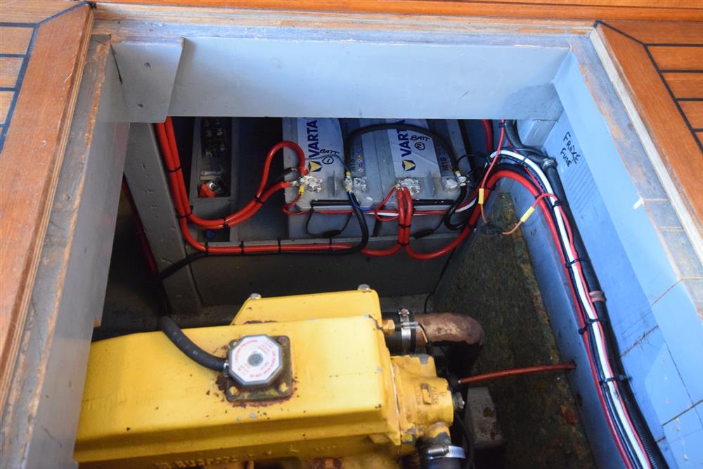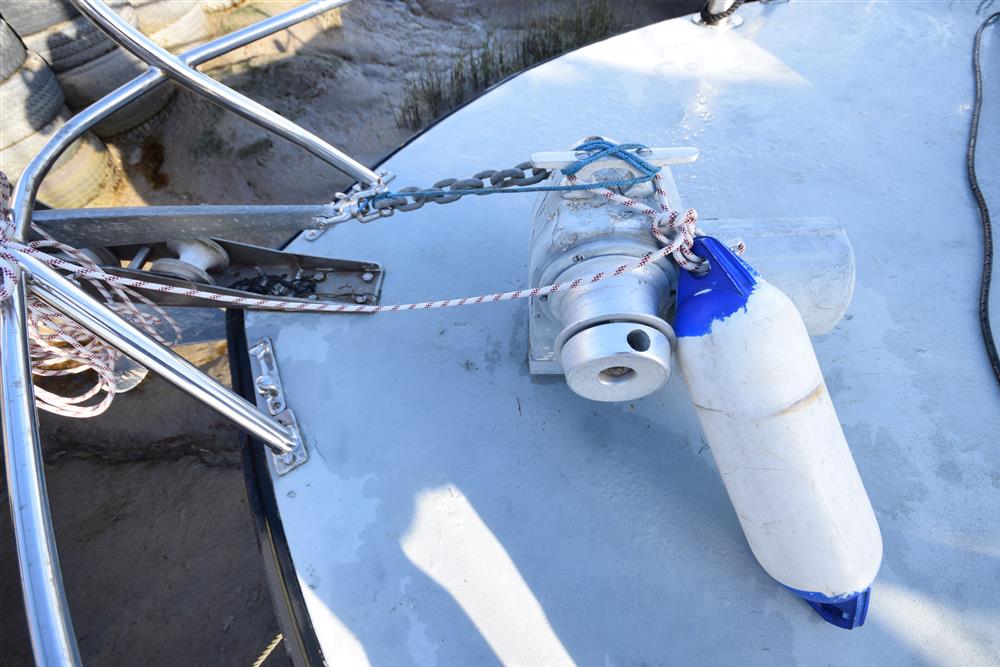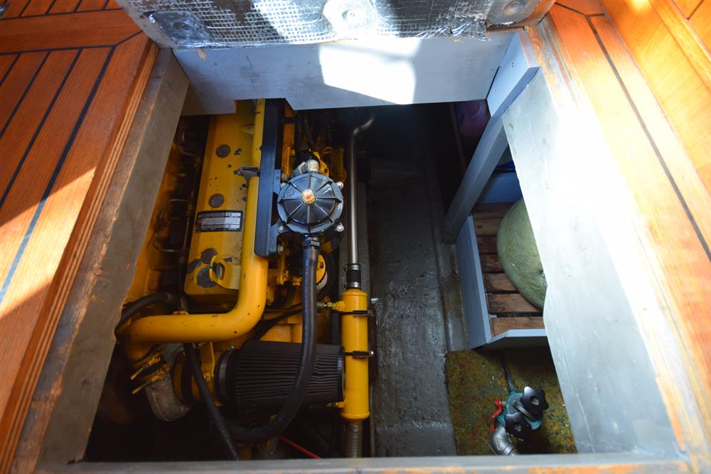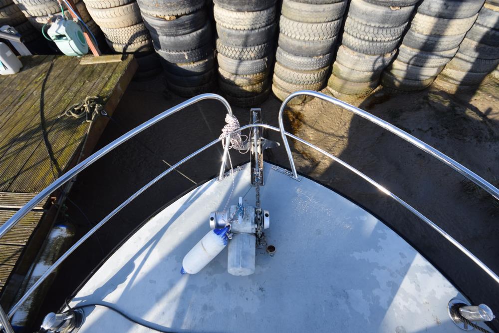 Under the wheelhouse in an insulated engineering space is a single John Deere turbo diesel engine producing approximately 270hp, indirectly cooled via heat exchanger, powering a five bladed bronze propeller via shaft drive. Single lever control at the helm. She should reach a maximum speed of approximately 15 knots but will cruise comfortably at 10-12 knots consuming approximately 15 litres of fuel per hour. Engine hours are approximately 1450 since 1990 when it was installed and has most recently been serviced in April 2025. Visually, it appears to have been well maintained since installation. Also in the engineering space you will find the 700 litre aluminium fuel tank. This should offer a range of approximately 460 nautical miles at 10 knots. There is also a bow thruster, electric anchor windlass and trim tabs, all with controls at the helm.